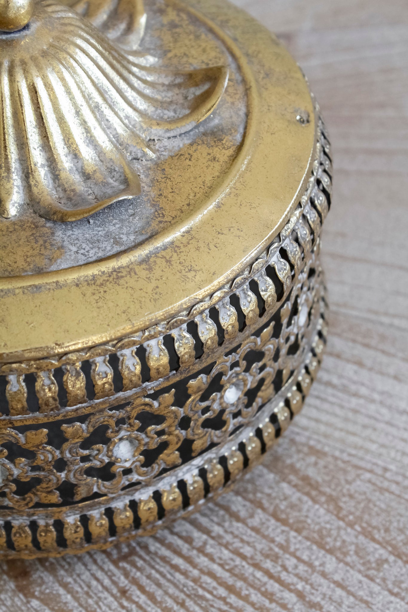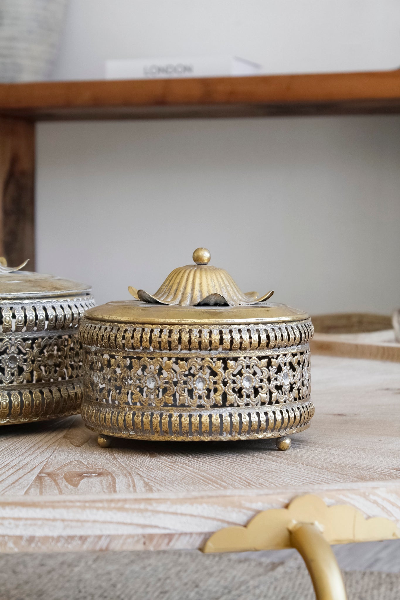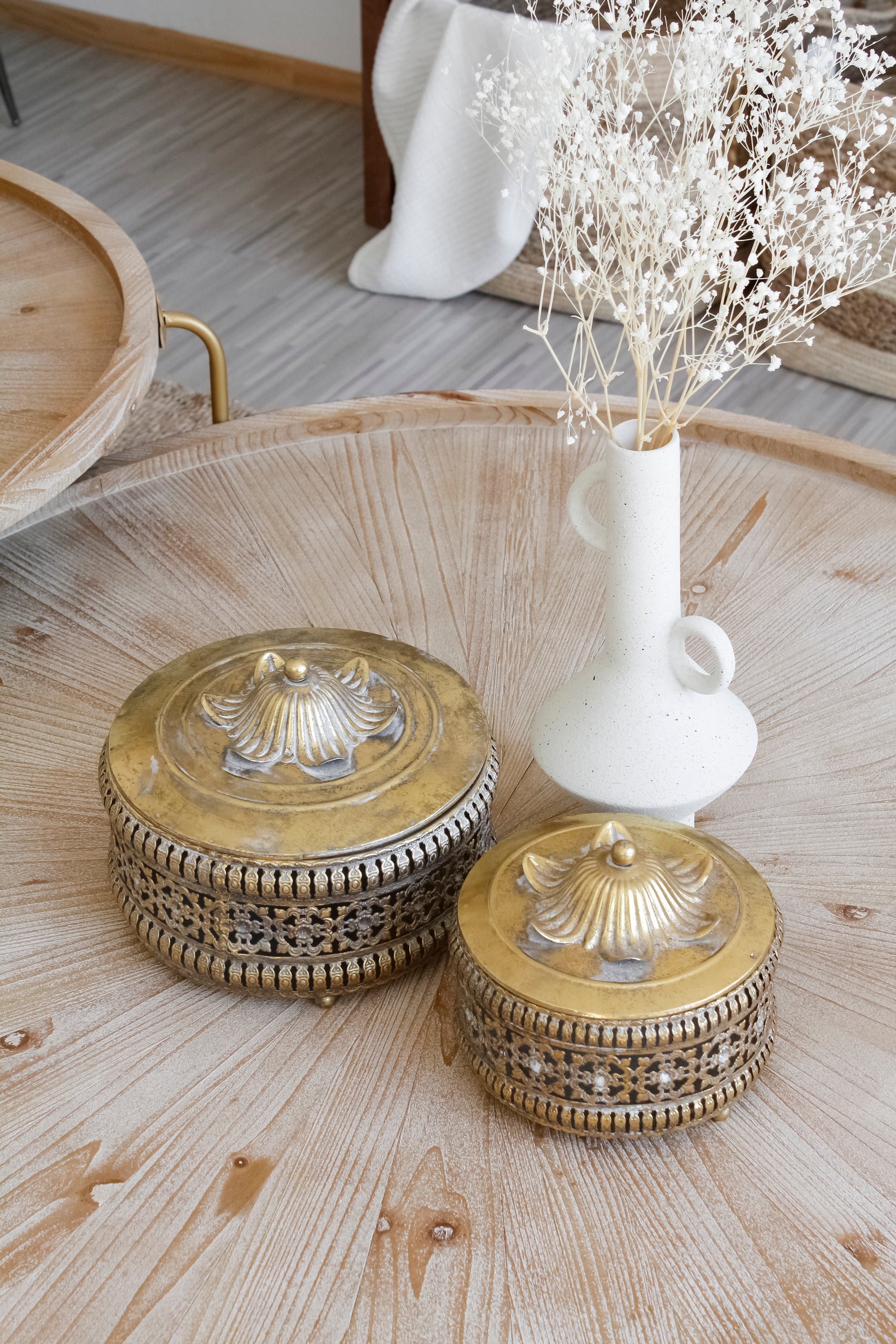 Caja redonda de metal color dorado y con diseño de calado ornamental antiguo, disponible en dos tamaños. Un modelo que combina lo funcional con lo estético, aportando un look elegante y sofisticado. Es perfecta para montarla en tu mesa de centro, arrimo de entrada o en conjunto en una repisa para decorar, o utilizarla como joyero u organizador de baño. Un modelo precioso y multifuncional!