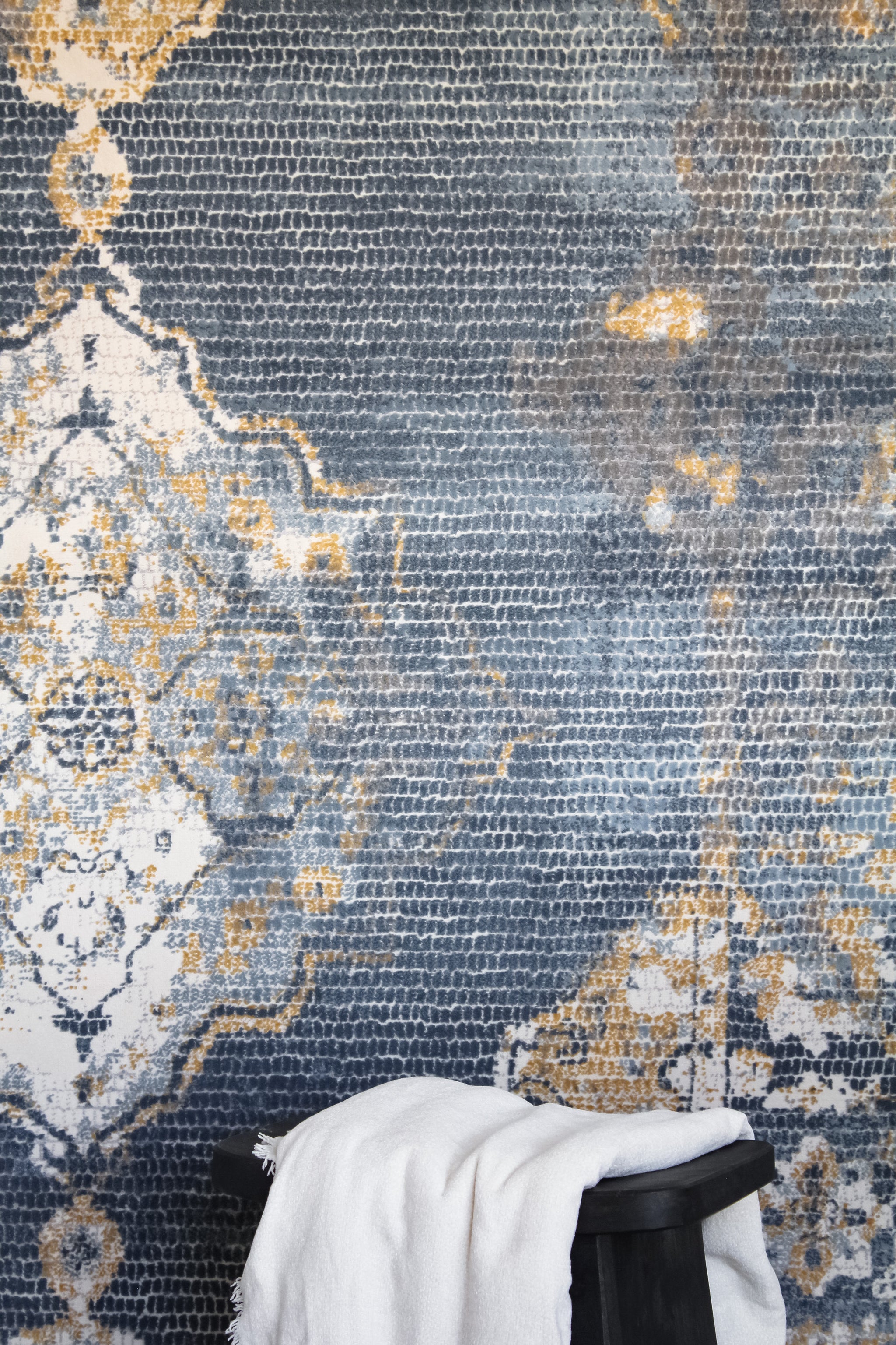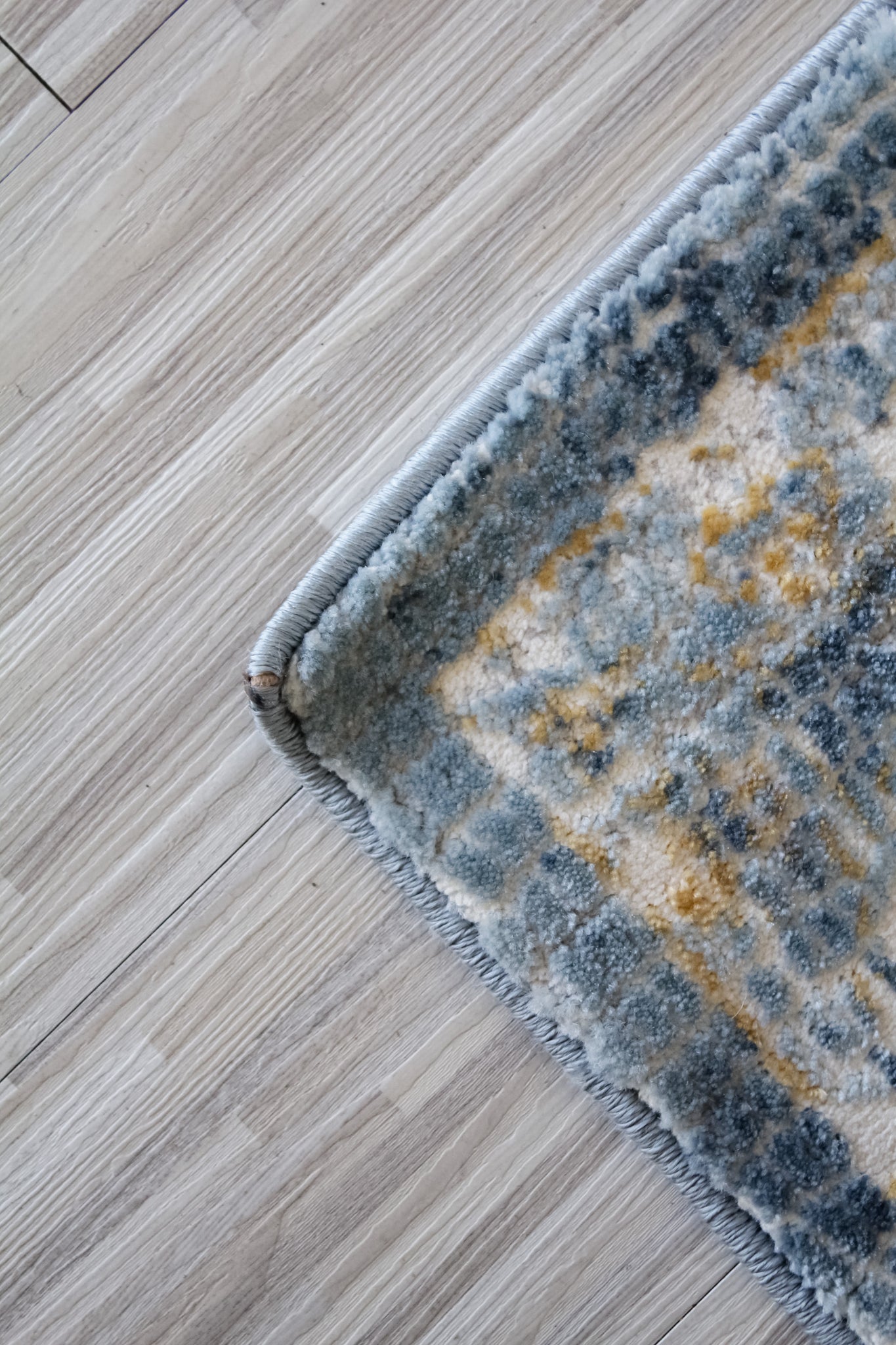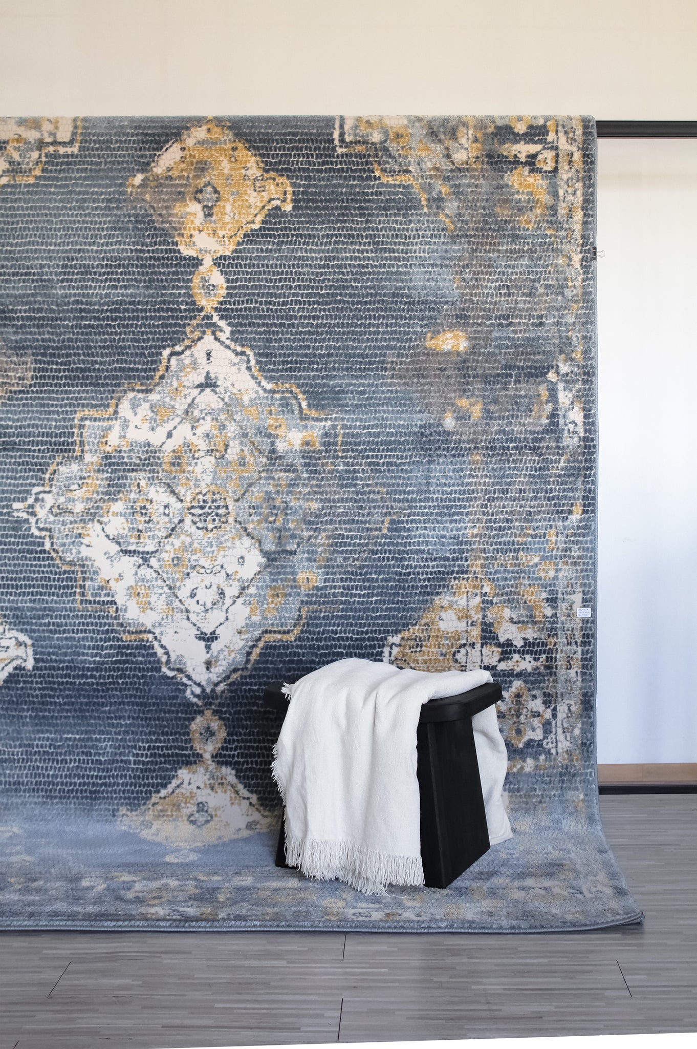 Si lo que necesitas es iluminar tu living y dar un toque de color el modelo de alfombra Antonella es el indicado. Una combinación preciosa entre el celeste y el dorado.