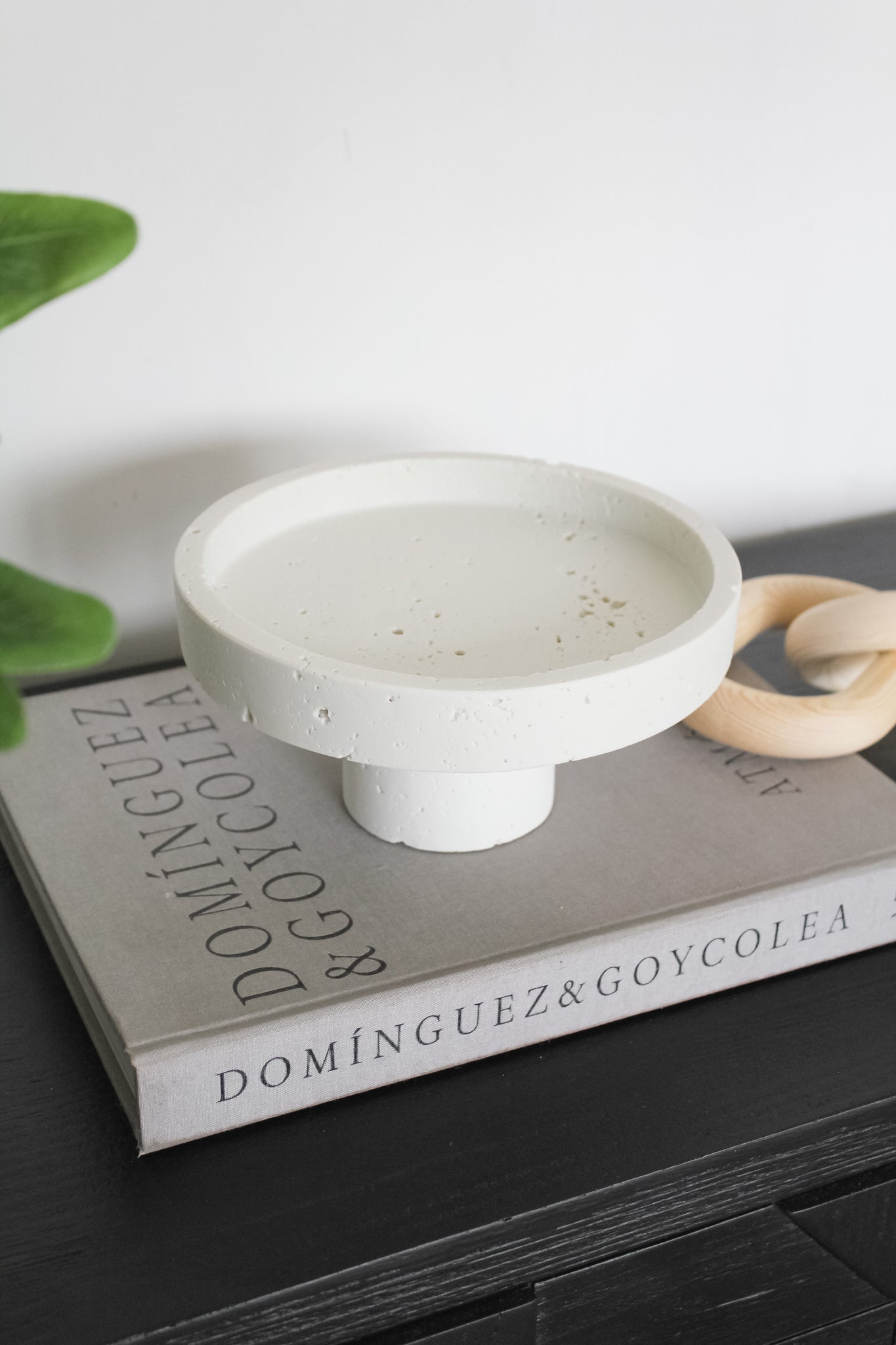 Bandeja redonda de piedra en color blanco. Un diseño sobrio y elegante, que ilumina y destaca cualquier rincón donde lo pongas. Te recomendamos montarlo con un velón grande de tres mechas como centro de mesa o en un arrimo, de cualquier forma llamará la atención a primera vista.