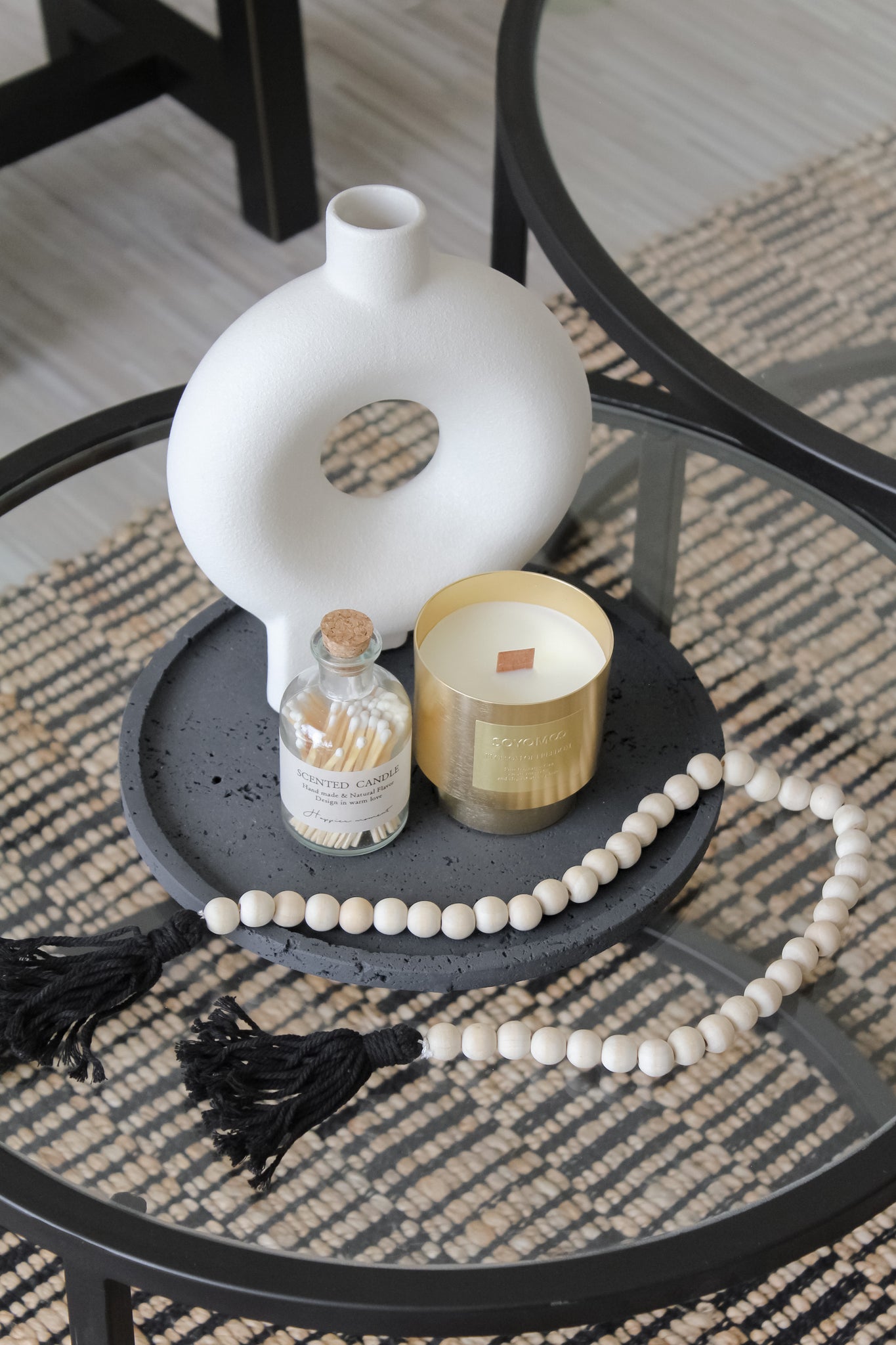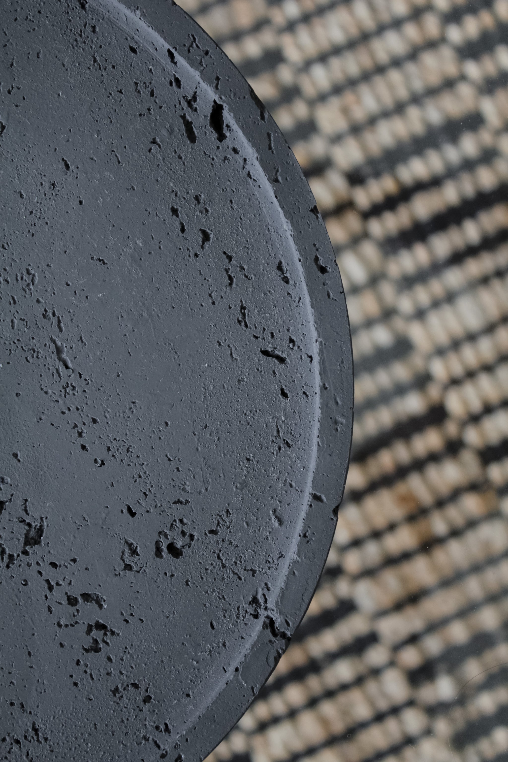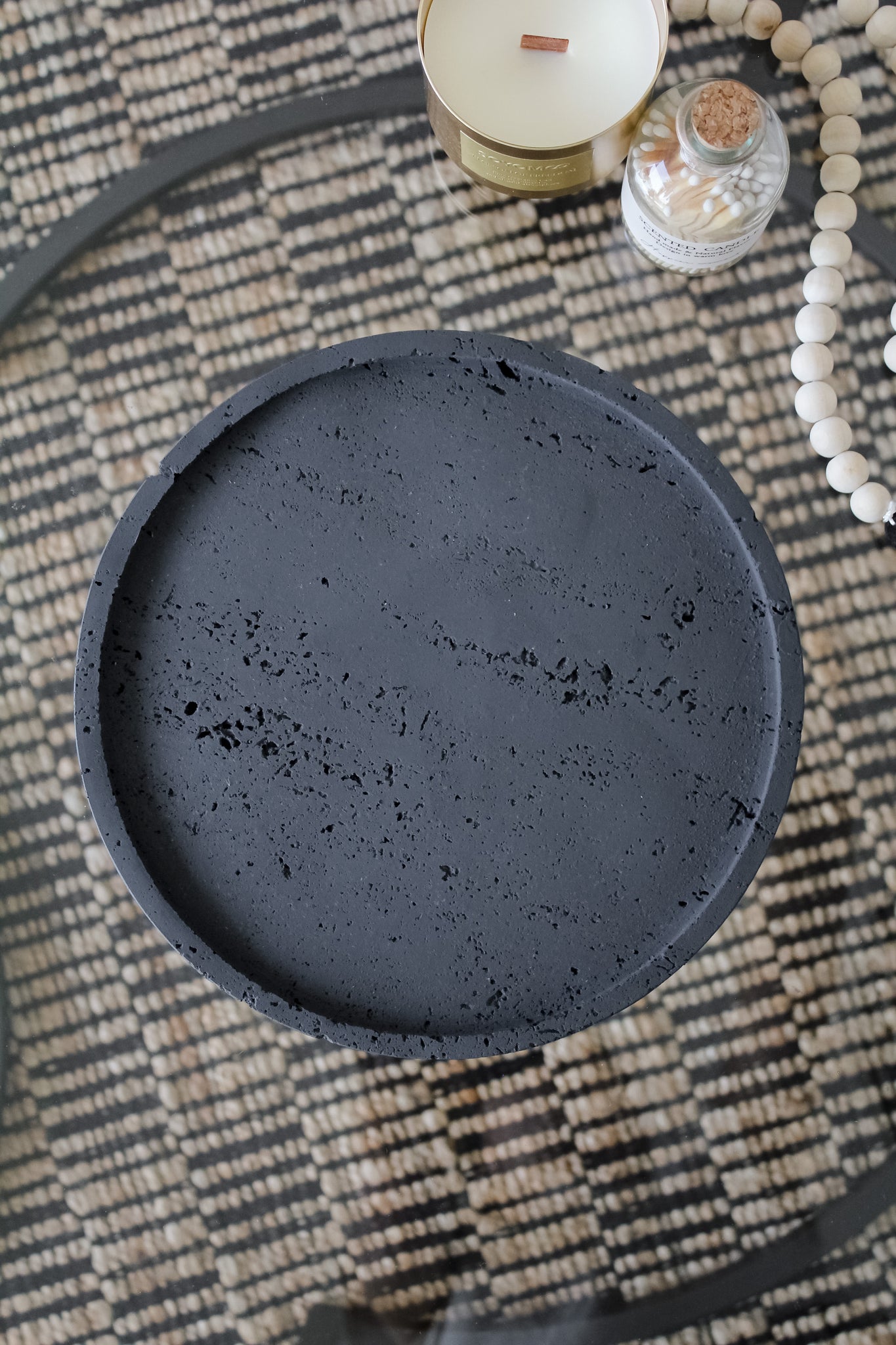 Bandeja redonda de piedra en color negro. De diseño minimalista y textura que imita la piedra porosa, esta bandeja entrega un aire natural que se funde en cualquier estilo de decoración. Puedes montarla como centro de mesa con un jarrón o escultura, una vela y una borla para darle movimiento, y el espacio se verá increíble.