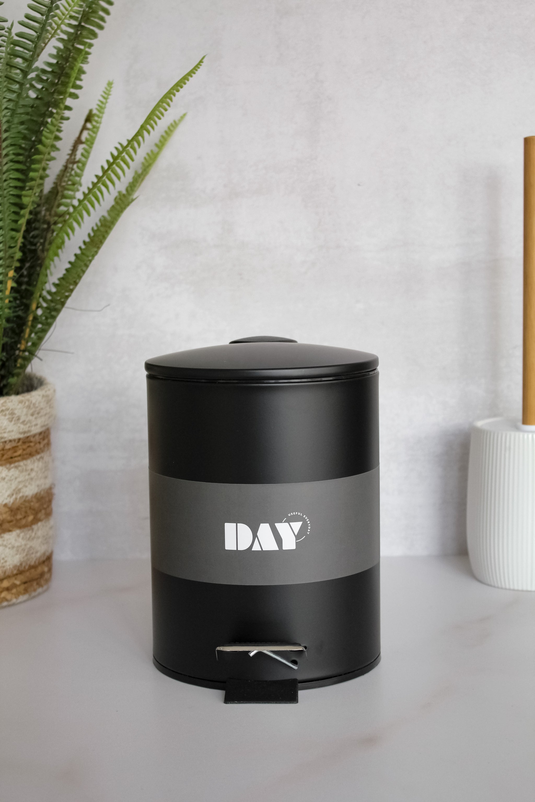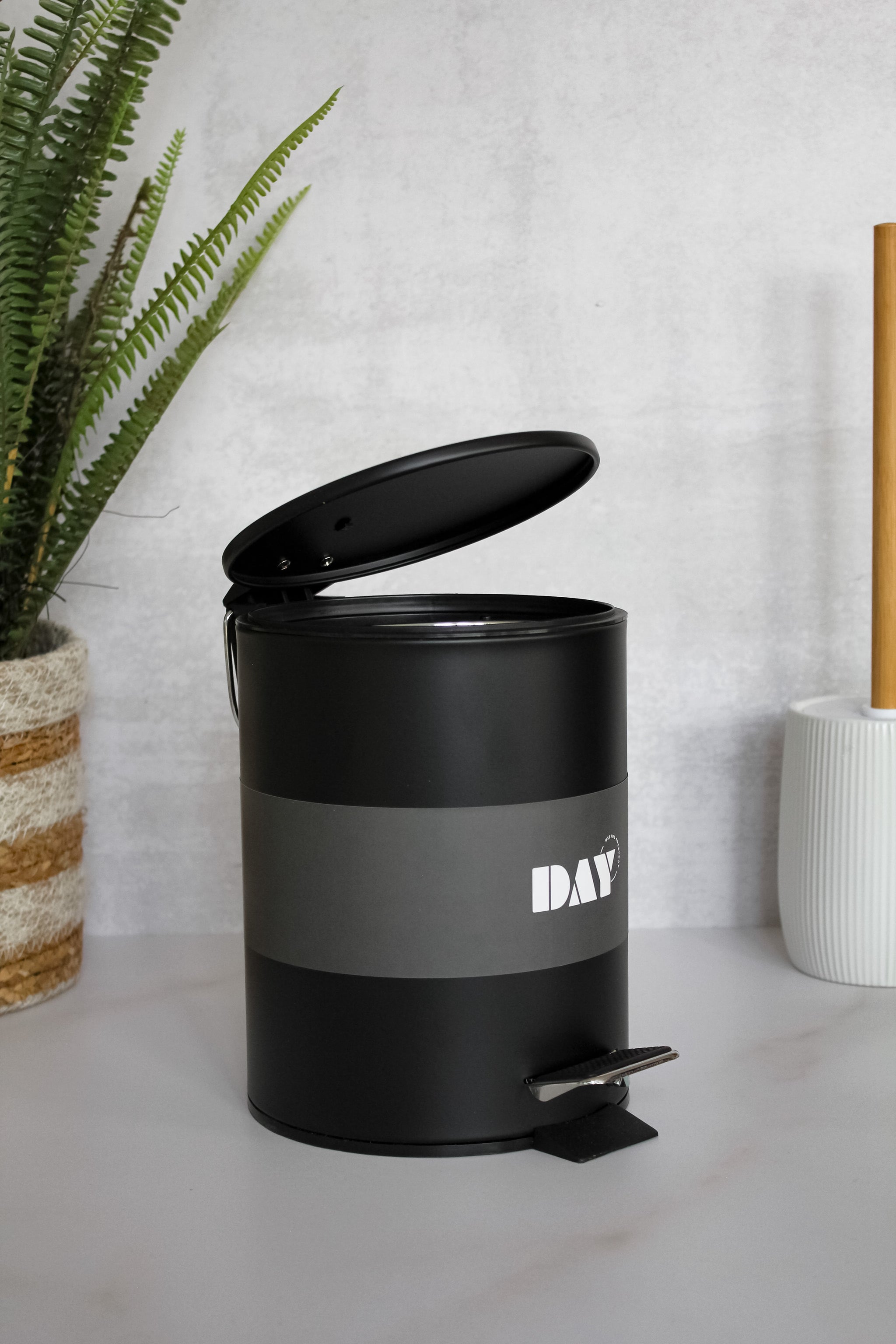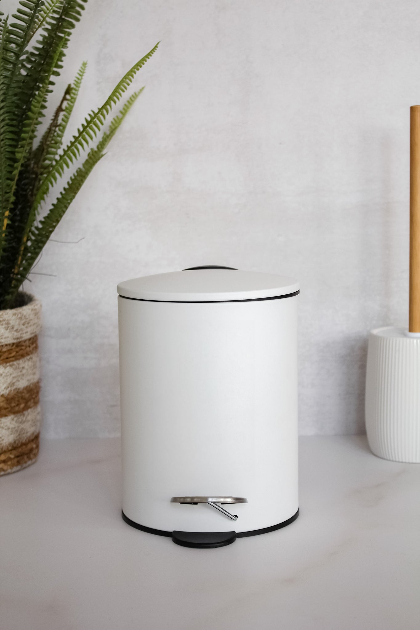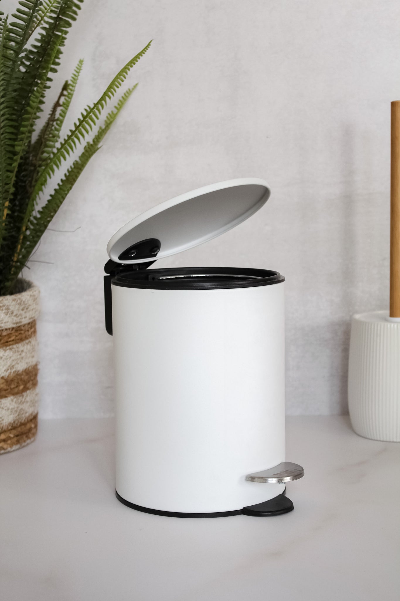 Basurero de metal de cierre suave y canasto interno desmontable, disponible en blanco y negro. De diseño limpio y sencillo, sin duda un elemento básico que no puede faltar en tu baño.