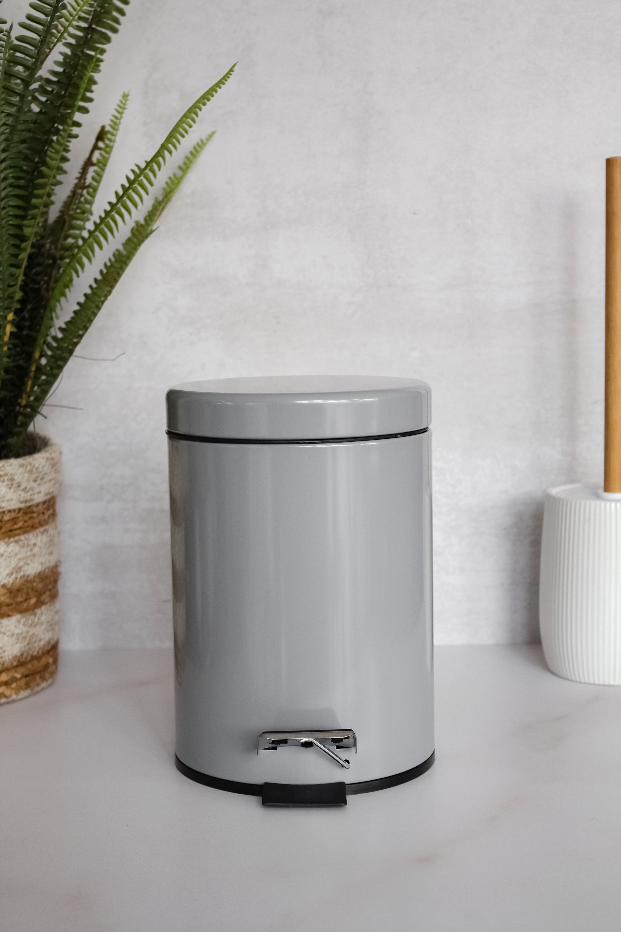 Basurero de metal color gris y canasto interno desmontable. De diseño limpio y sencillo, sin duda un elemento básico que no puede faltar en tu baño.