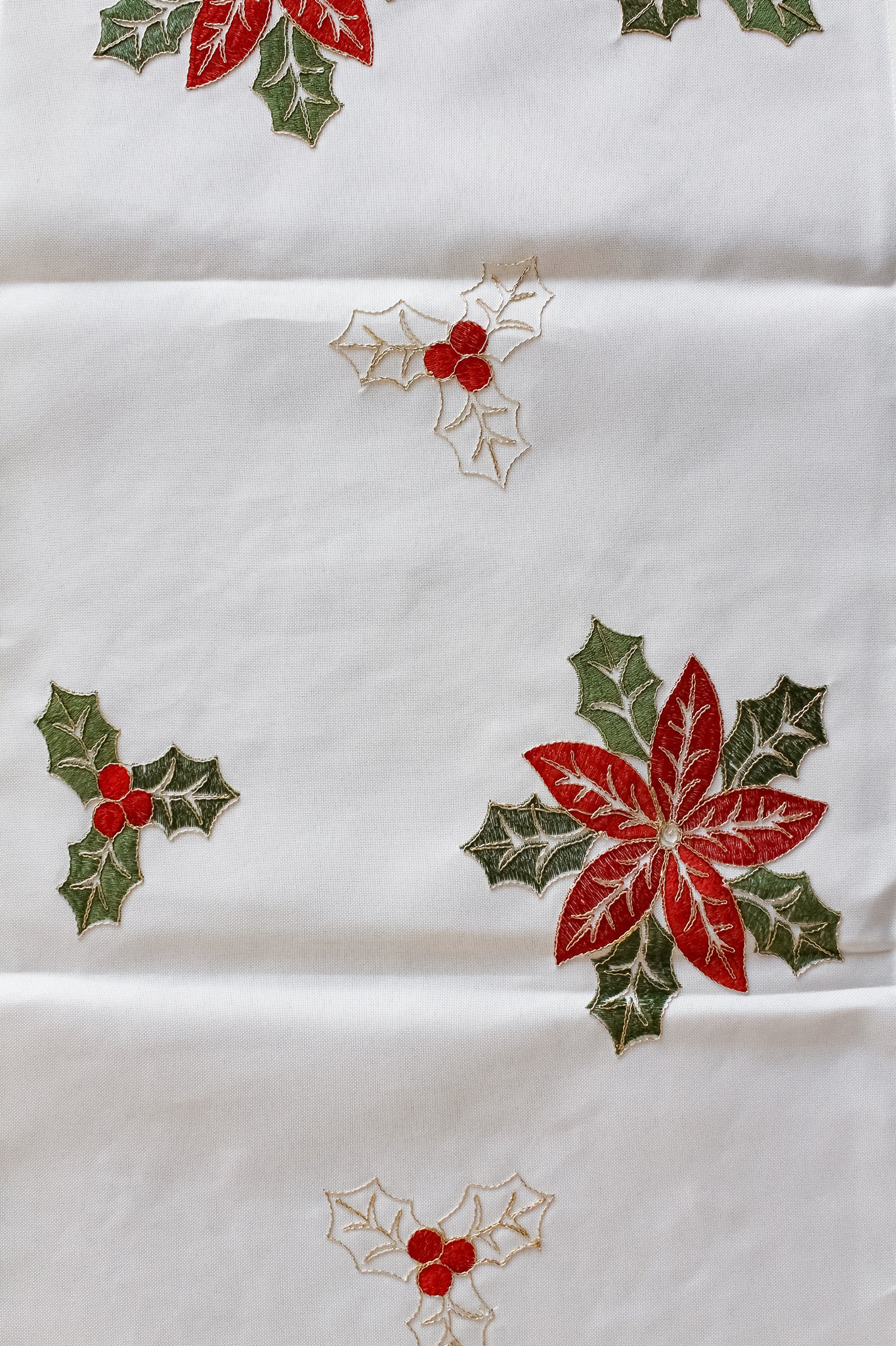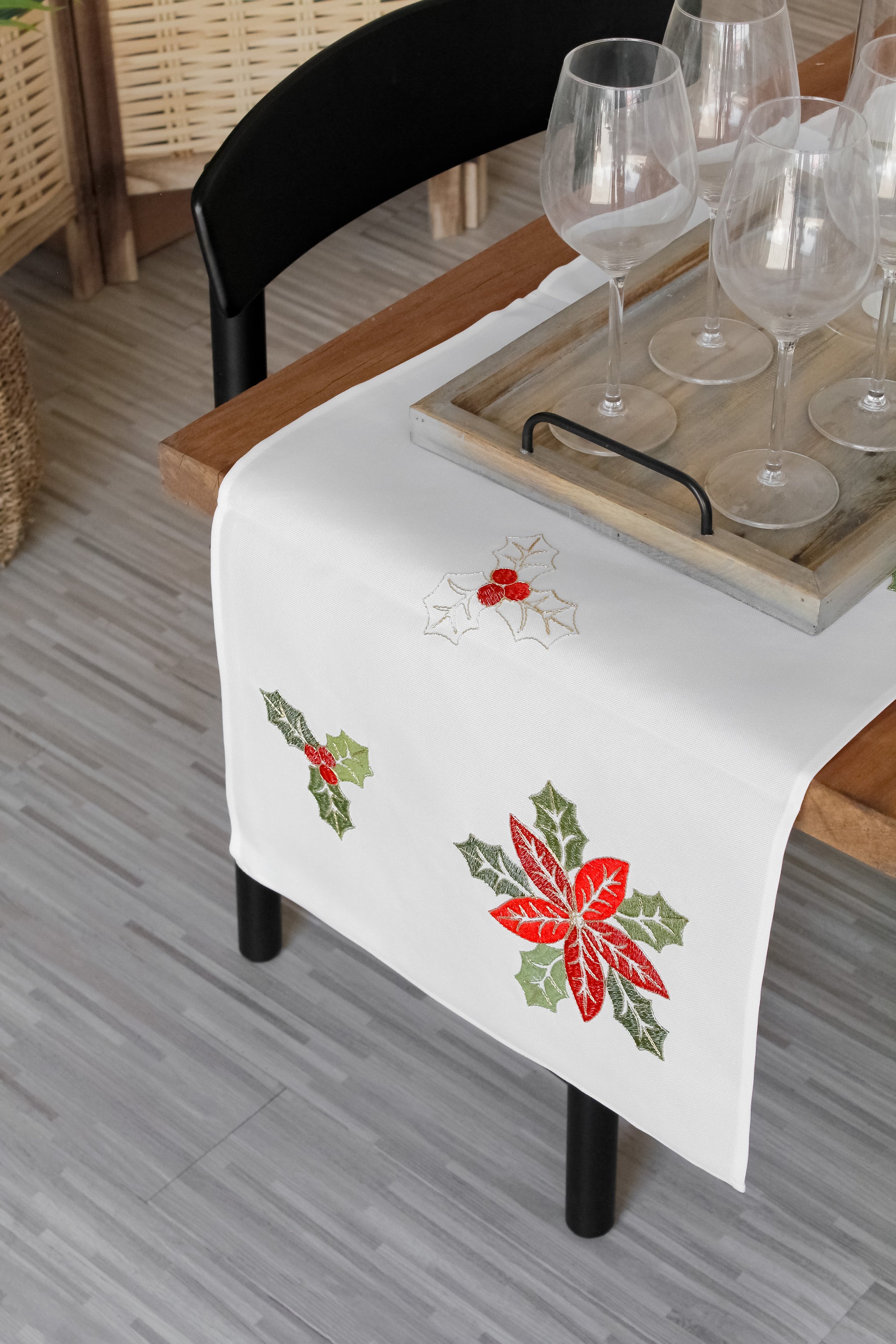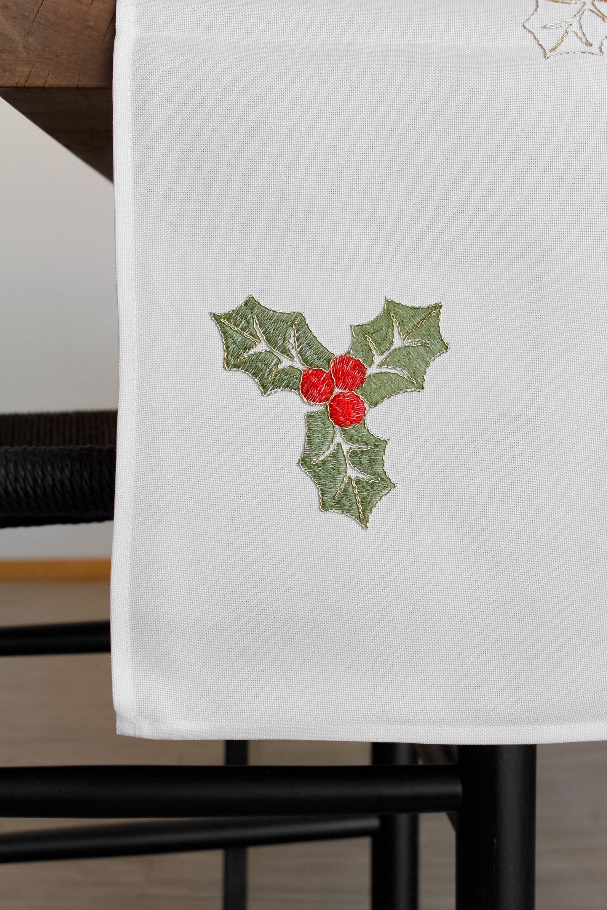 Camino de mesa blanco y diseño navideño, ideal para preparar tu mesa en estas fiestas. Un modelo de color neutro, pero con acento navideño en sus muérdagos bordados que visten tu mesa para esta navidad.