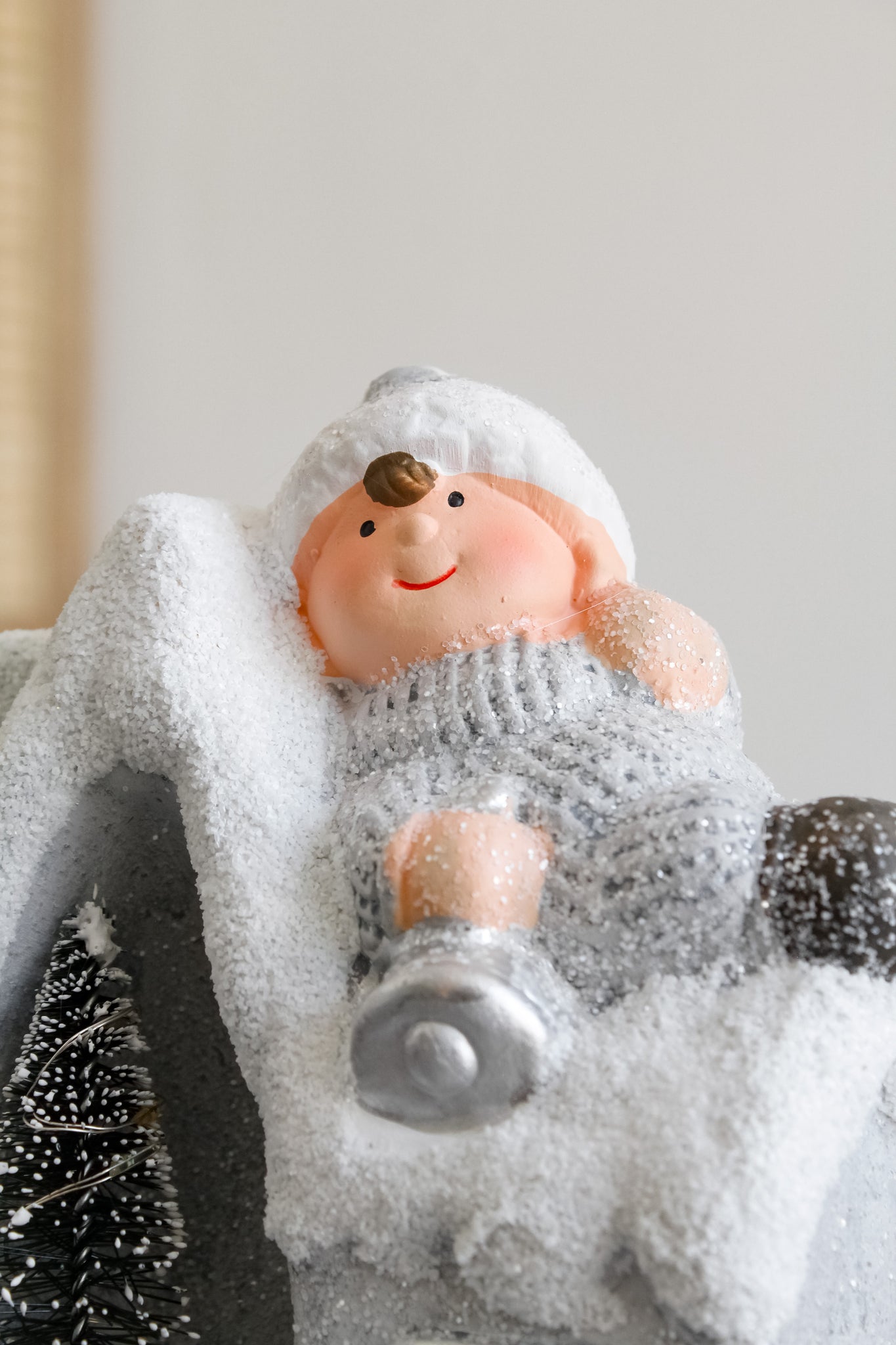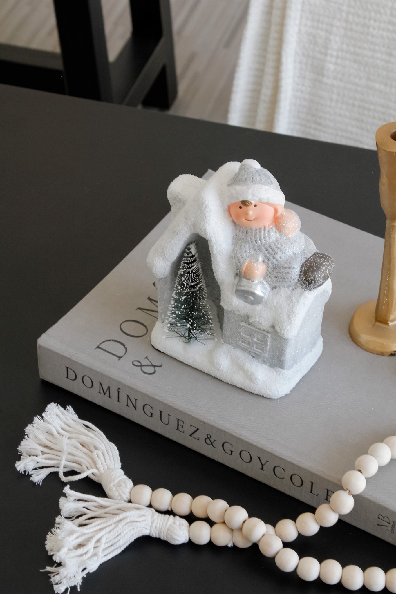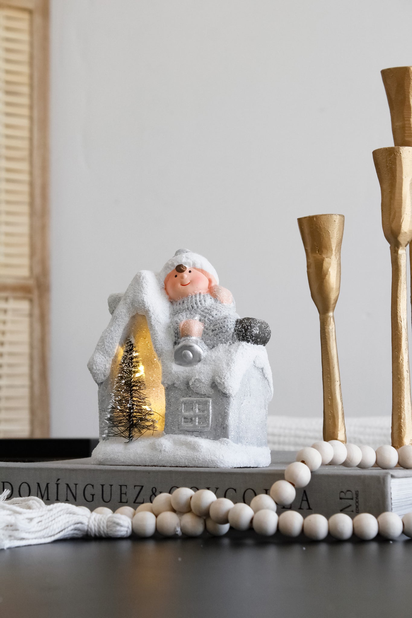 Figura de niño sobre una casita nevada con un pino de navidad y detalles con brillos. Un modelo que transmite el espíritu navideño por completo y de manera más sutil, de colores sobrios y que puedes combinar más fácil para dar un look cálido y elegante.