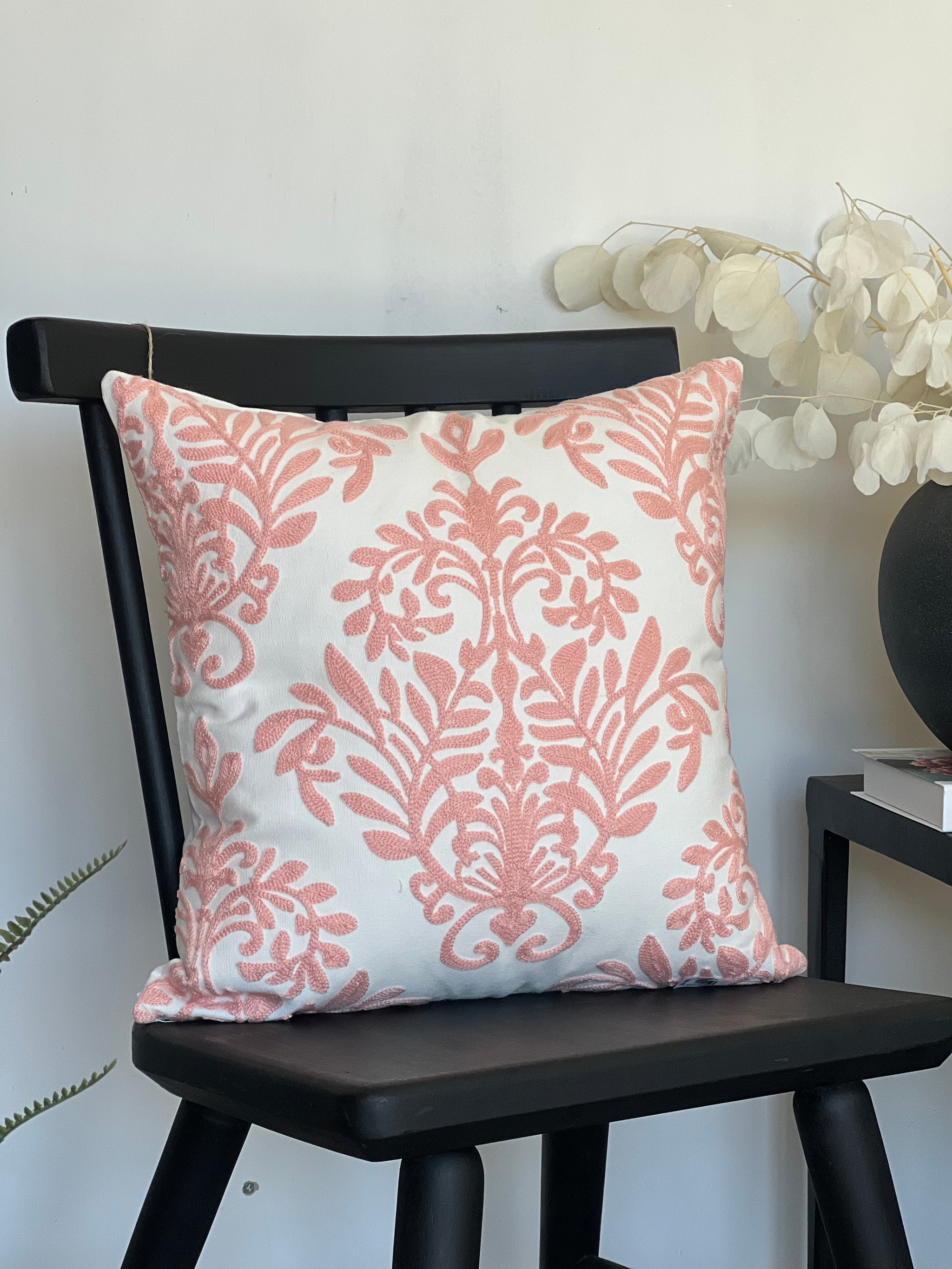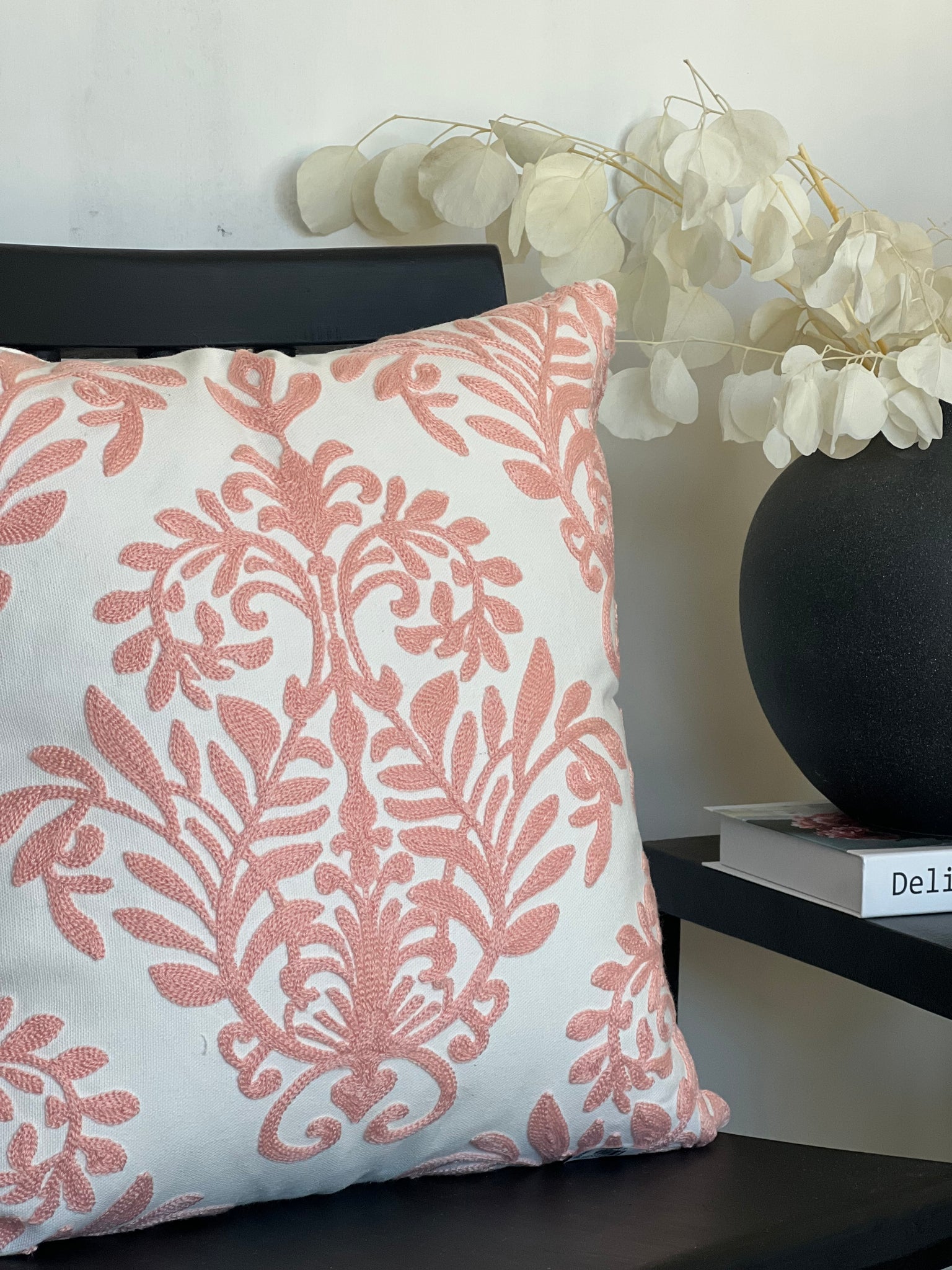 Funda de cojín de fondo blanco con un maravilloso bordado de flores y hojas en un tono rosado palo. Perfecto si lo que buscas es darle un toque delicado al ambiente.