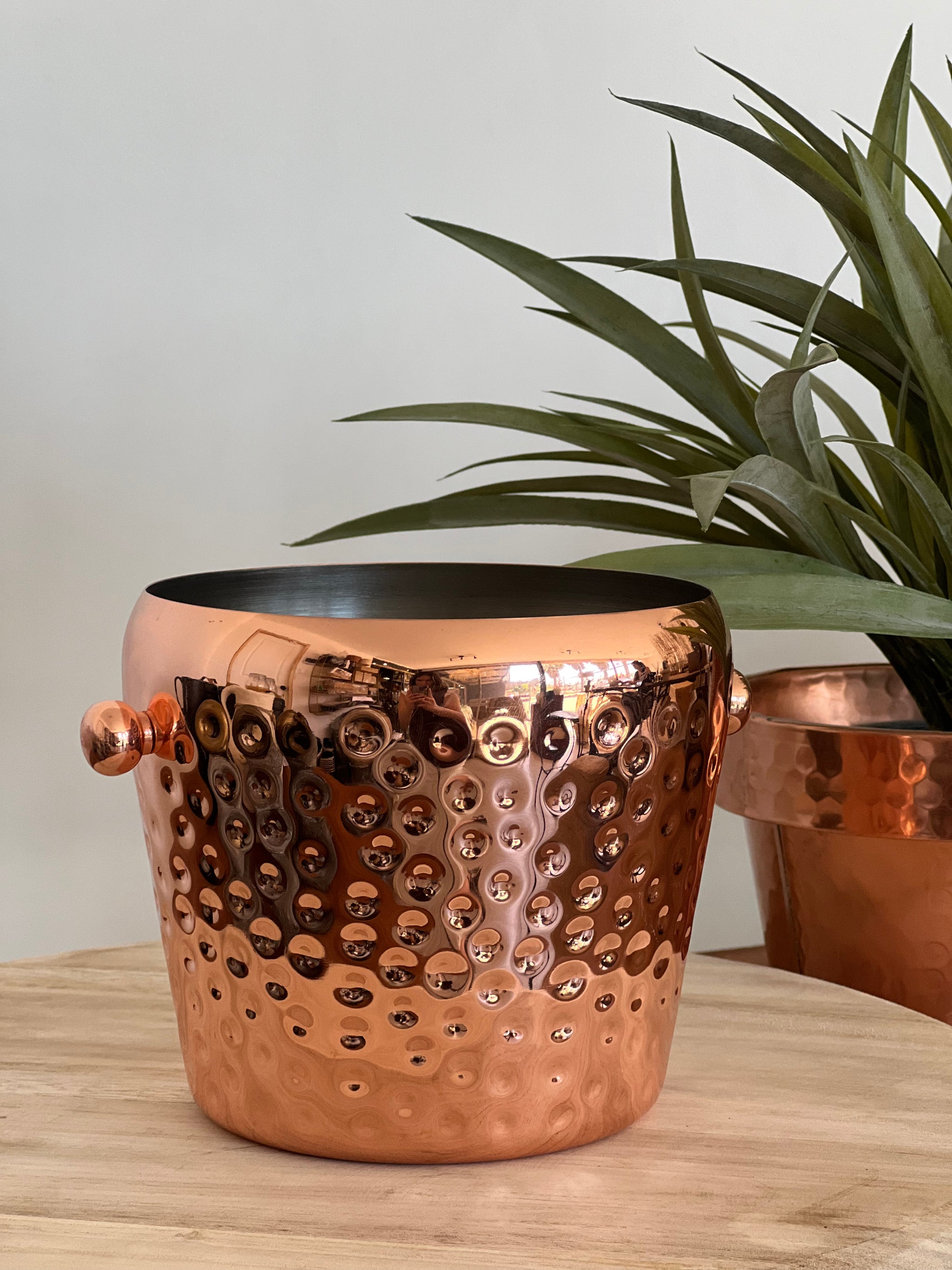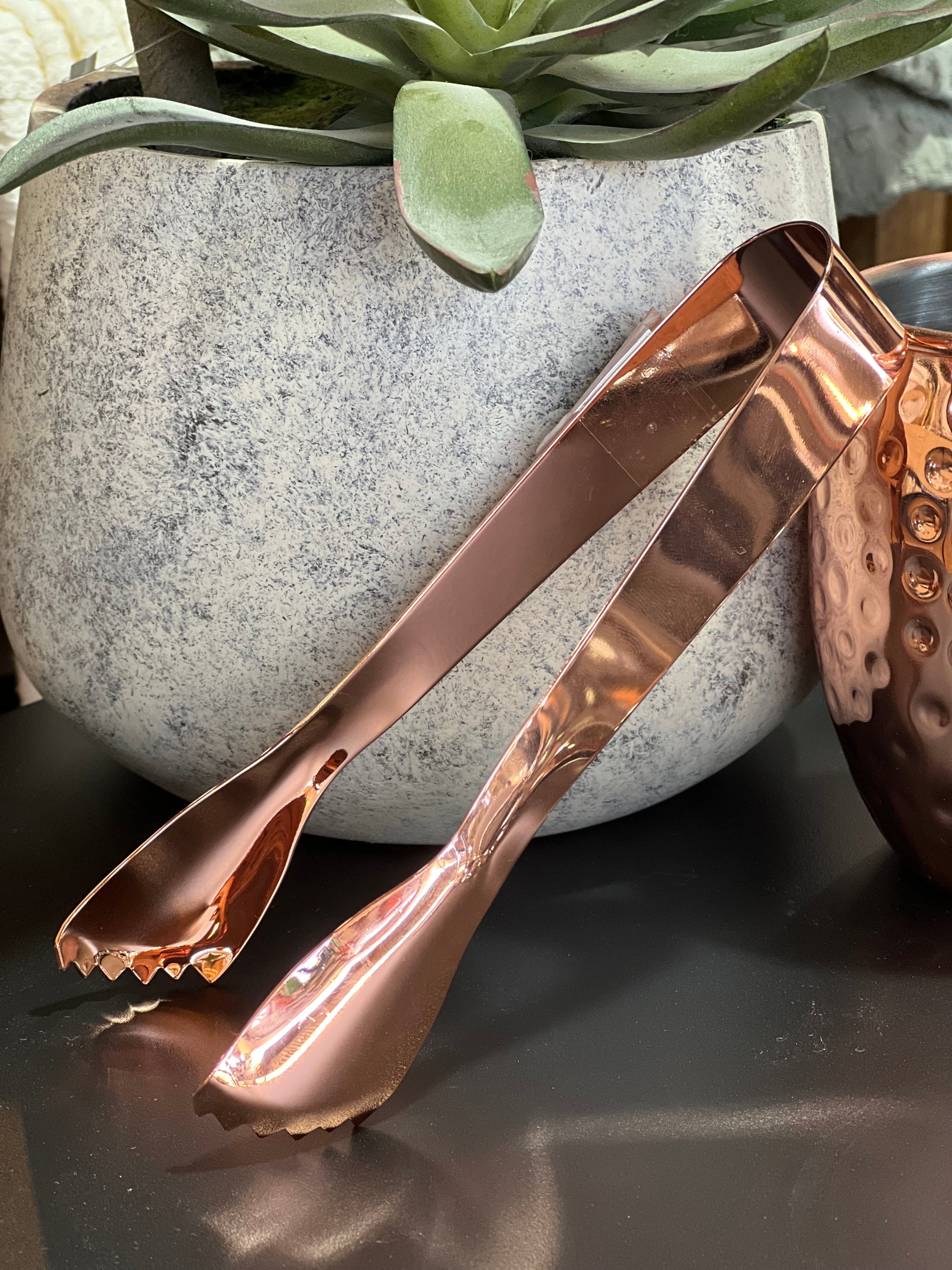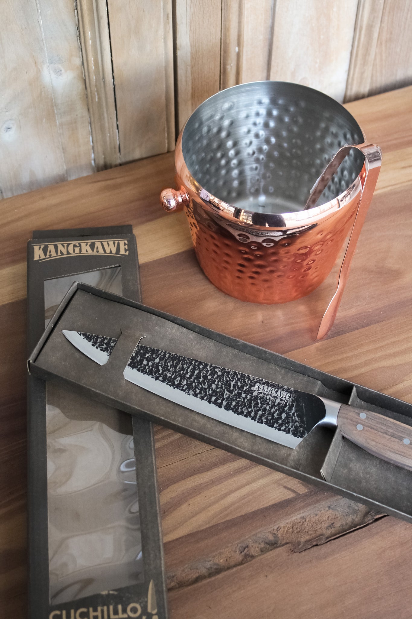 Contiene una hielera de acero inoxidable bañada en cobre, una pinza del mismo material y un exquisito cuchillo parrillero de acero inoxidable y carbono martillado.