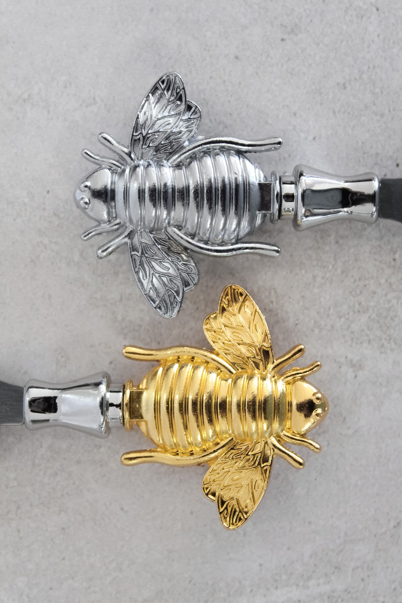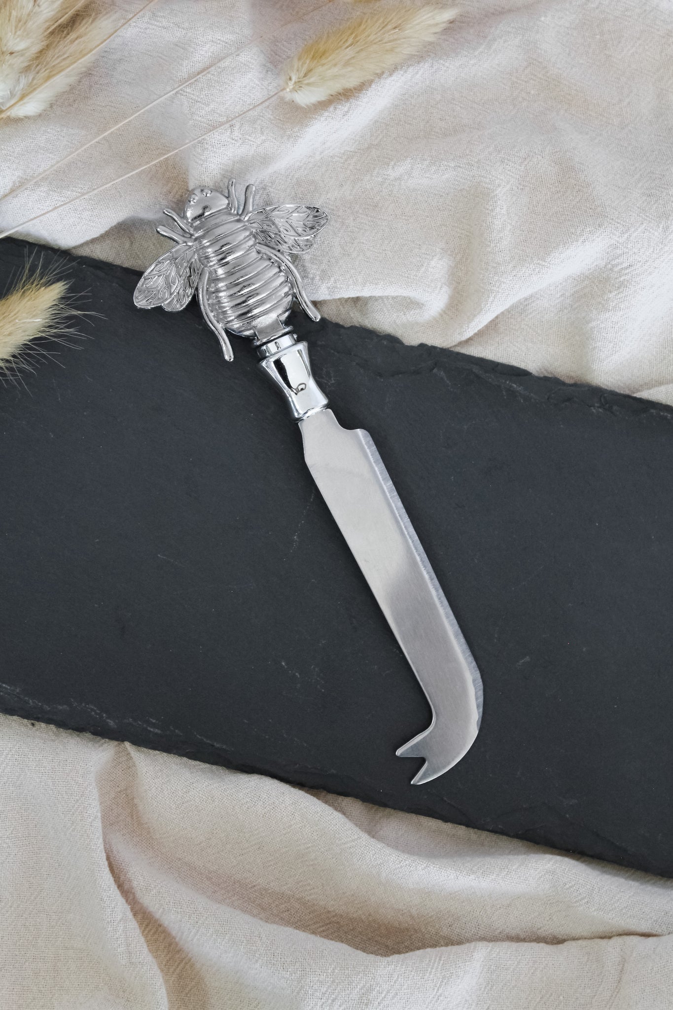 Cuchillo de aperitivo con filo para quesos, en color dorado y plateado, con diseño de abeja en su extremo. Un modelo para montar una exquisita tabla de aperitivo, con un detalle sutil y bonito.
