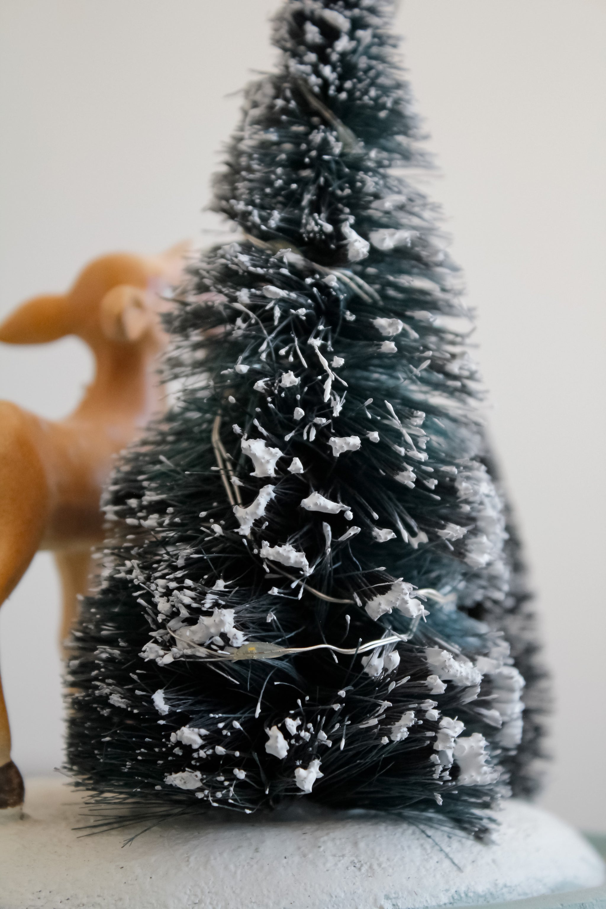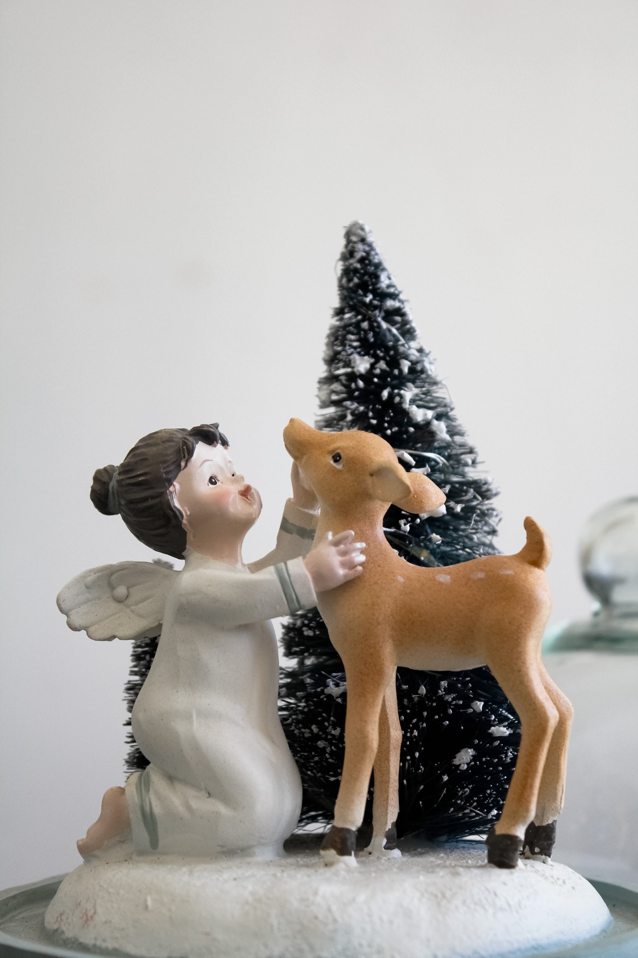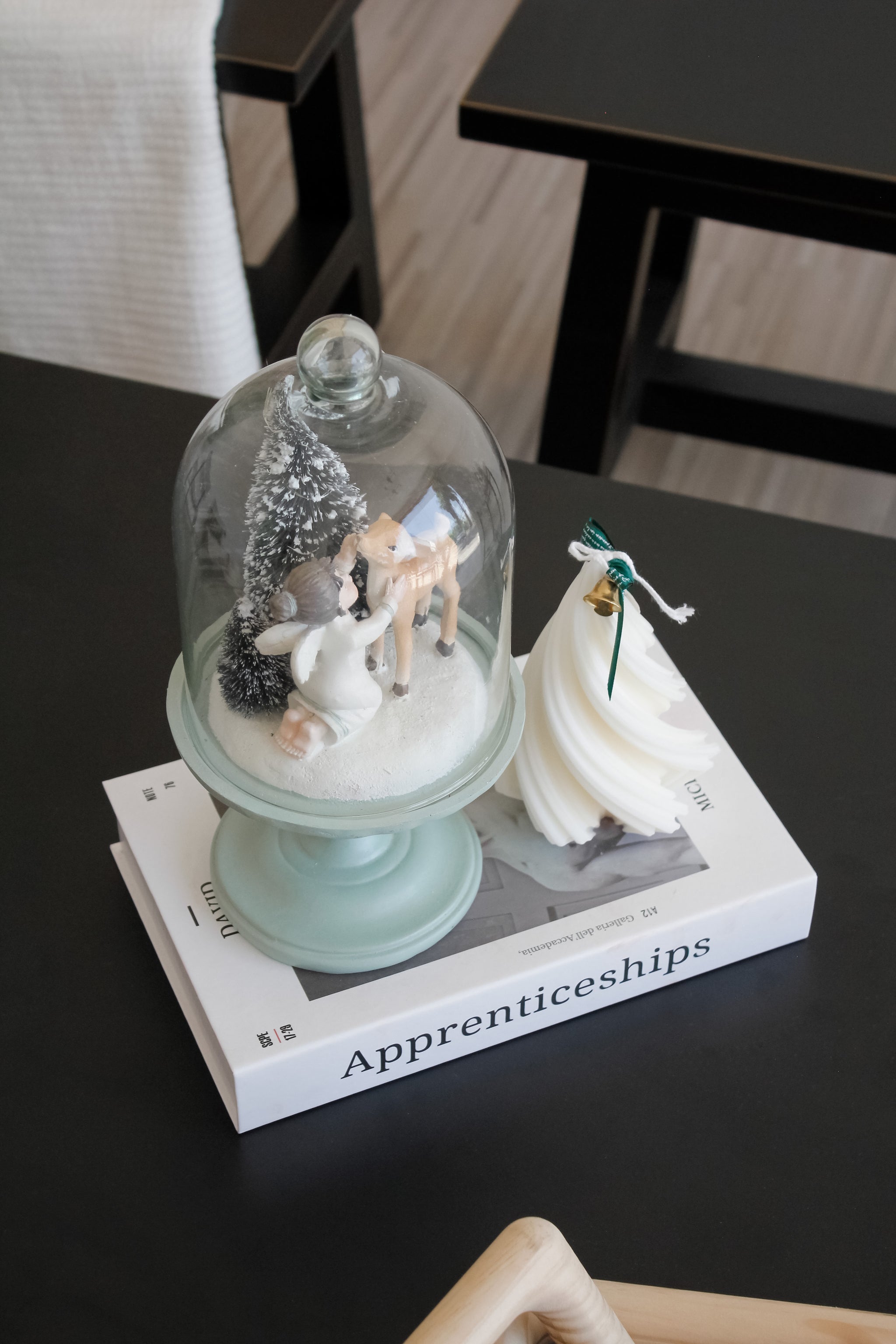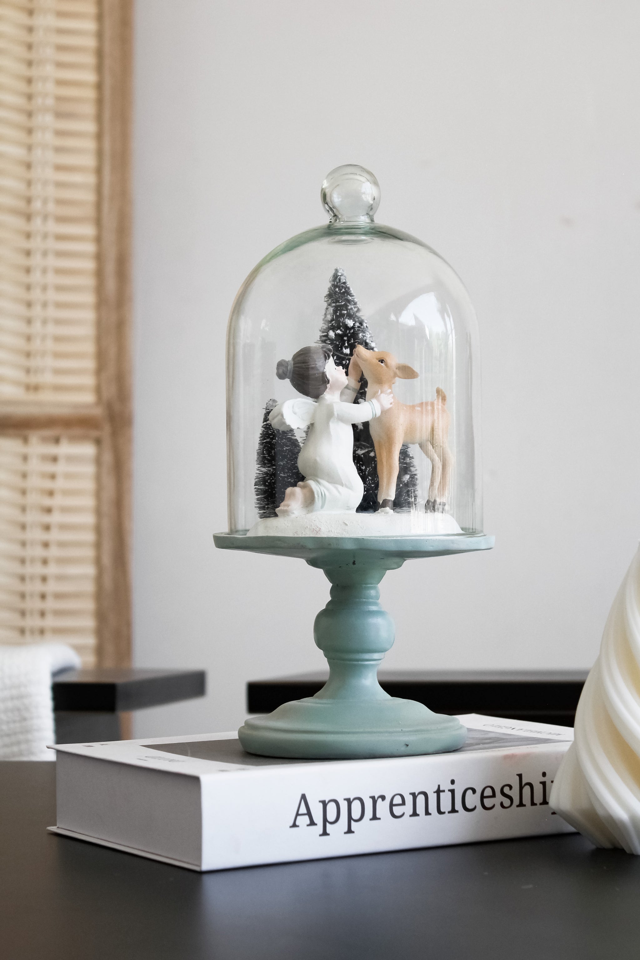 Una cúpula navideña con base de madera celeste en altura, y en su interior, la figura de un angelito junto a un reno y de fondo un par de pinos nevados. Un modelo que transmite el espíritu navideño por completo, y que puedes combinar en tu decoración para darle un toque sutil, pero sin invadir.