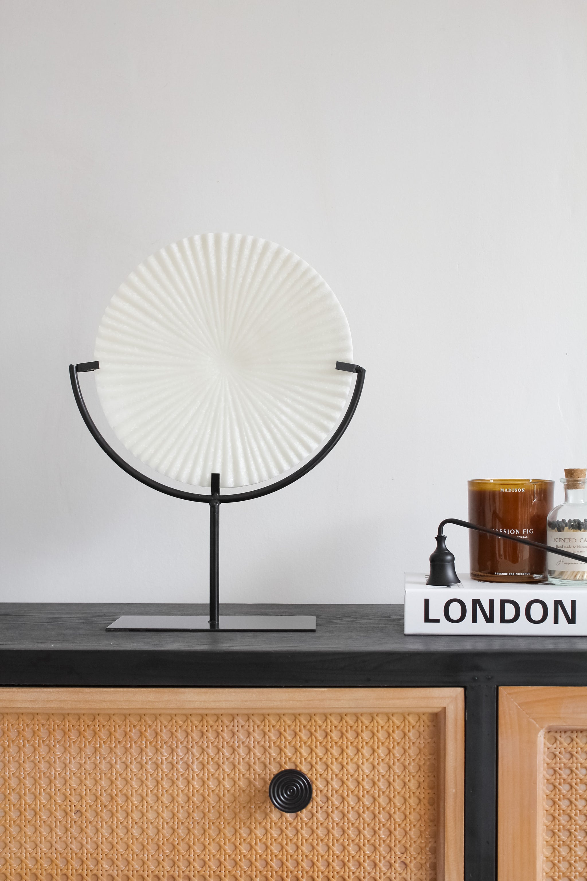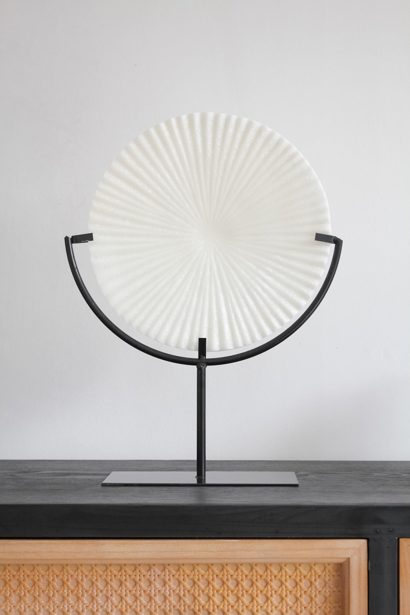 Está diseñada en piedra de color blanca con diseño ranurado y con base metal en color negro.
