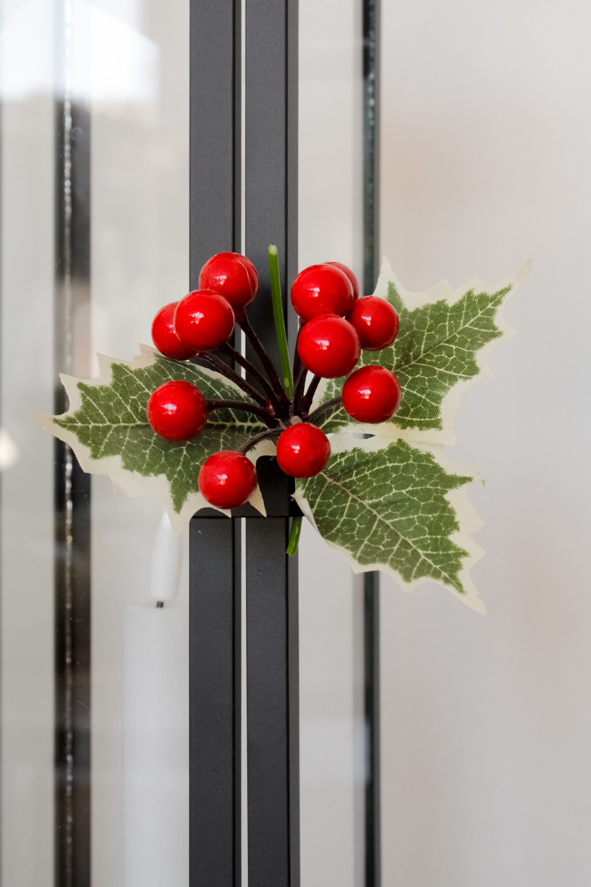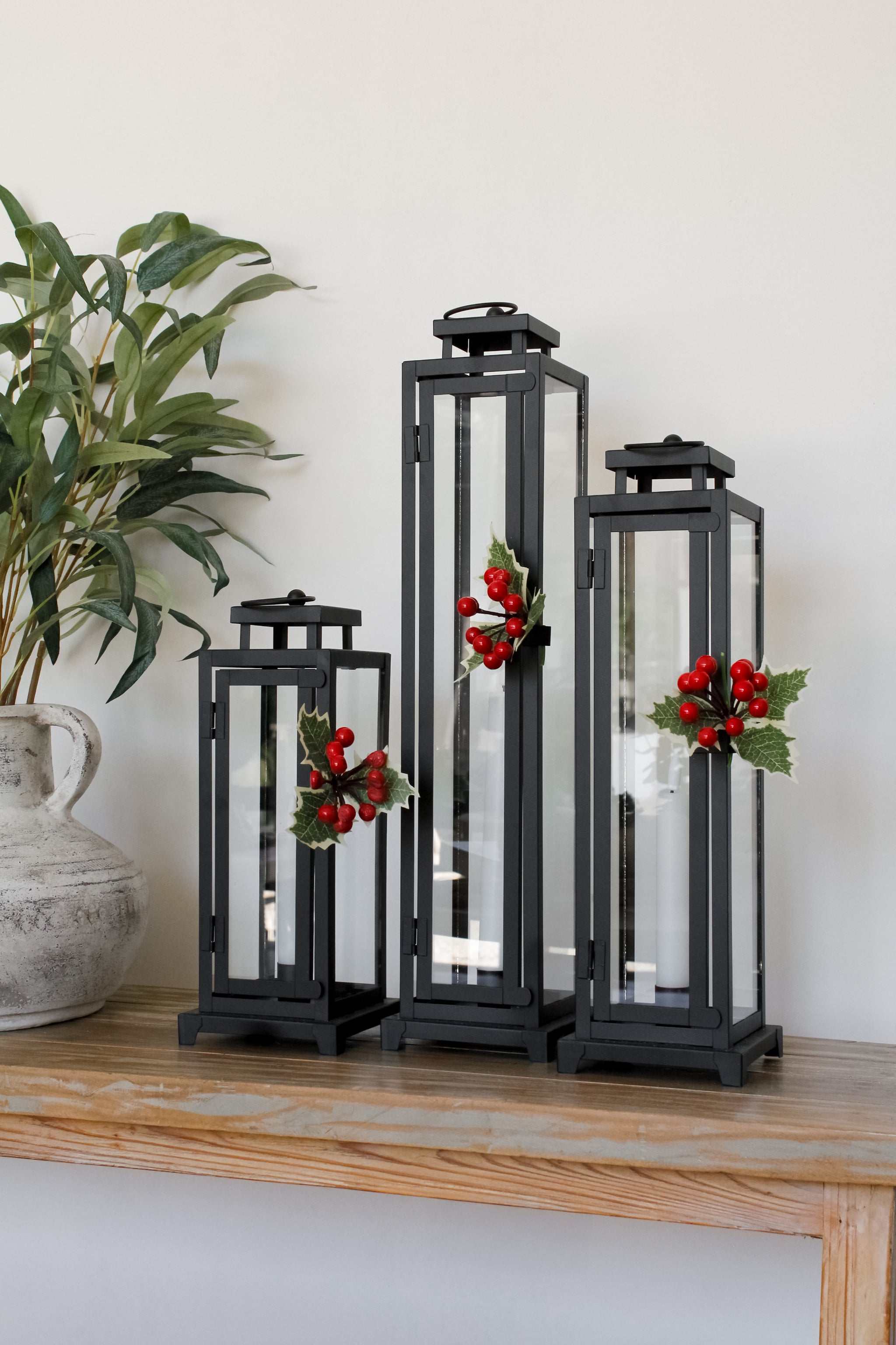 Increíble modelo de fanal de metal negro y vidrio, con broche metálico y una ramita de muérdago. Un modelo sobrio, clásico y con ese toque navideño perfecto para estas fiestas. Es una excelente opción para decorar tu terraza o quincho, pero sin recargar el espacio.
