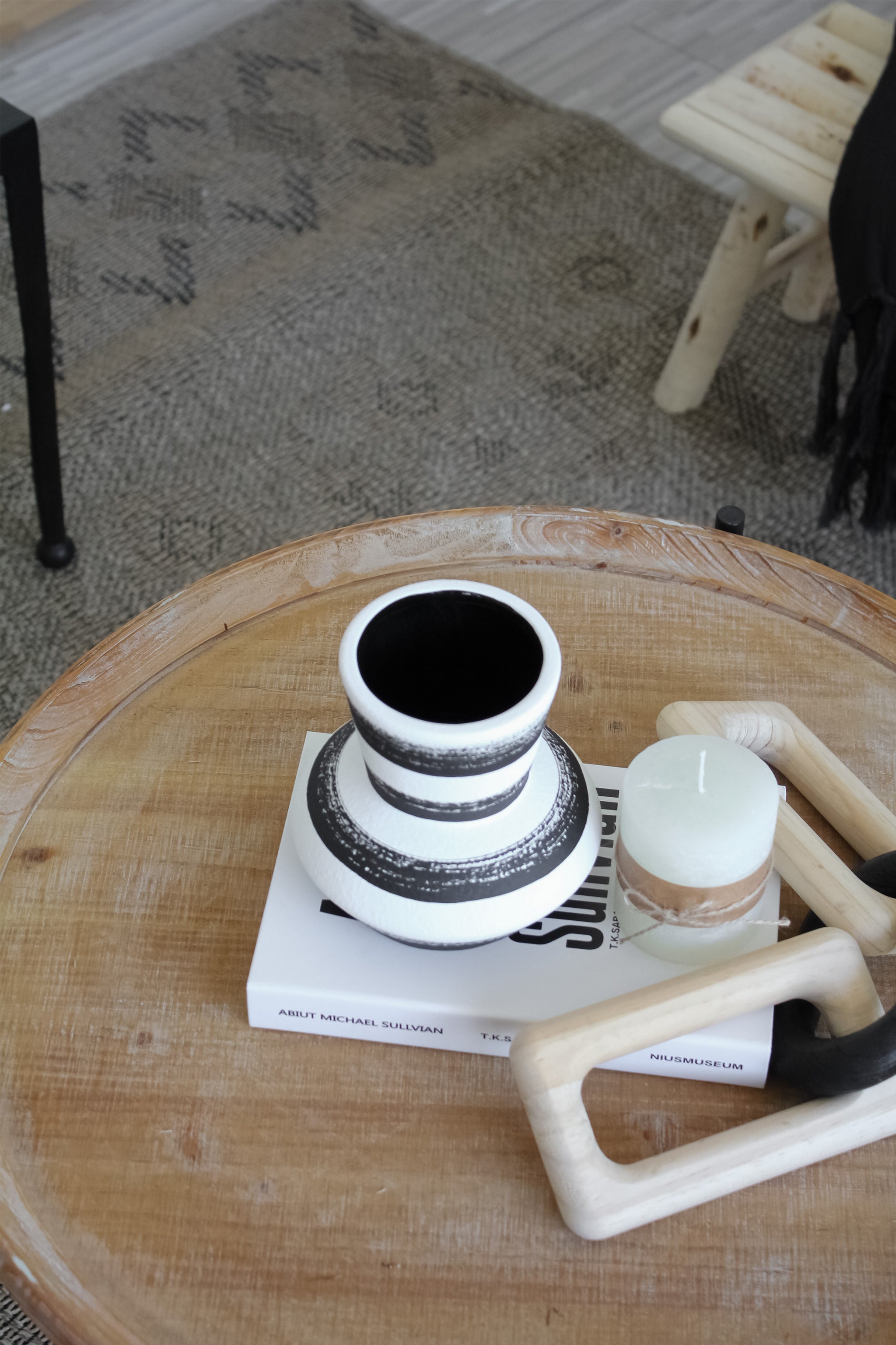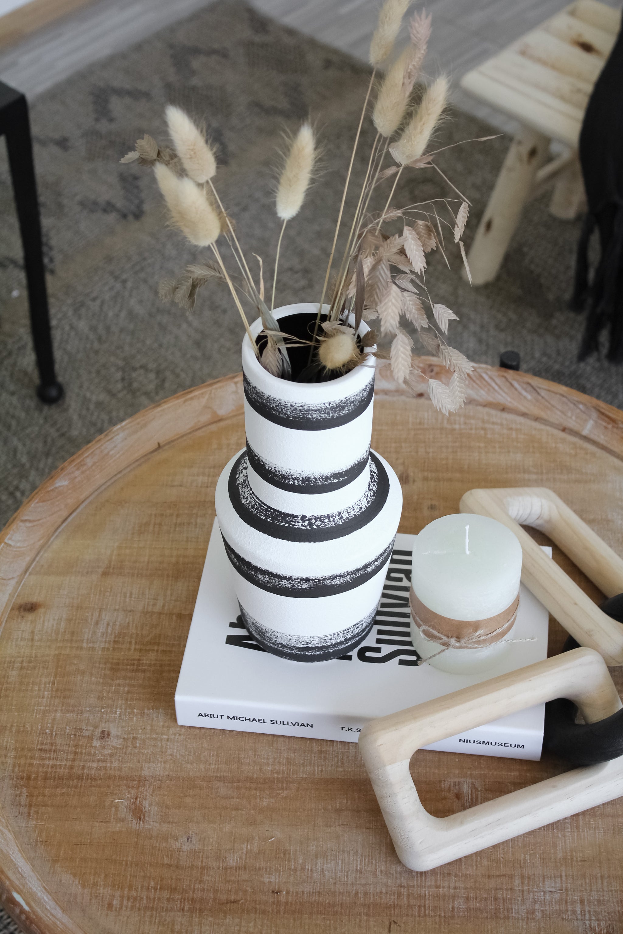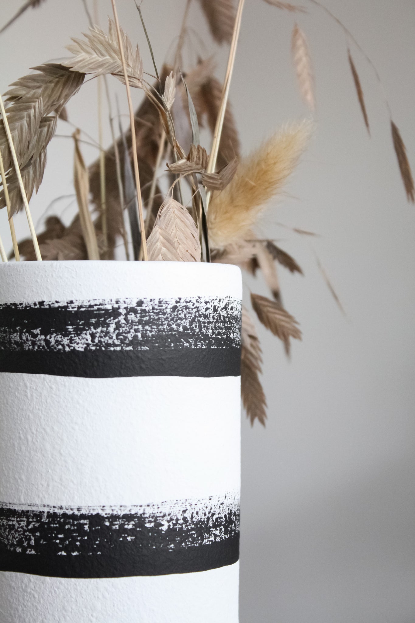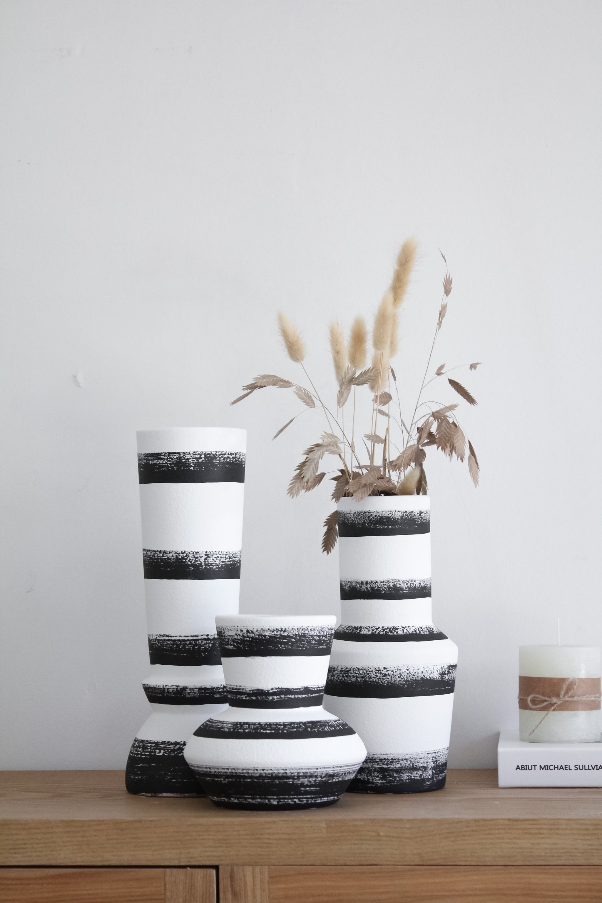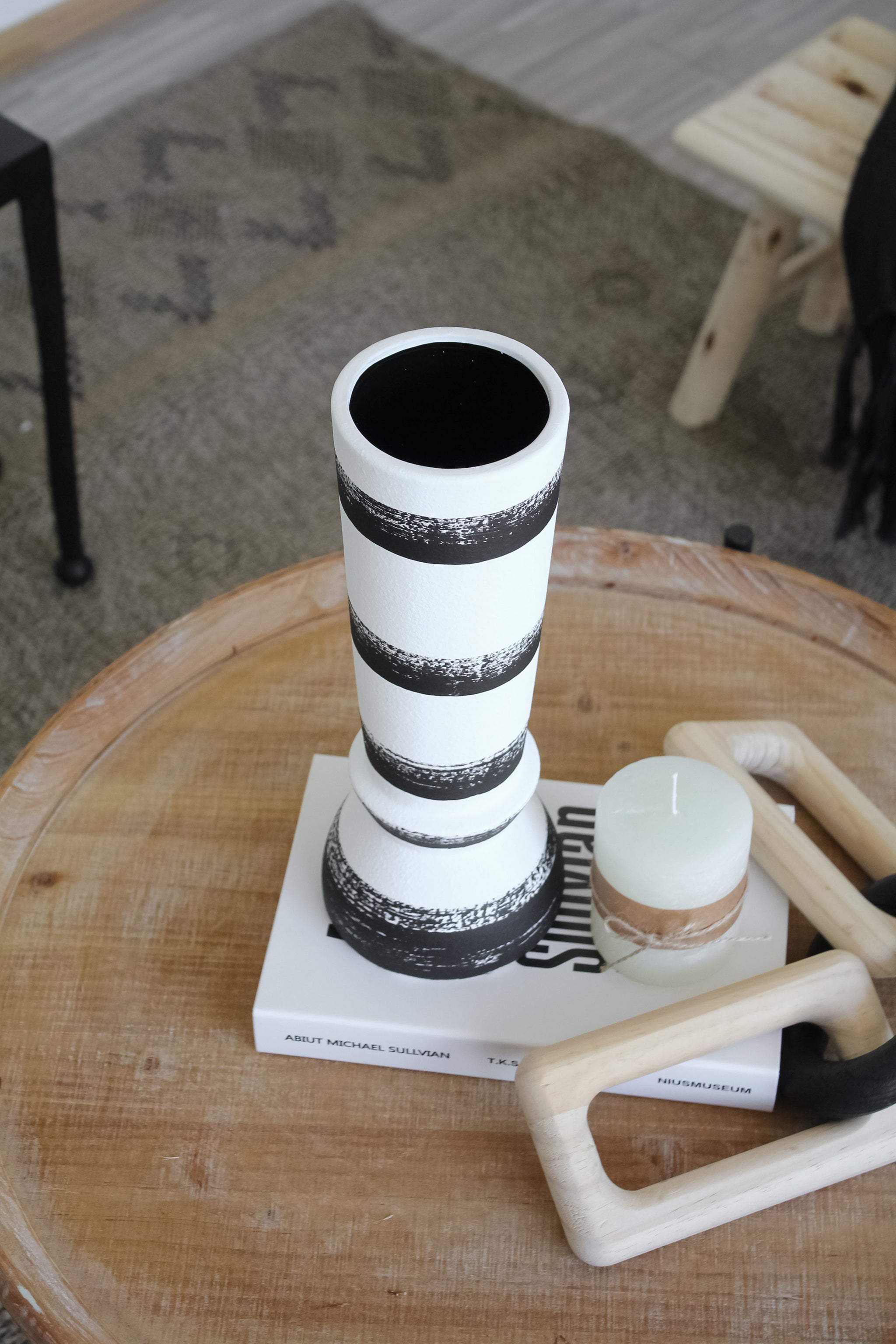 Un modelo de jarrón en color blanco con franjas en negro, la combinación perfecta para aportar un toque elegante y moderno.