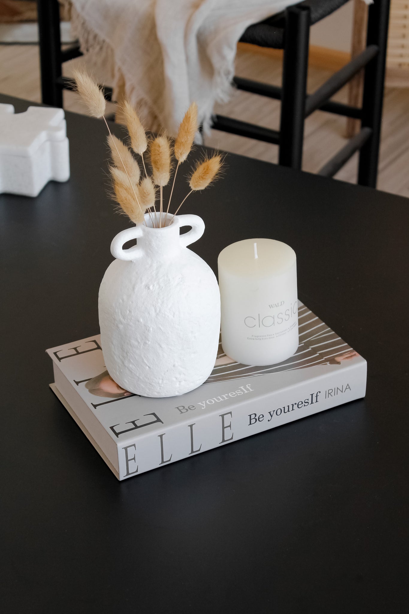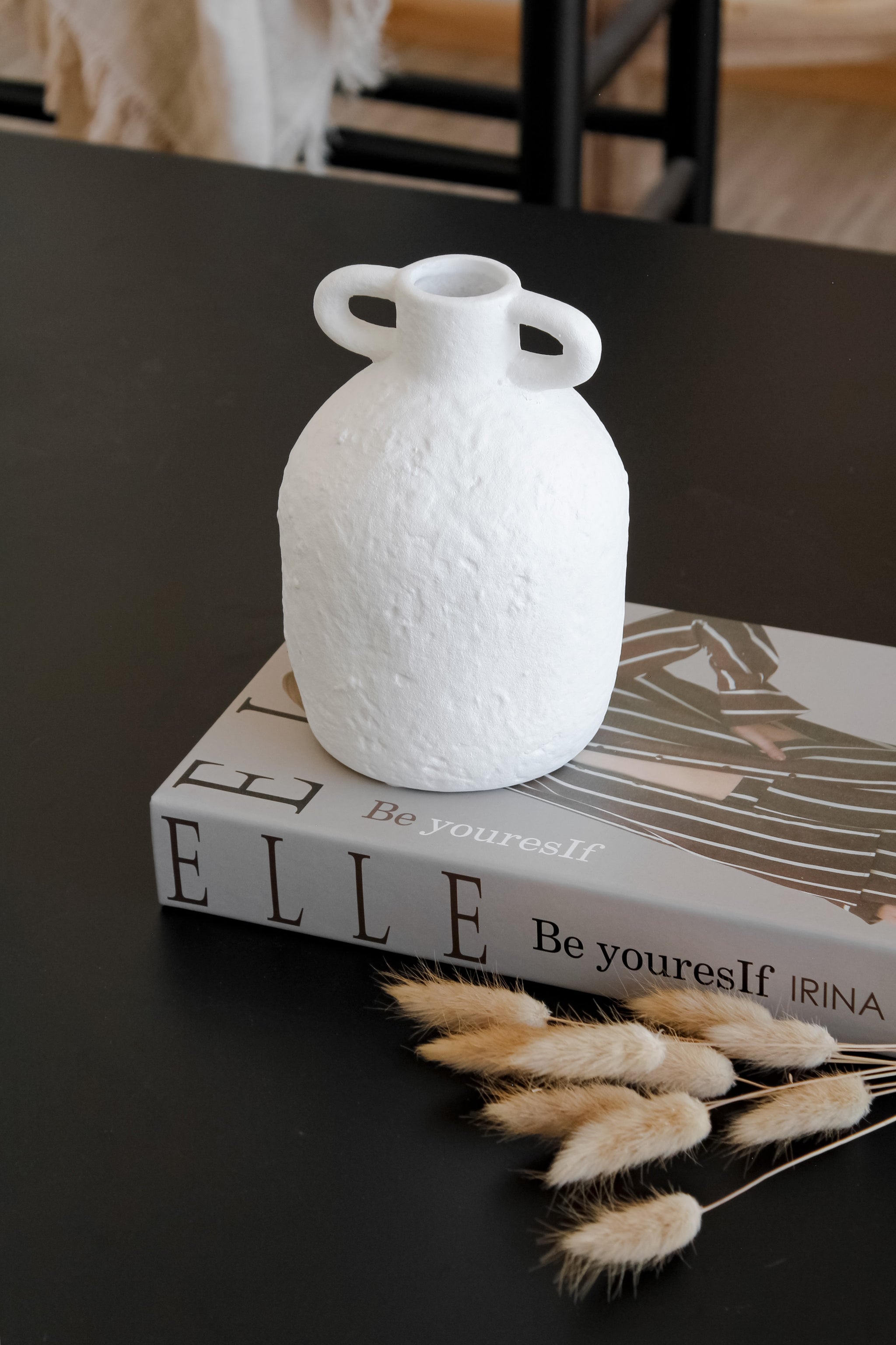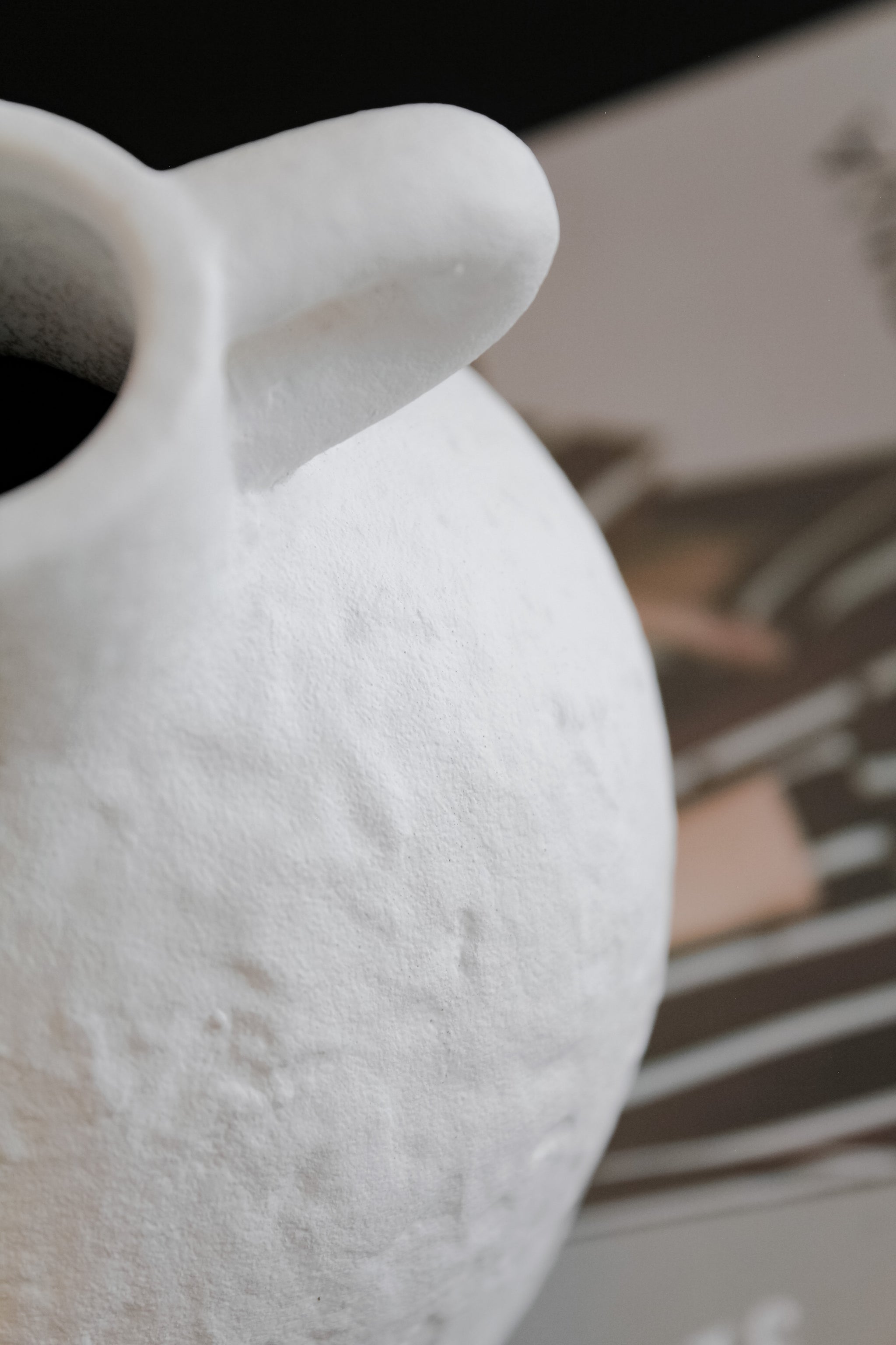 Precioso modelo de florero de cerámica blanco con dos asas y diseño irregular. Moderno y elegante, de tamaño medio y preciso para montarlo sobre tu arrimo de entrada, en tu mesa de centro o en una mesita lateral para darle un toque de luz a ese rincón. Y si quieres complementarlo, puedes agregarle un par de ramitas secas o varitas verdes para ese detalle natural.