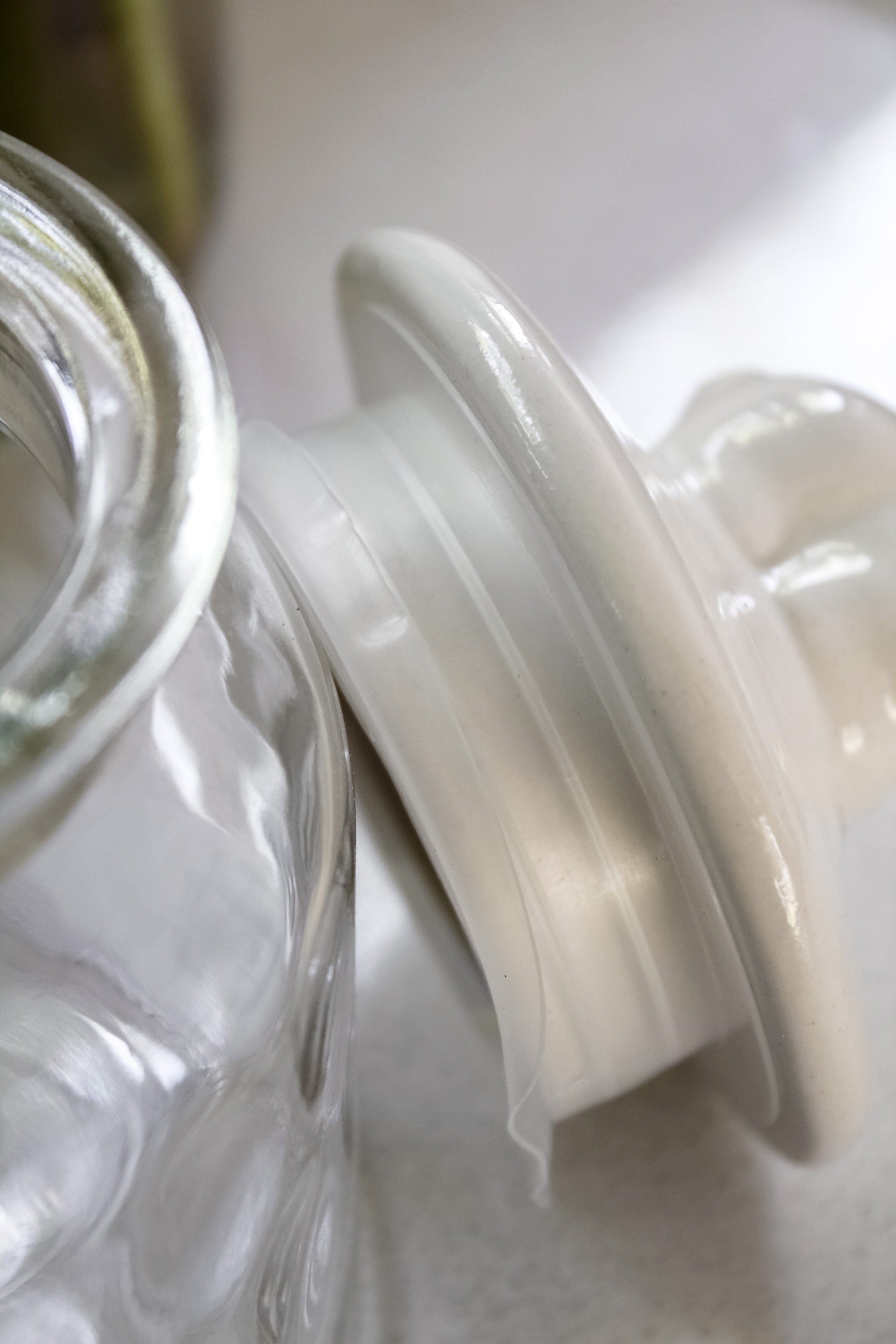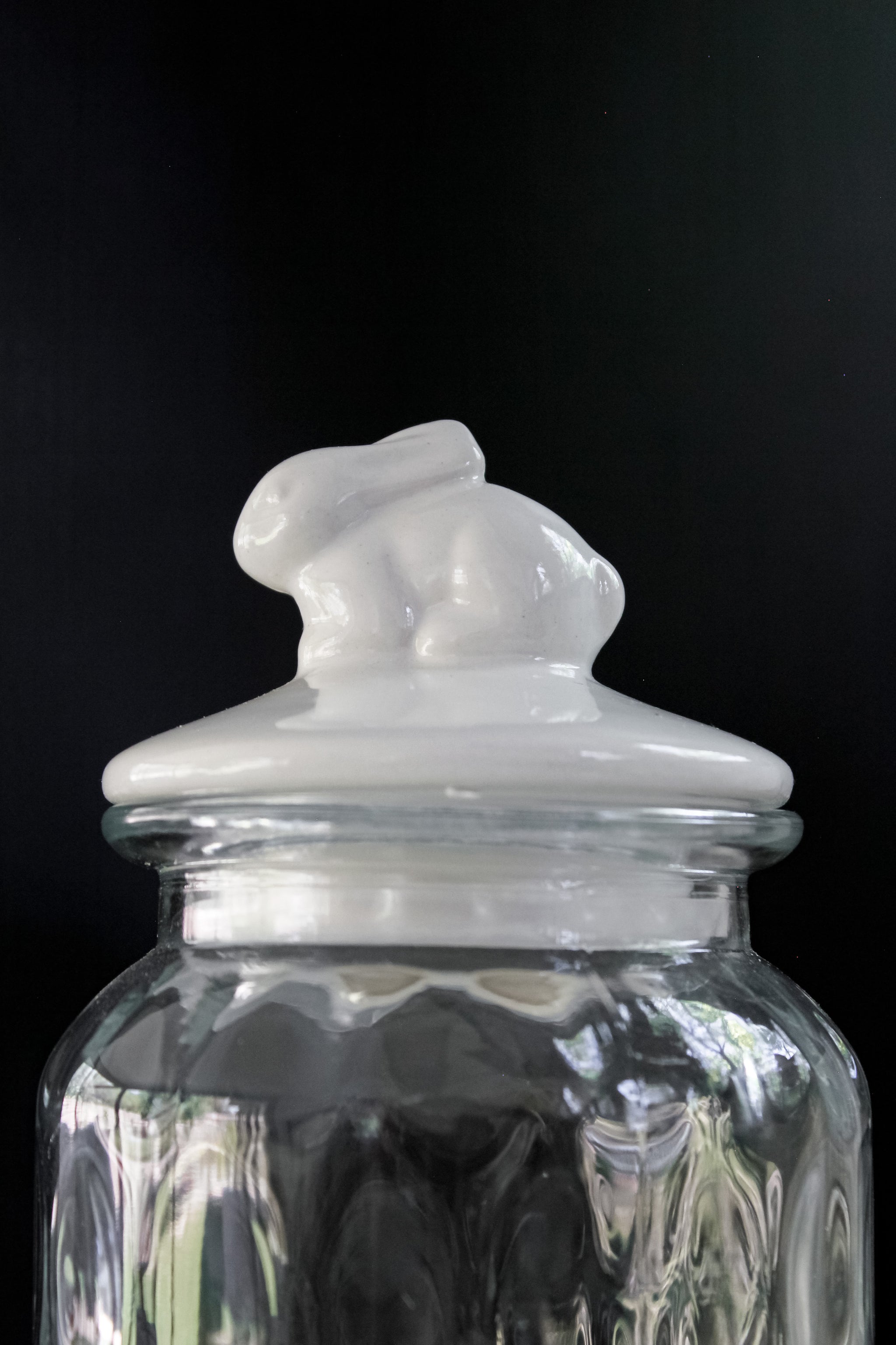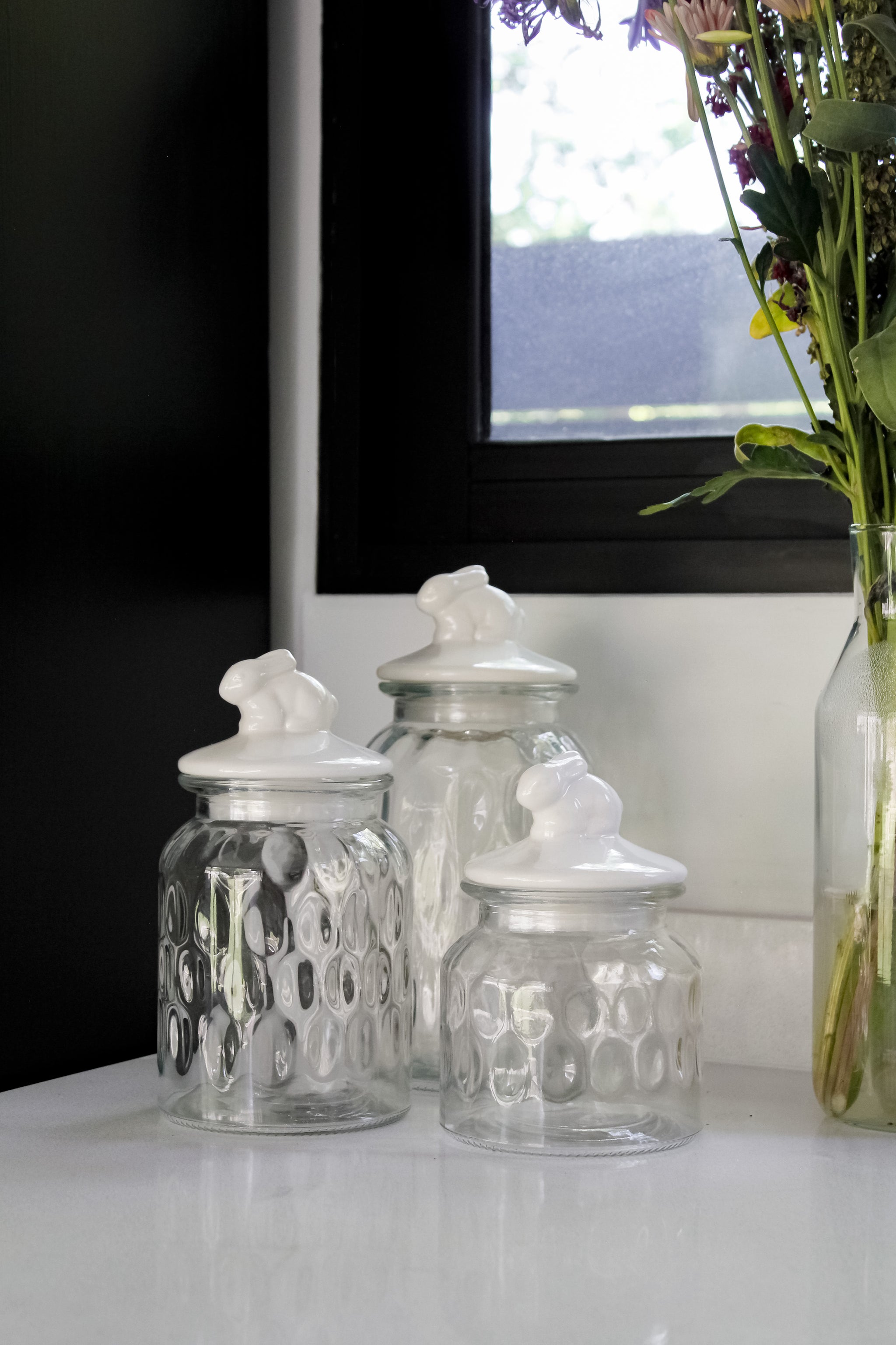 Frasco de vidrio con diseño irregular por dentro y tapa de cerámica blanca con un conejo. Un precioso y delicado modelo, disponible en tres tamaños y perfecto para organizar y decorar al mismo tiempo, tanto en la cocina como en el baño.