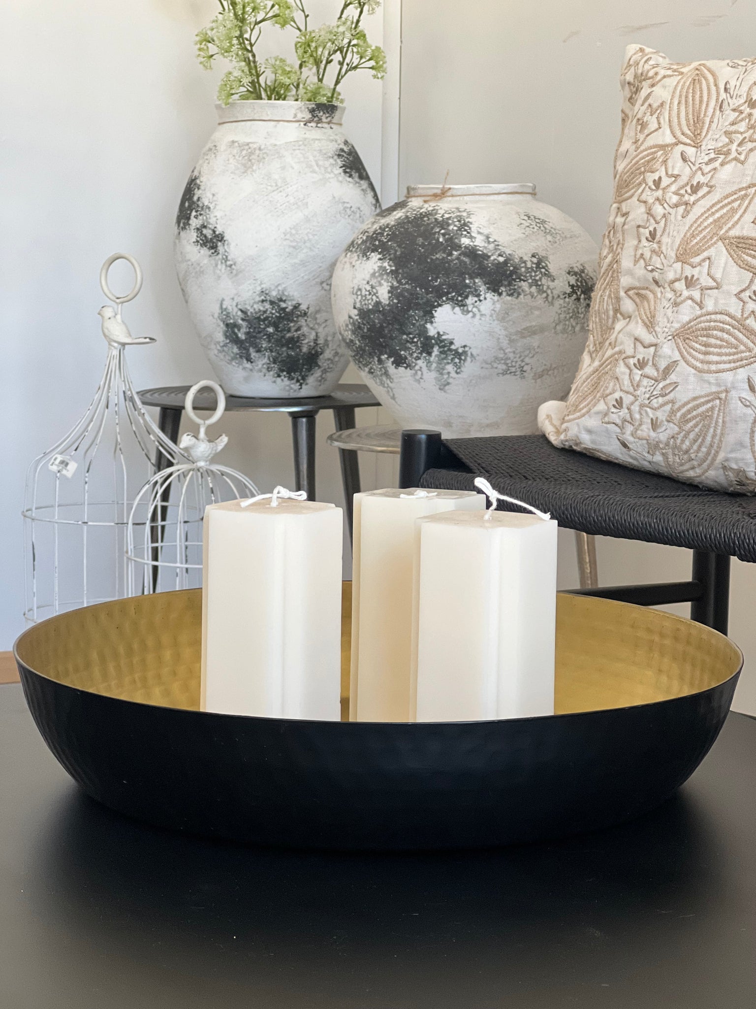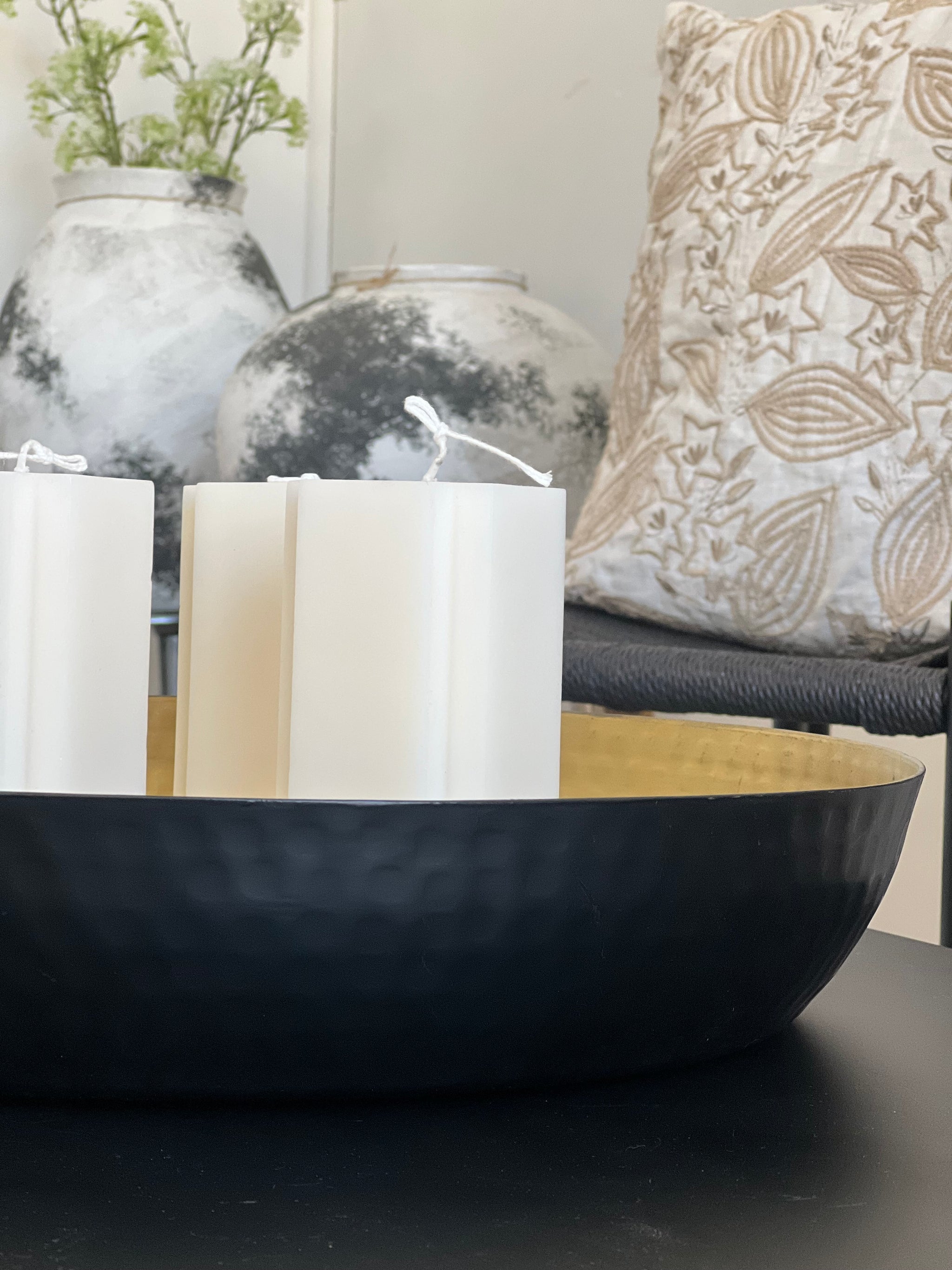 Bandeja circular hecha de metal martillado. Decora tu hogar de una manera elegante y sutil con estas hermosas fuentes. Su color dorado por dentro y negro por fuera promete agregar ese toque innovador y destacar tu espacio.