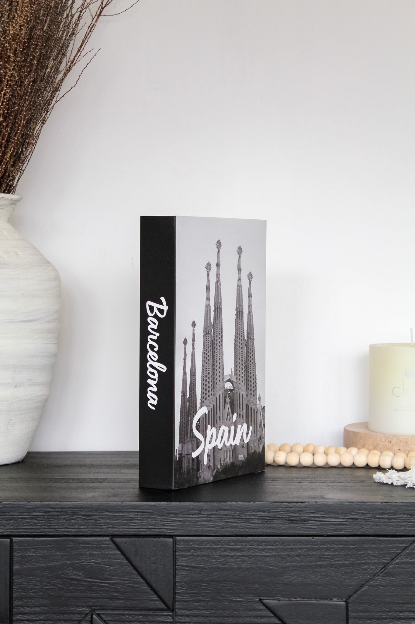Con una gráfica en blanco y negro de la Sagrada Familia de Barcelona en primer plano, esta increíble imitación de libro es el complemento perfecto para decorar tu mesa de centro, arrimo o repisas. Su diseño permite jugar con otros colores, puedes montar una figura o un par de velas sobre ella y lograr una decoración preciosa y equilibrada.