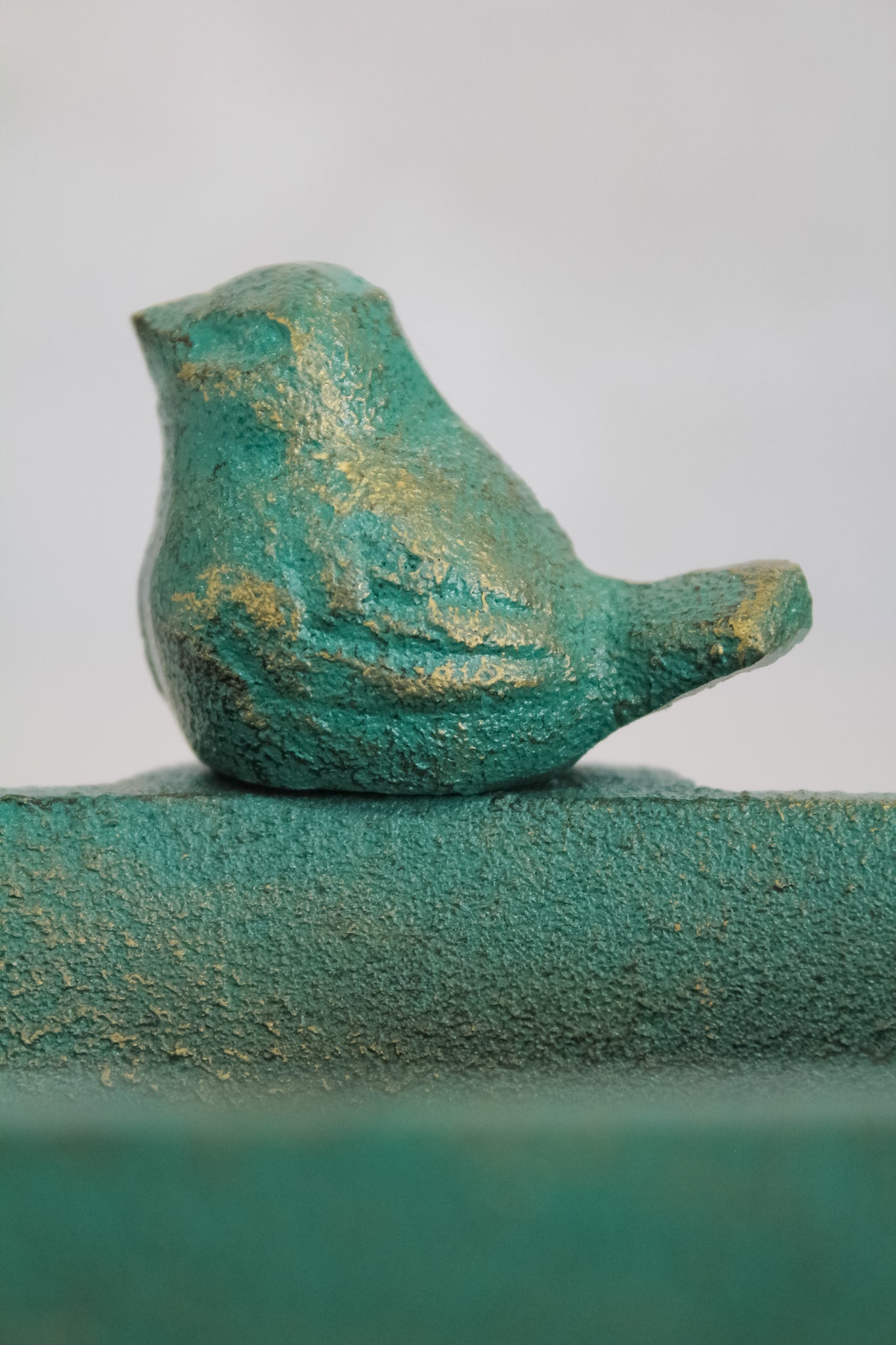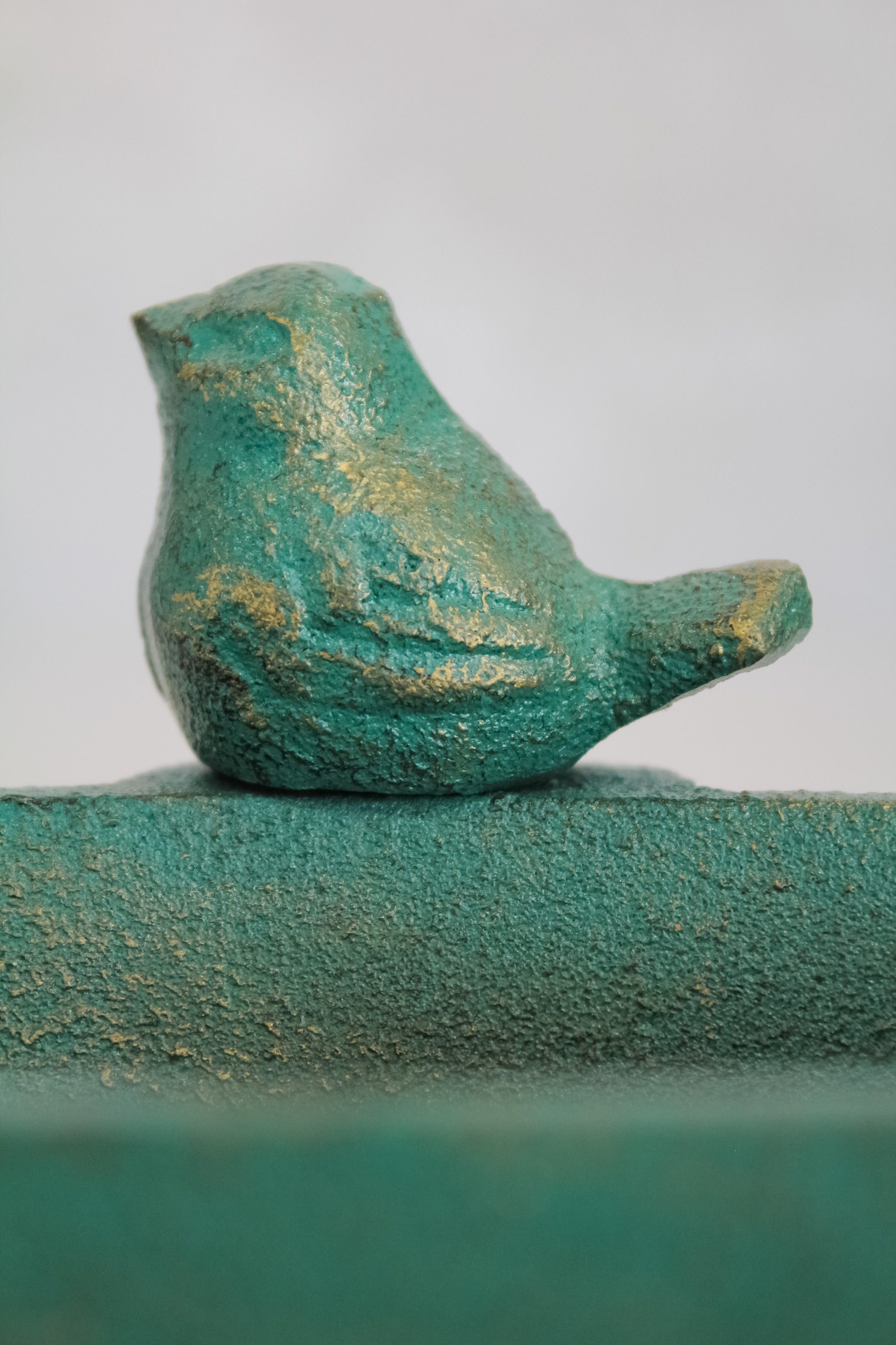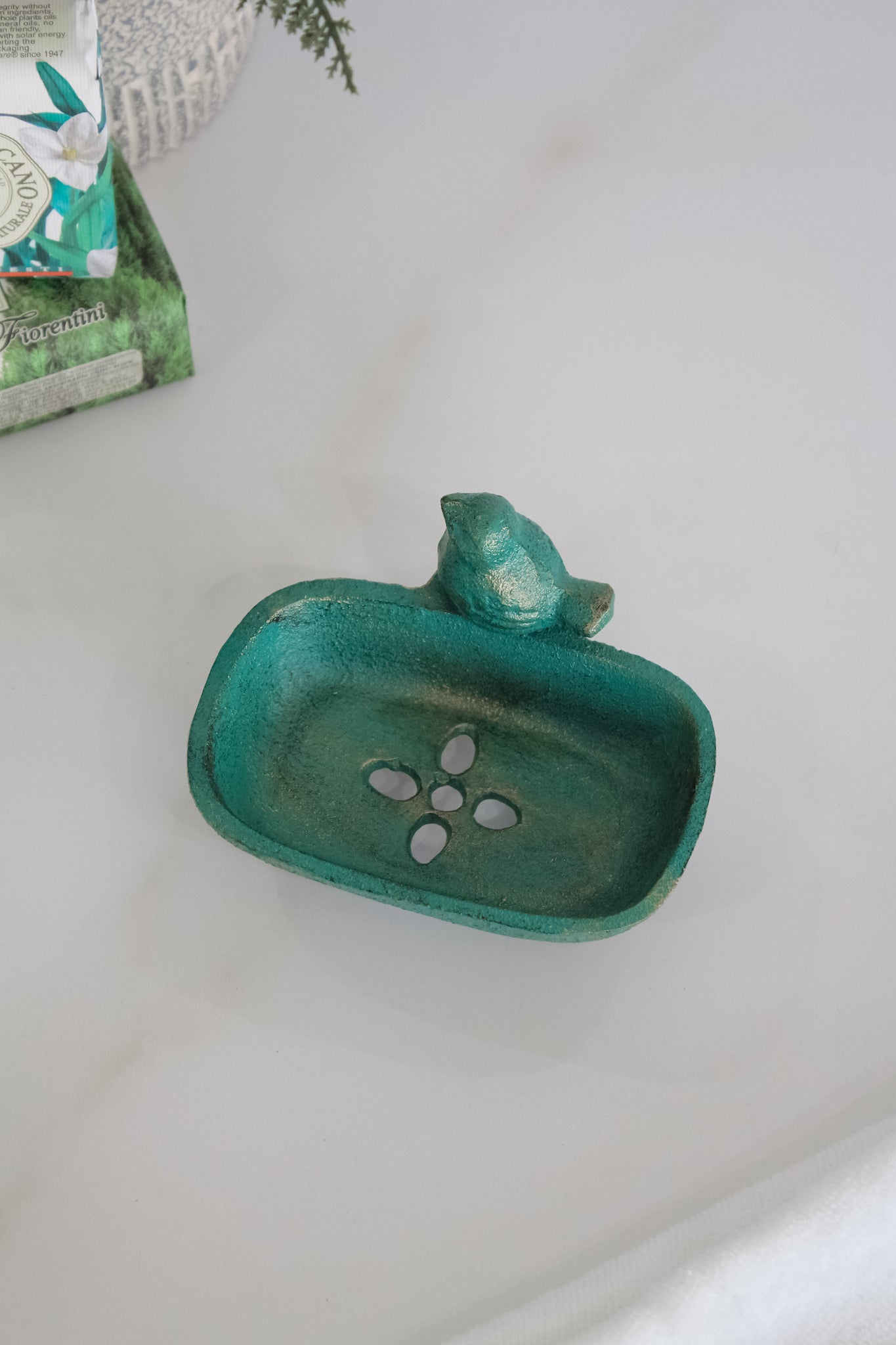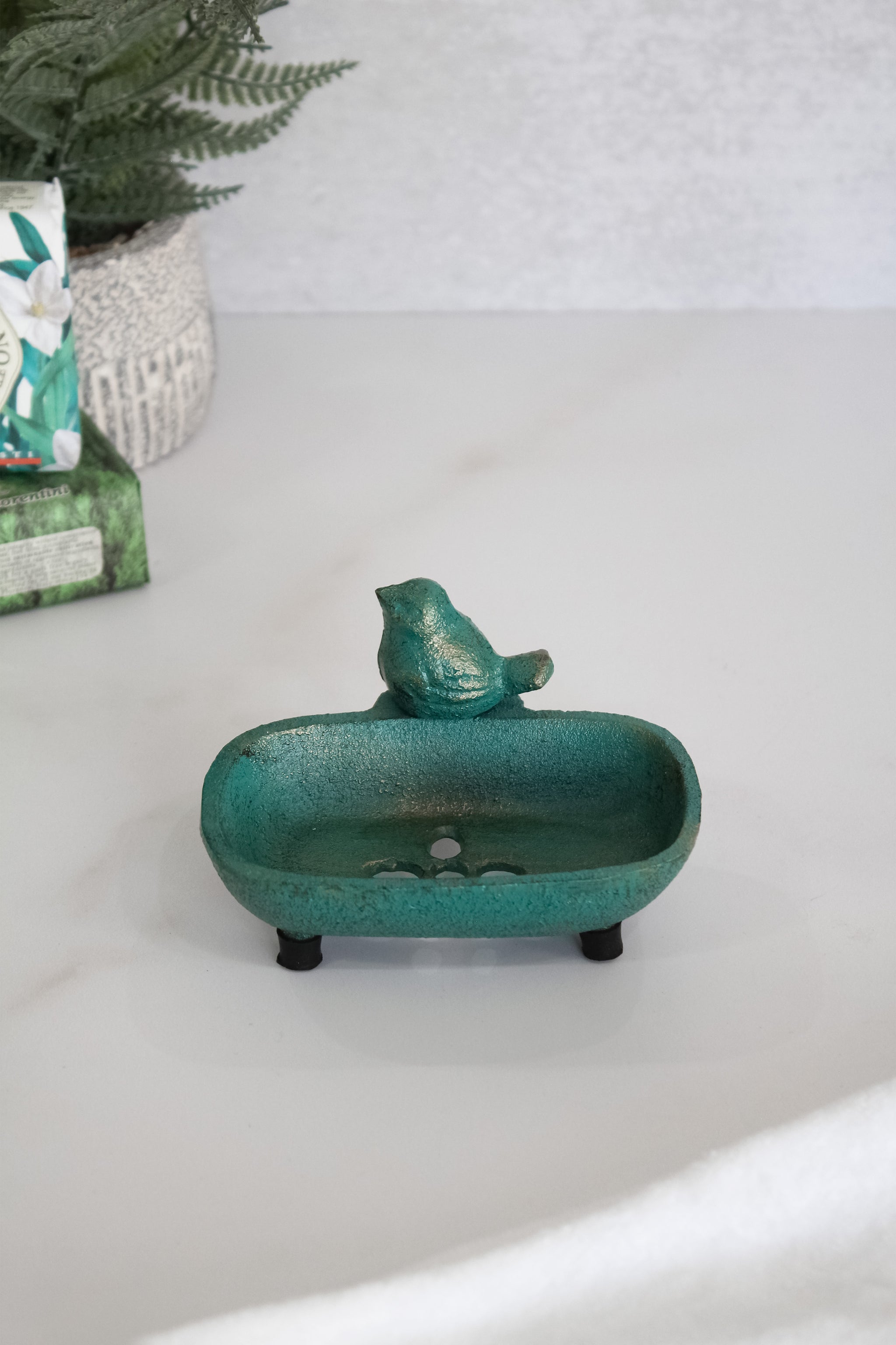 Jabonera de fierro ovalada color turquesa con detalles envejecidos dorados, y una figura de pájaro en el borde. Un modelo clásico, pero que le entrega esa pequeña cuota de color a tu baño para una decoración sencilla, pero entretenida.