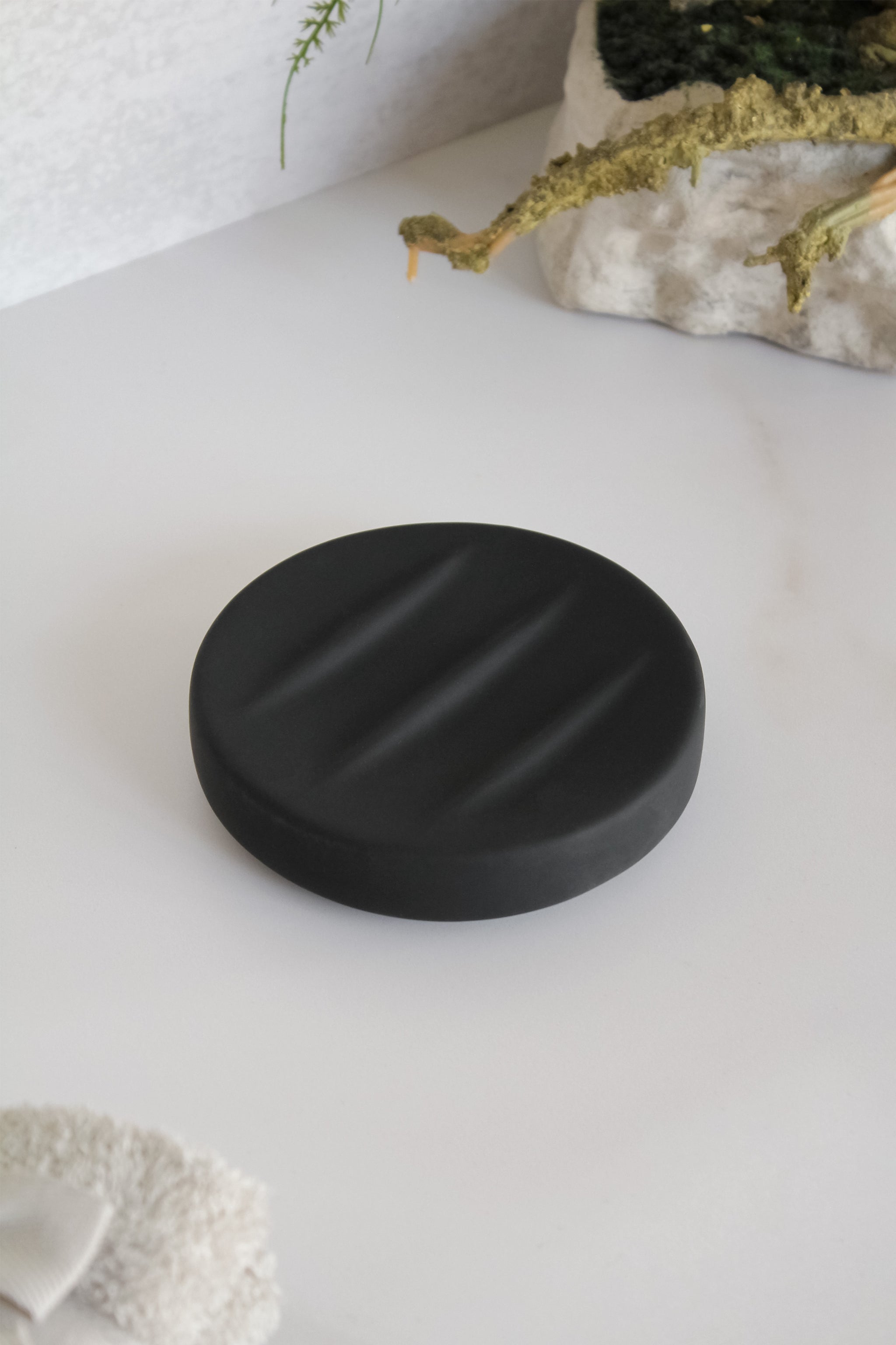 Jabonera de cerámica lisa, en color negro mate. Un modelo sencillo y elegante, que se roba miradas. Te recomendamos montarlo con un bonito jabón en barra para darle un toque decorativo además de funcional.