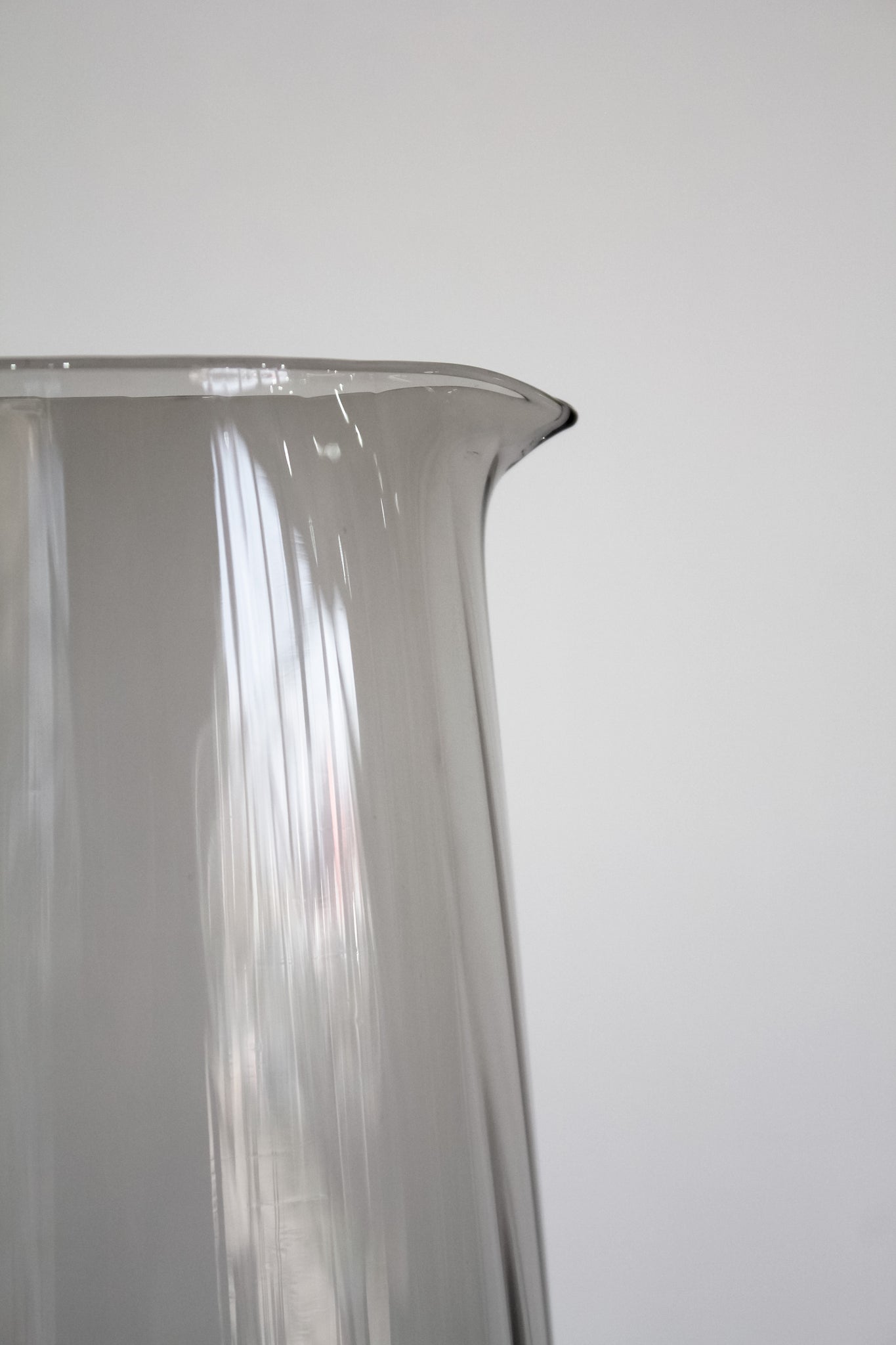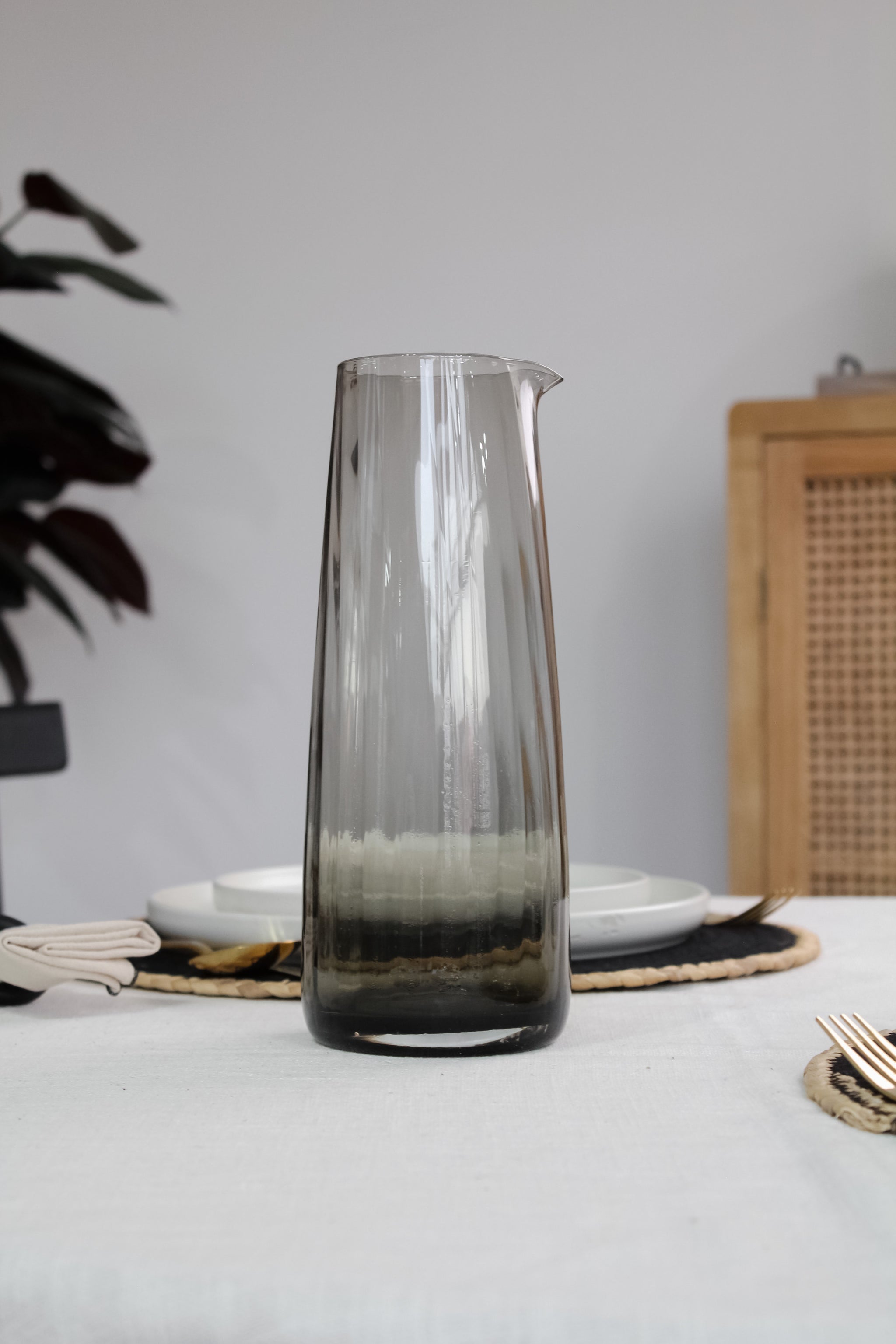 Jarra de vidrio color negro transparente. Un modelo simple, pero moderno, con relieve en todo su cuerpo y boca para facilitar servir cualquier preparación. Puedes servirlo con agua, jugo o un rico pisco sour para el aperitivo.