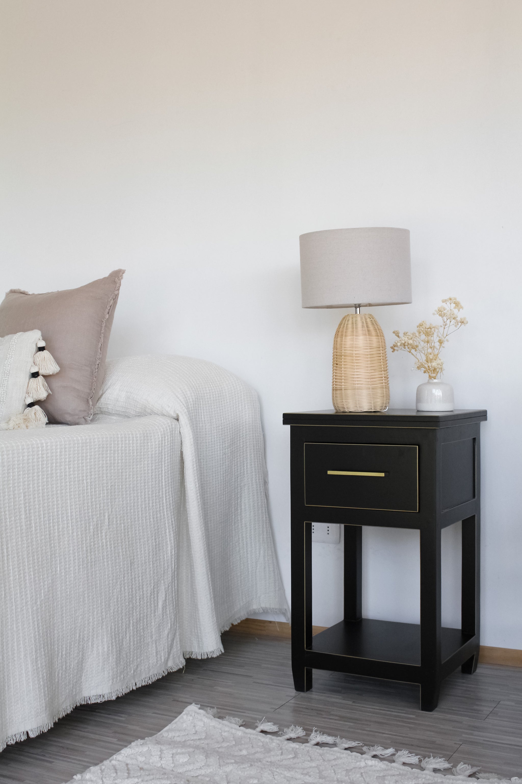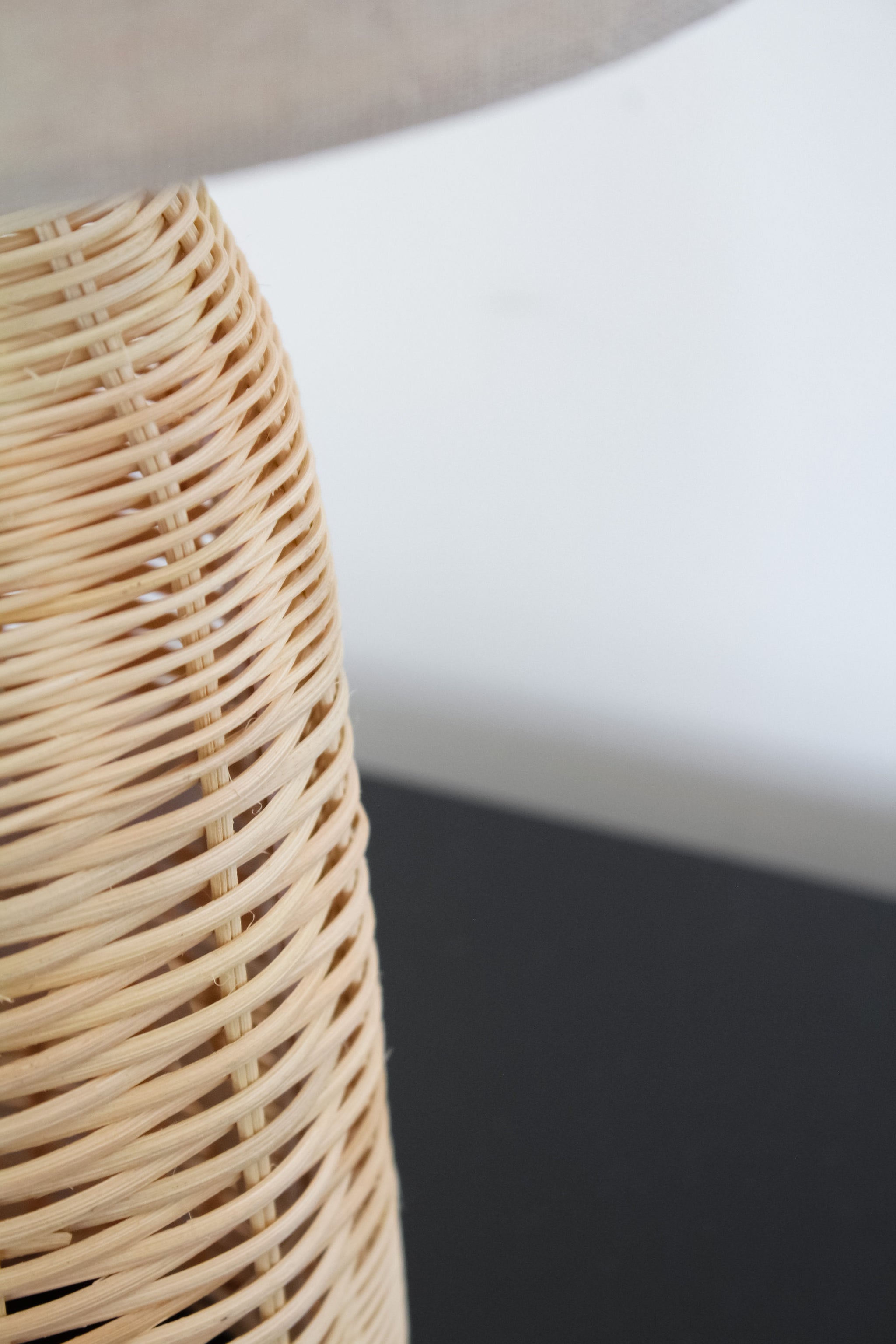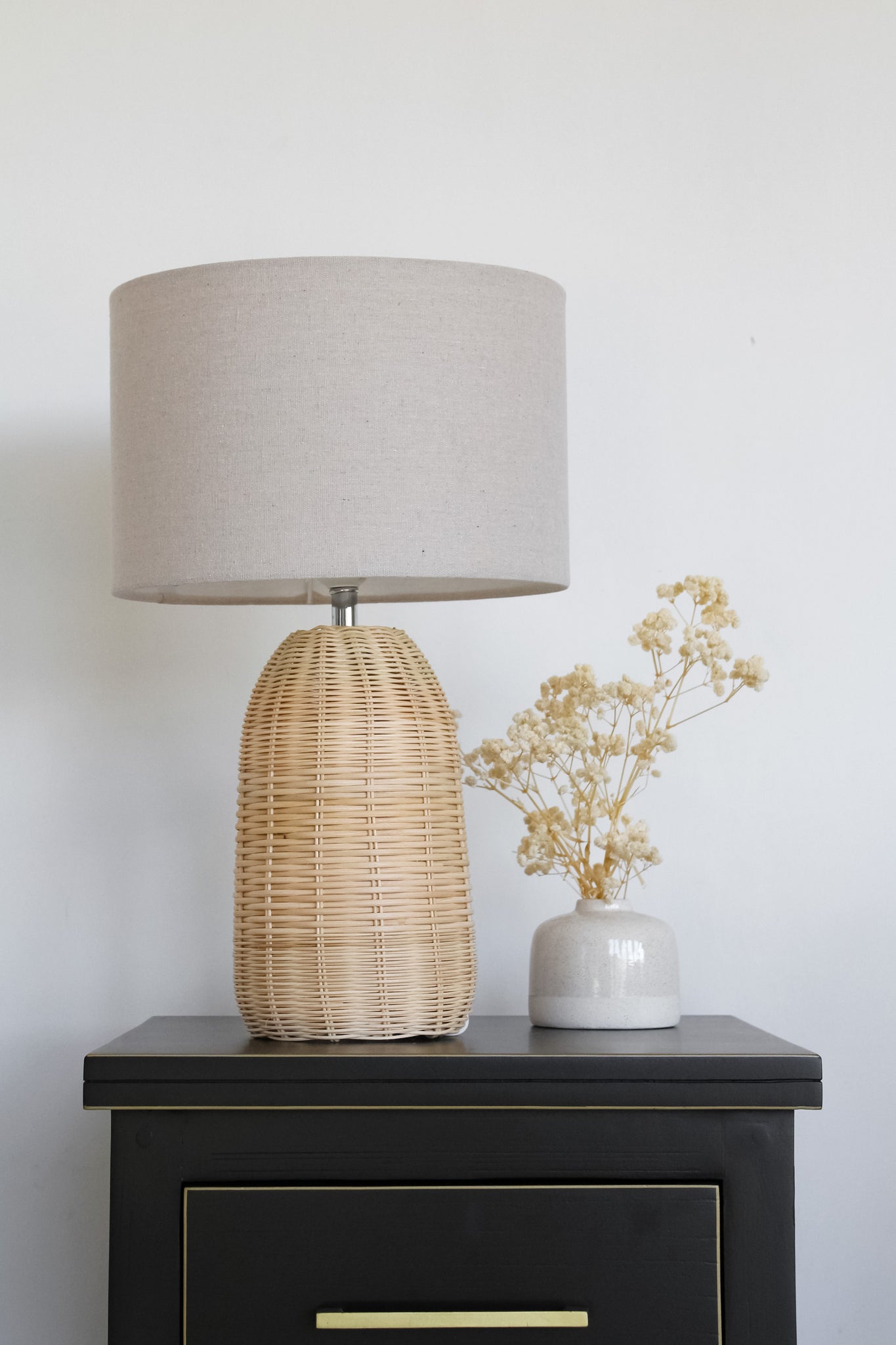 Lámpara confeccionada en mimbre con pantalla de tela en color beige. Un modelo precioso para montar en veladores y aportar un aire cálido al dormitorio.