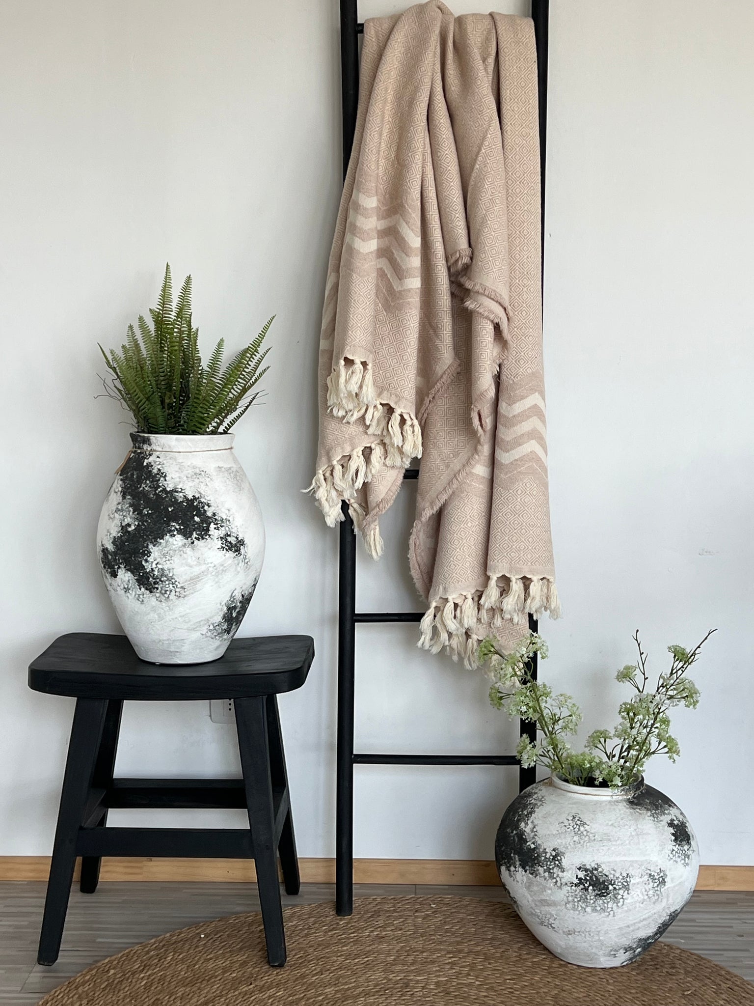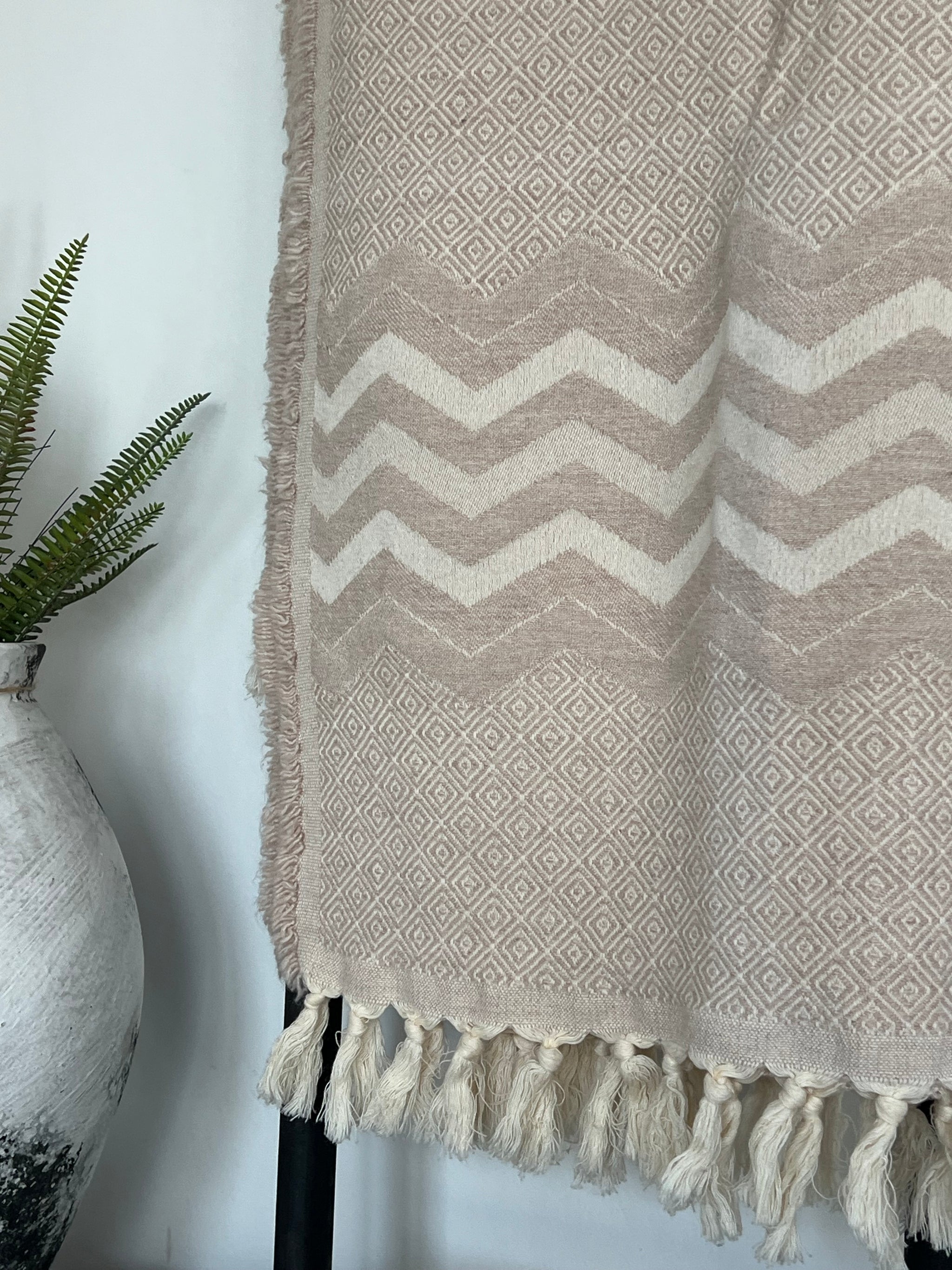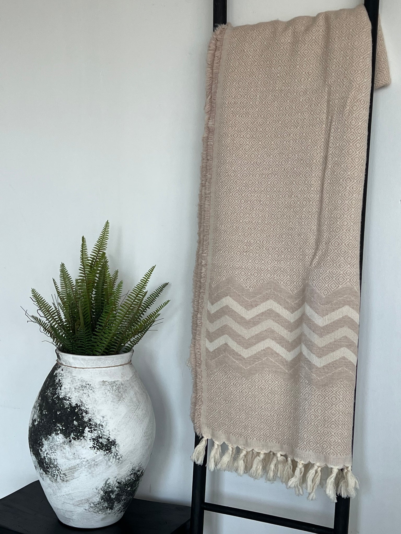Una manta verdaderamente exquisita. Confeccionada en algodón en tonos beige y palo rosa. Si lo que buscas es agregar un toque de color, pero que sea sobrio, este modelo de manta es el indicado.