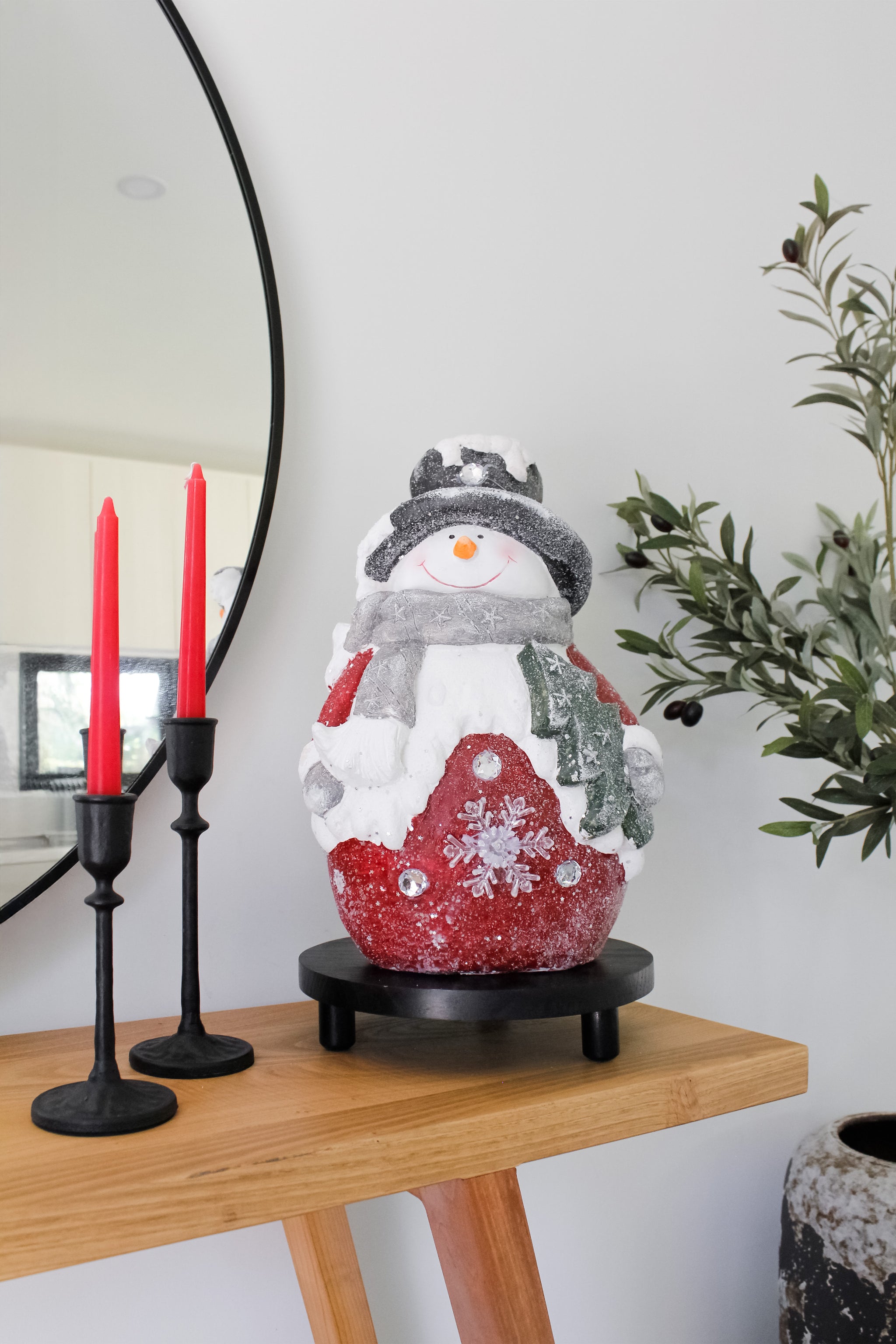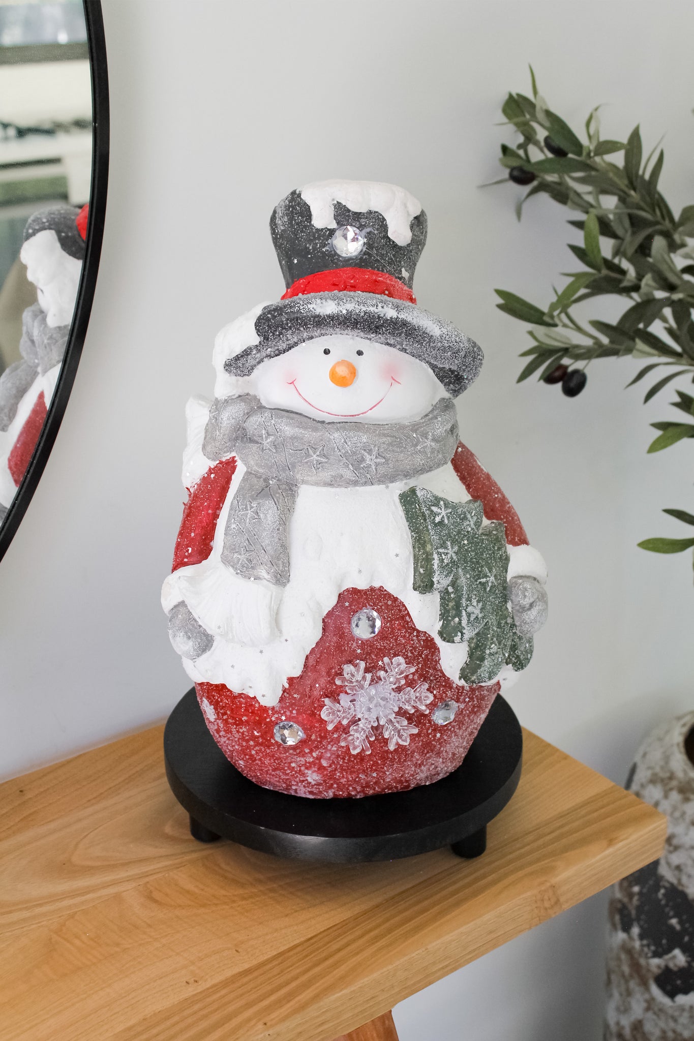 Muñeco de nieve de cerámica en tonos blanco, rojo, verde y tonos grises, con detalles brillantes y luz led cálida. Un modelo de gran tamaño que empapa tu espacio con ese espíritu navideño que buscamos para estas fiestas. Es perfecto para decorar un rincón o la entrada de la casa, sin recargar de más. Y en la noche, puedes prenderlo y su asterisco en el centro se ilumina de manera cálida y sutil.