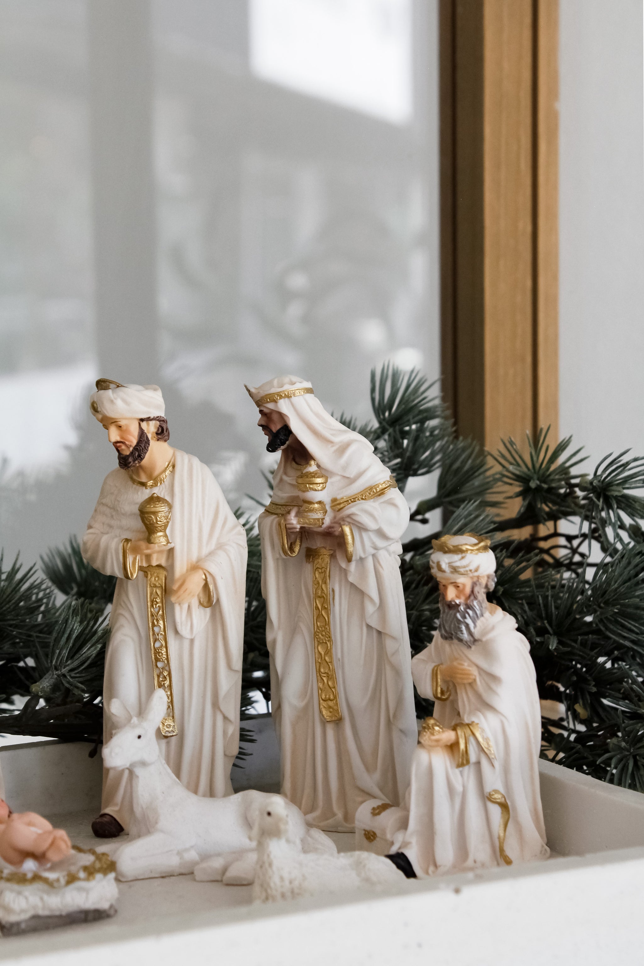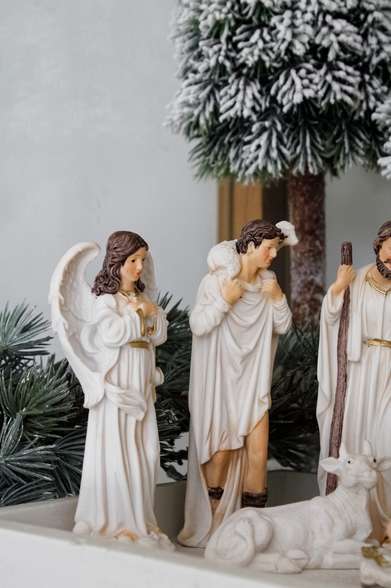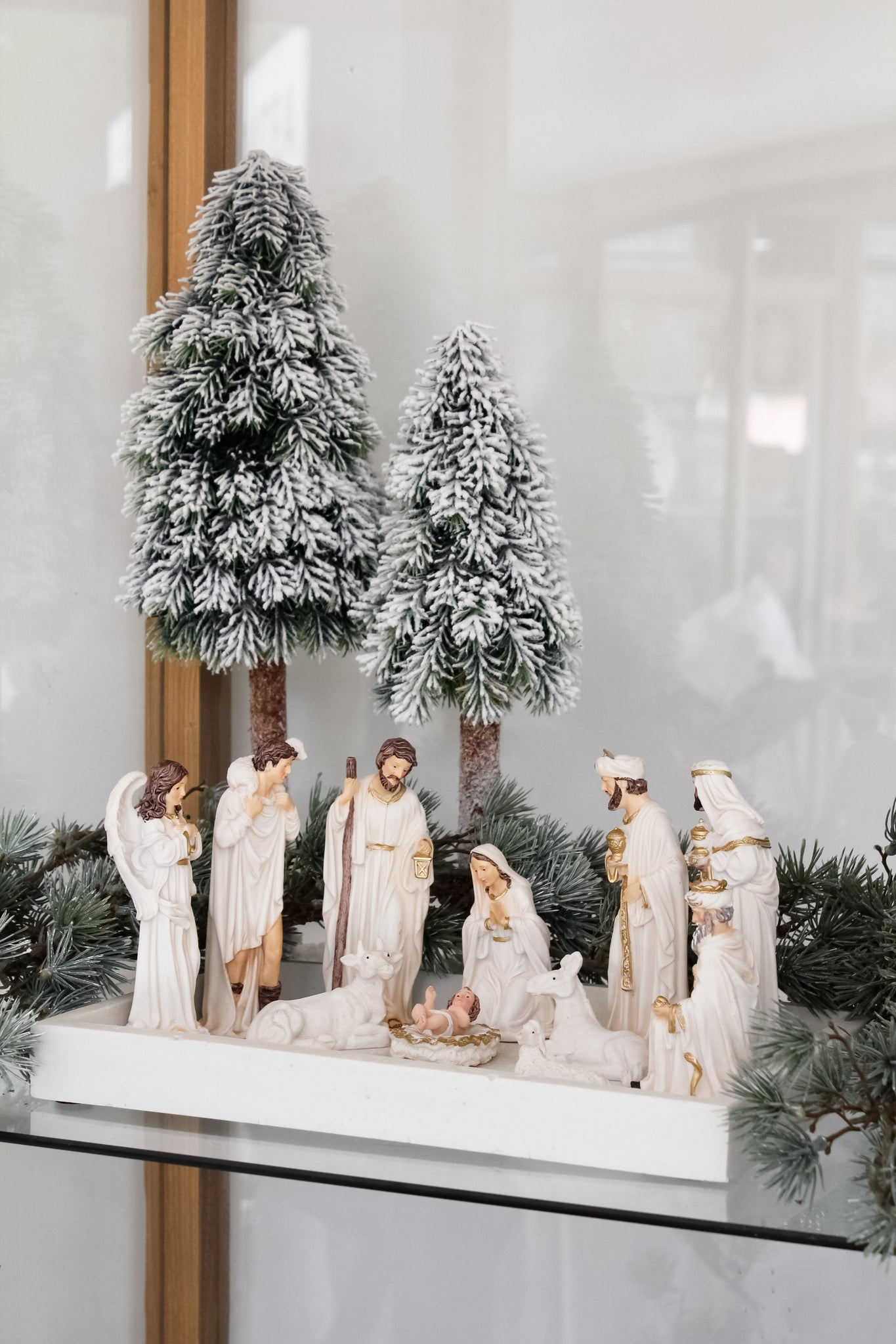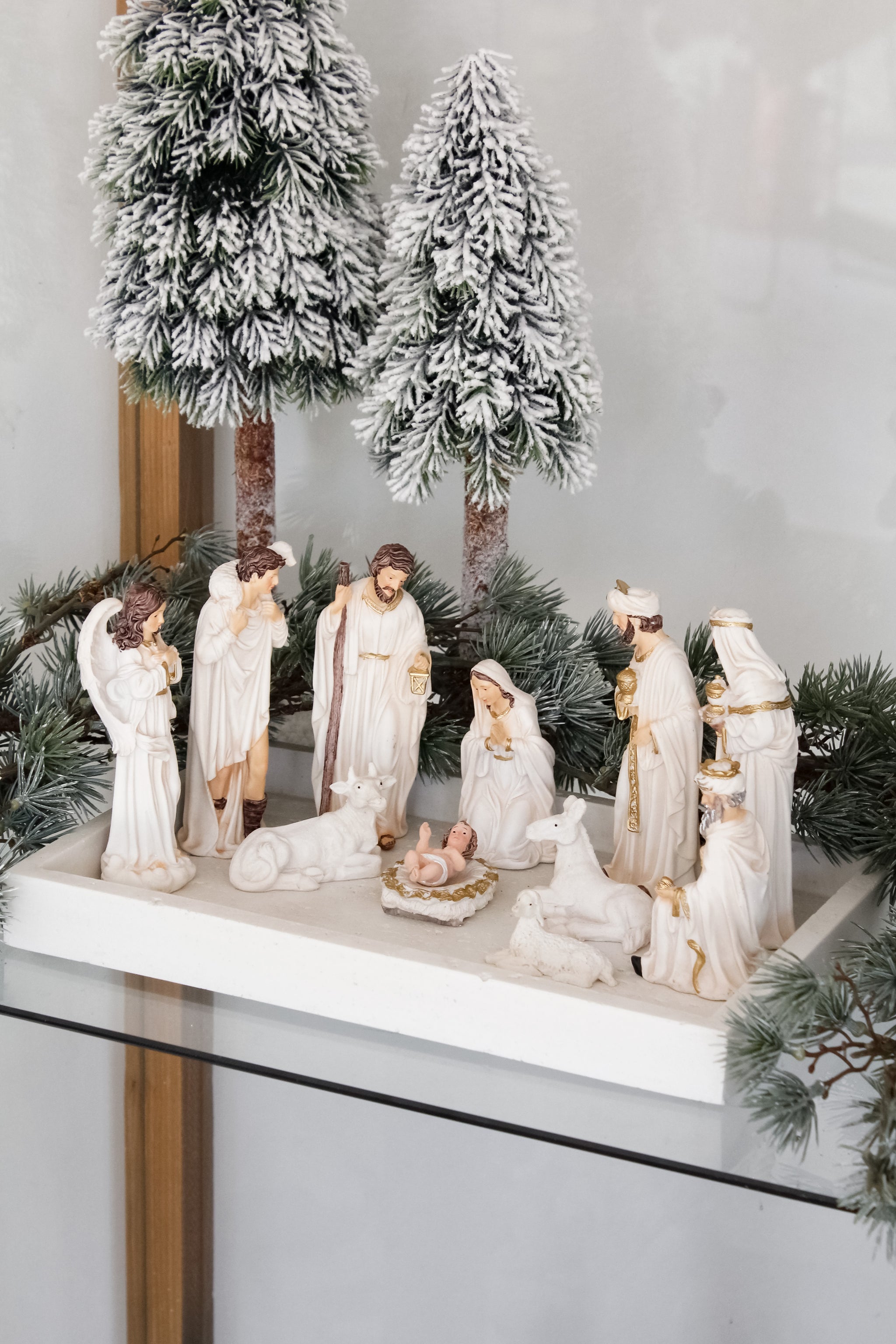 Maravilloso pesebre de poliresina de doce piezas. Perfecto para agregar un toque de elegancia y paz a tu hogar en estas fiestas. De un color blanco crudo y detalles en café y dorado principalmente, crea un ambiente suave y sofisticado que complementa cualquier estilo decorativo.
