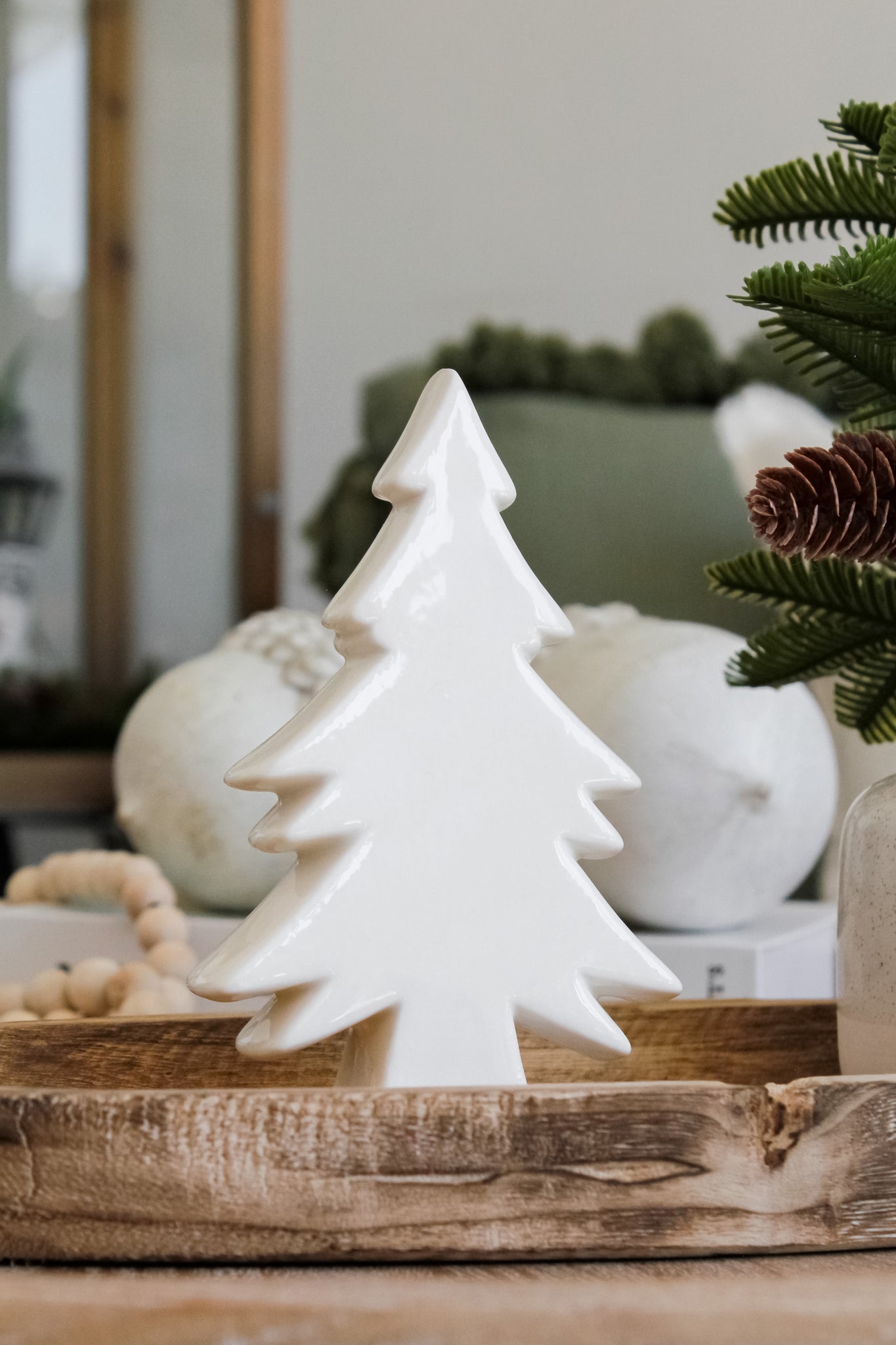 Pino de navidad de cerámica color blanco y con diseño liso. Un modelo sencillo, elegante y perfecto para decorar en estas fiestas sin recargar el espacio. Si quieres sumar un toque navideño sutil, esto es para ti.