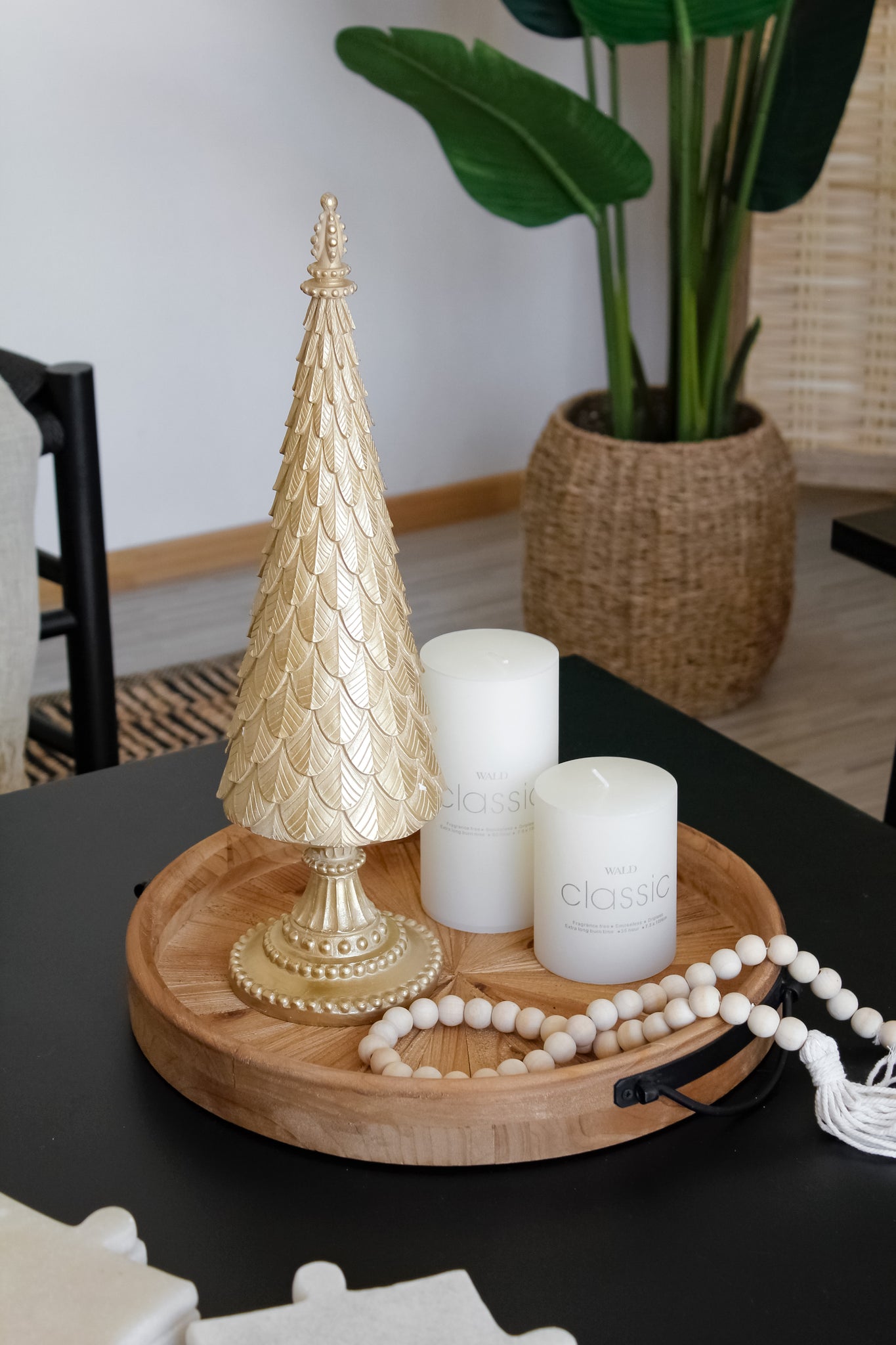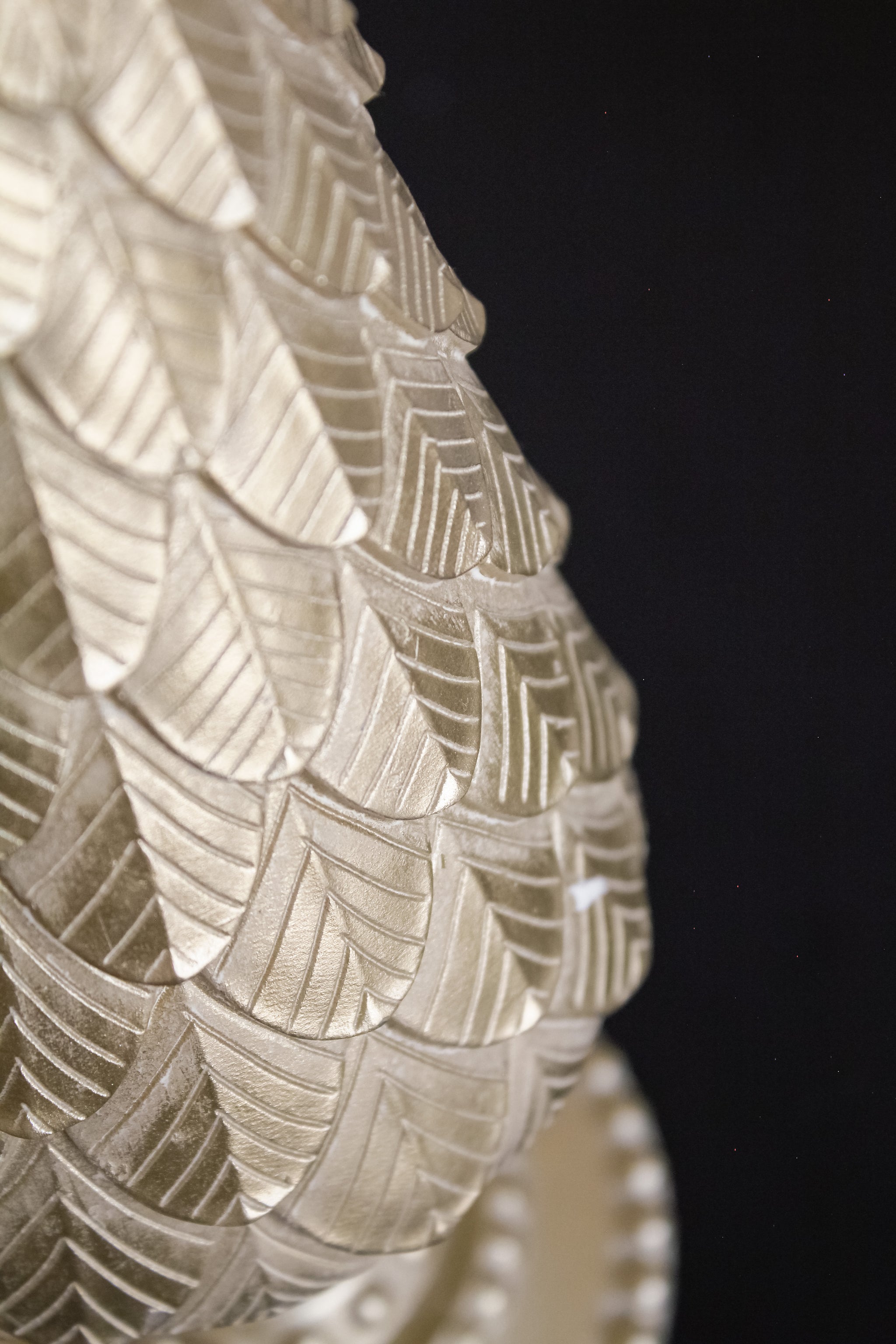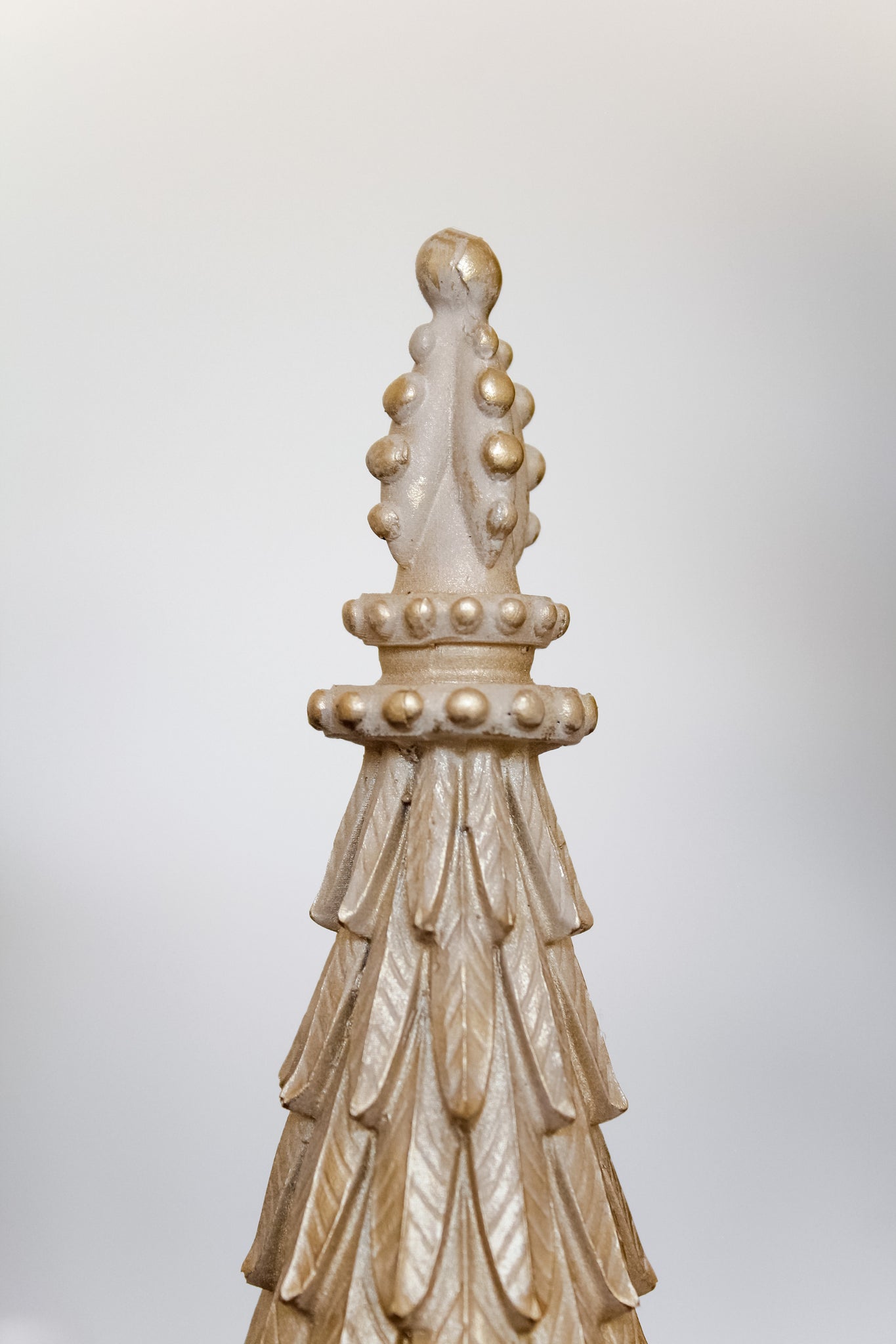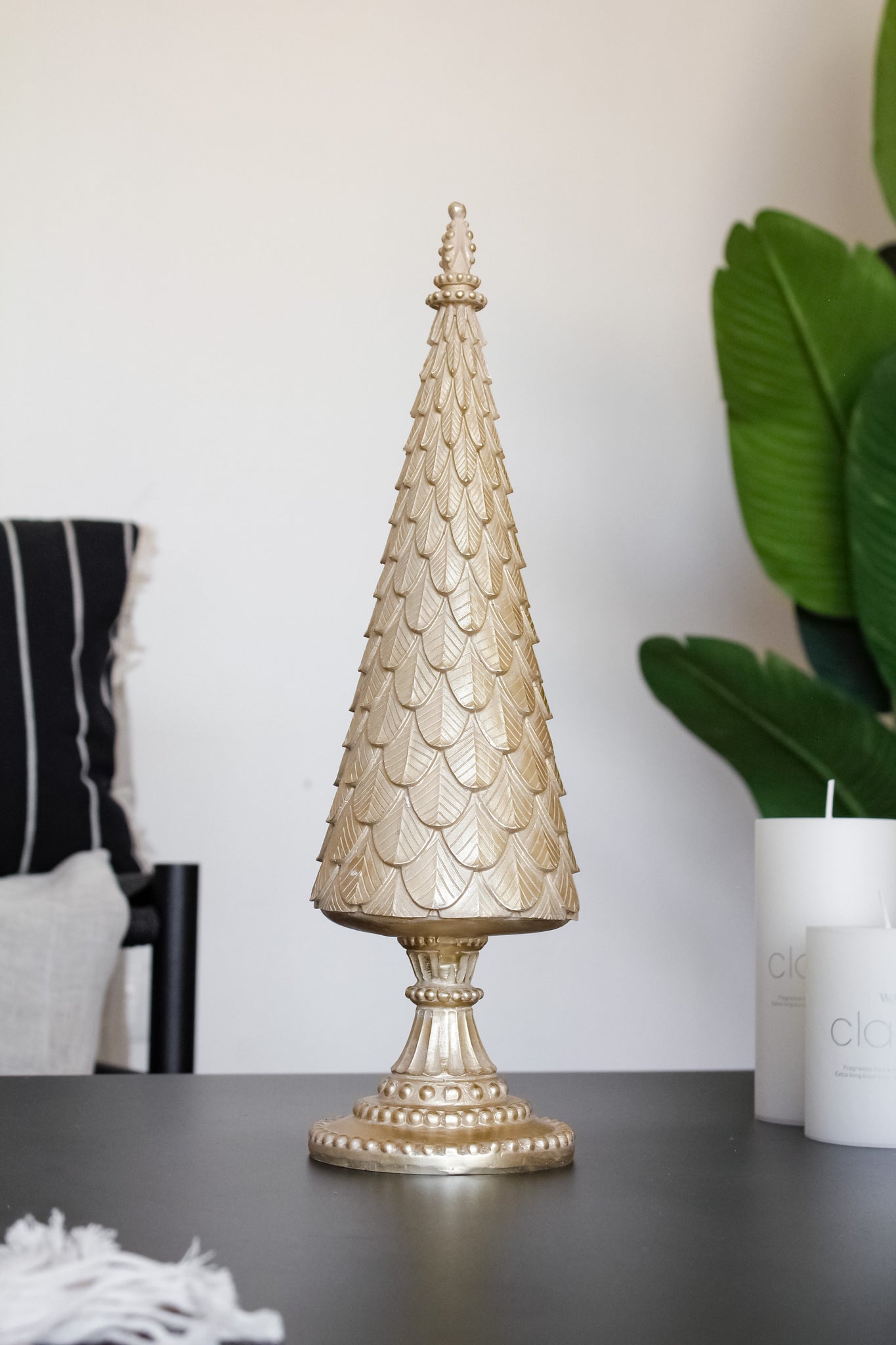 Pino de navidad de poliresina, color dorado y con diseño tallado. Un modelo único e imponente, que entrega ese aire navideño a cualquier rincón donde lo pongas. Puedes montarlo en tu mesa de centro acompañado de un par de velas para una decoración sutil, también en alguna repisa para darle protagonismo o donde tu quieras. Siempre se va a lucir!