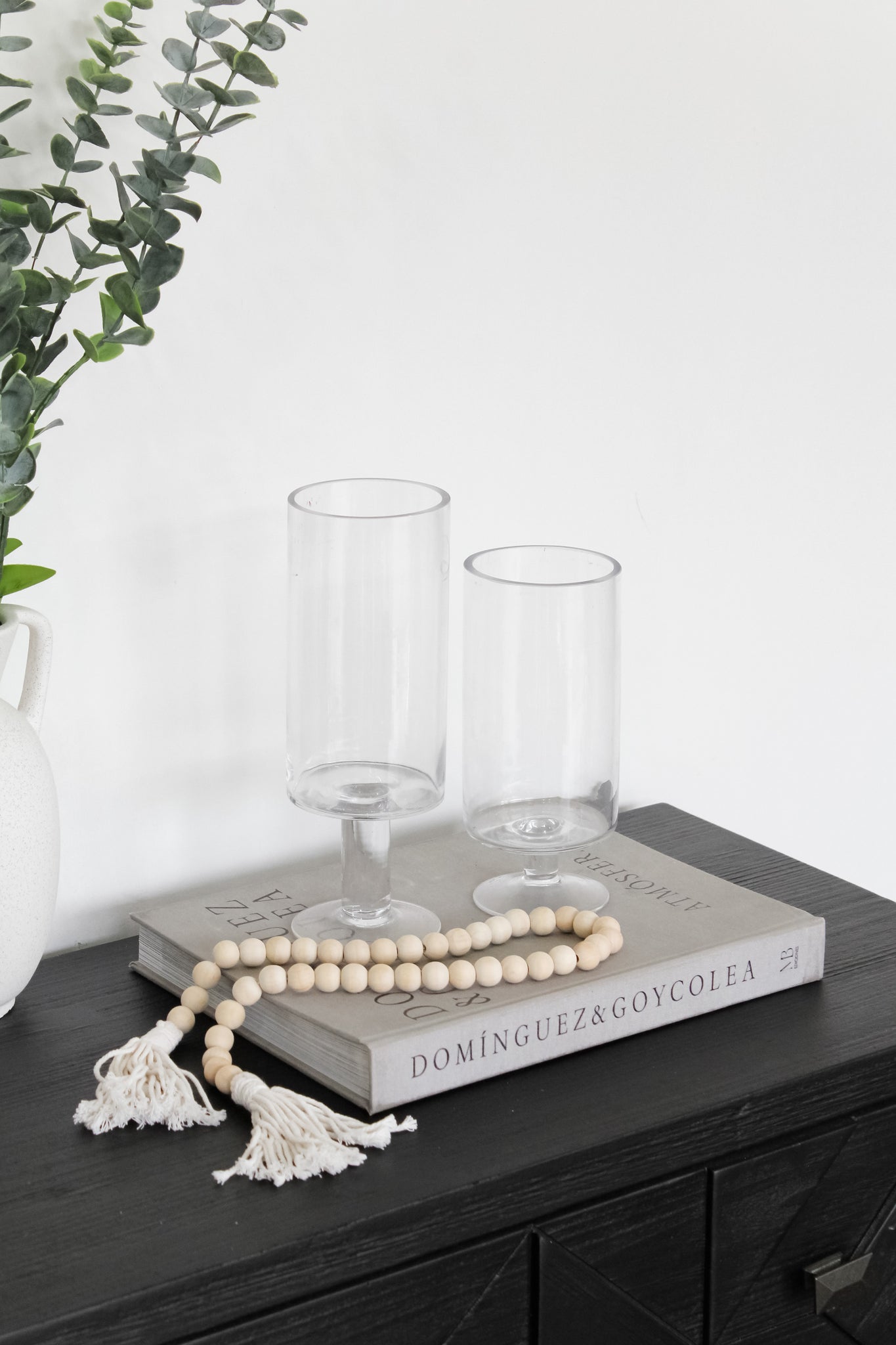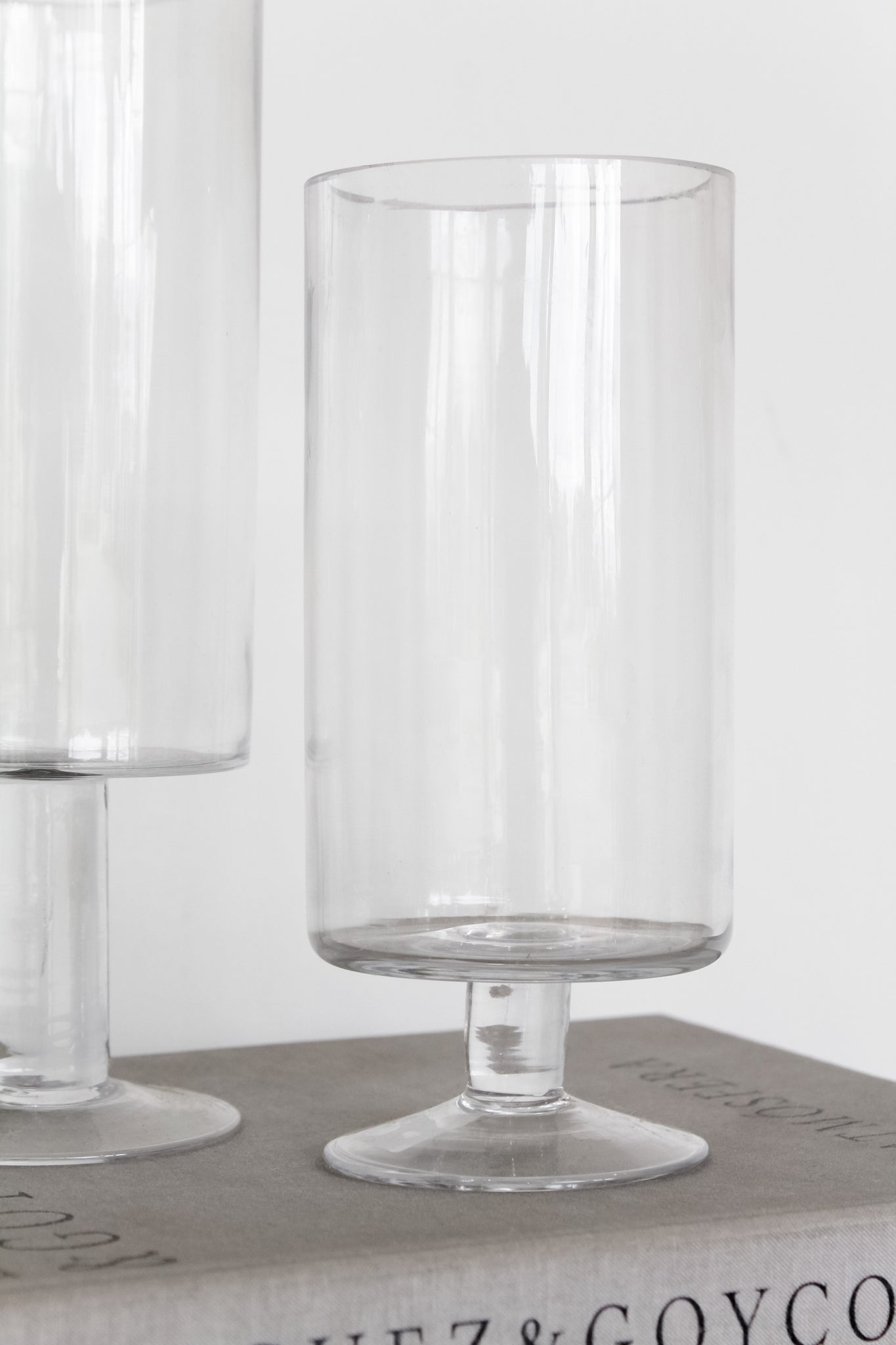 Portavela de vidrio tipo copón, disponible en dos tamaños. Simple, pero precioso en su diseño limpio y minimalista. Puedes montarlos juntos para generar esa diferencia de altura, con la vela que tu prefieras y puede ser sobre un libro acompañado de una borla para darle movimiento al espacio. Sin duda será un acierto.