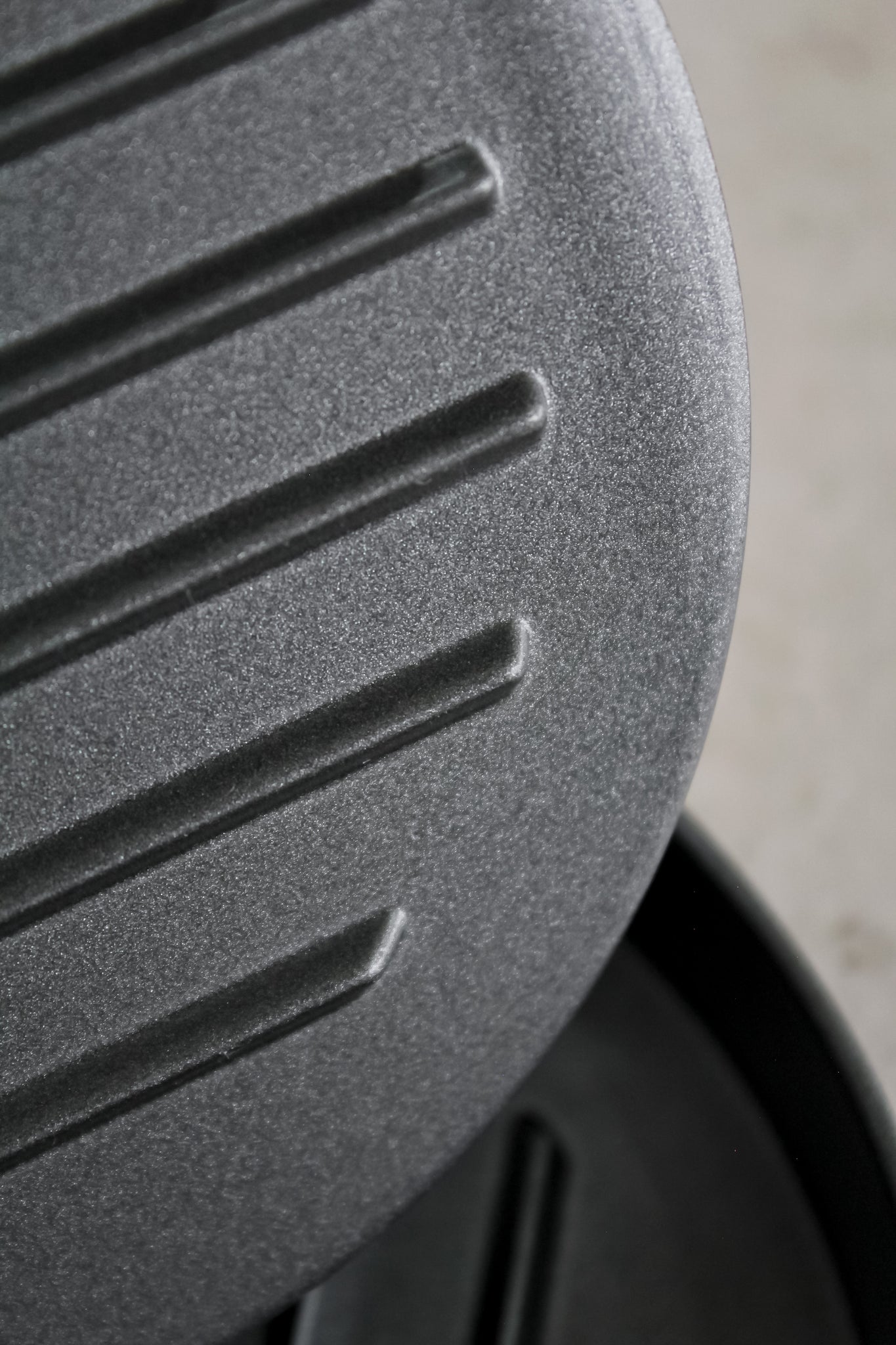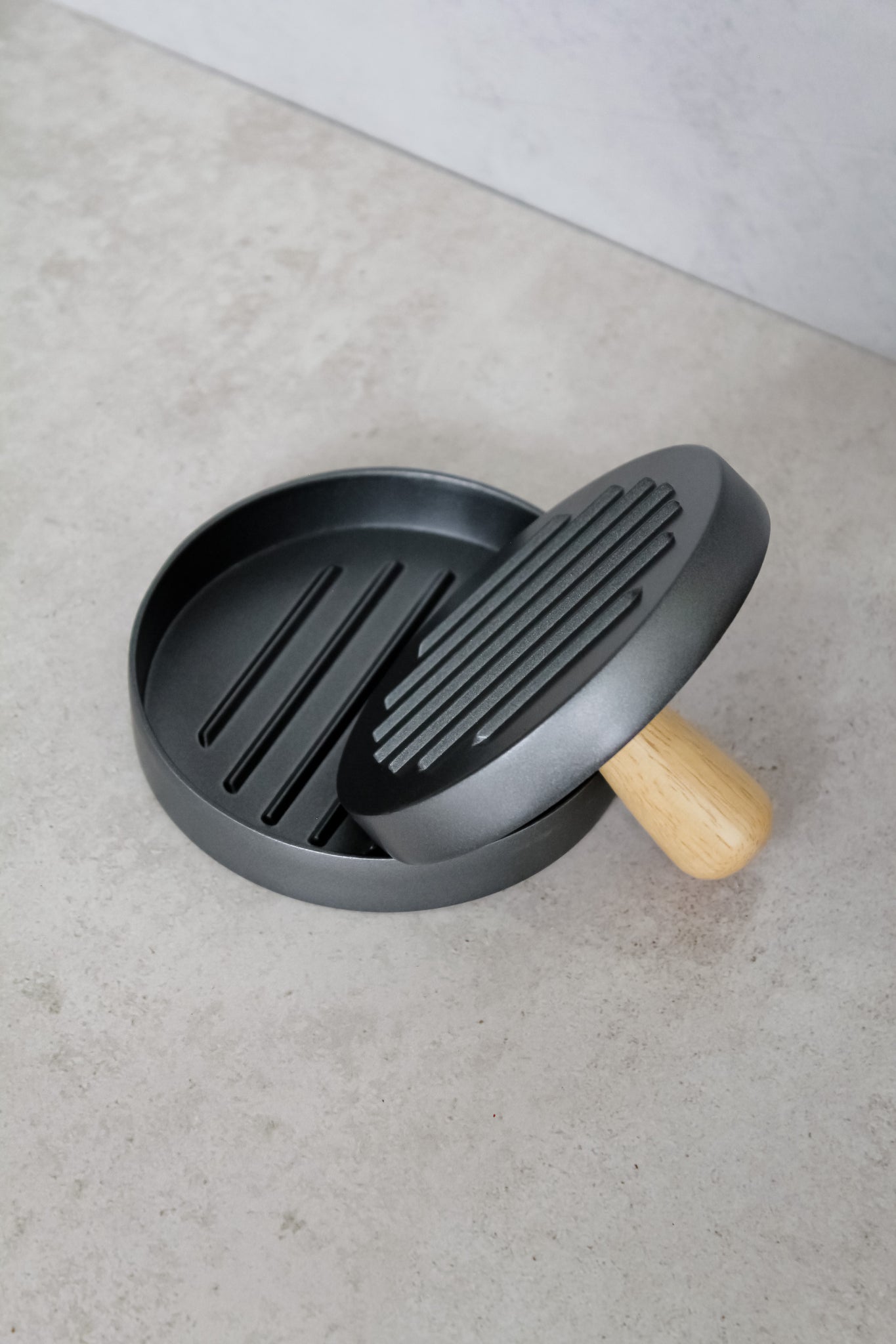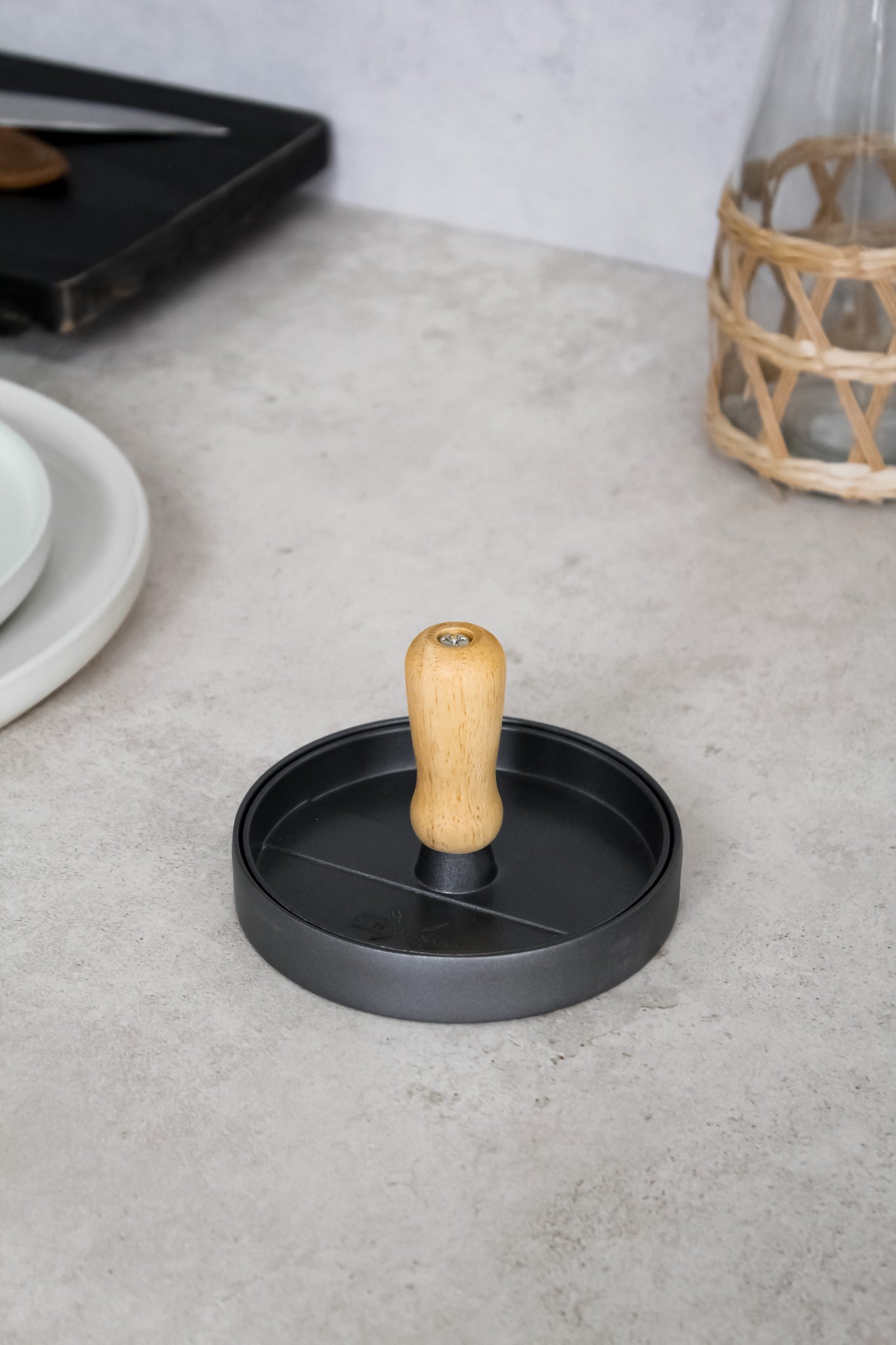 Prensa de hamburguesa de aluminio en color gris grafito, con mango de madera. Un excelente producto para hacer unas exquisitas hamburguesas caseras y sorprender a tus invitados. Es super fácil de manipular y de un tamaño ideal para guardarla en cualquier parte.