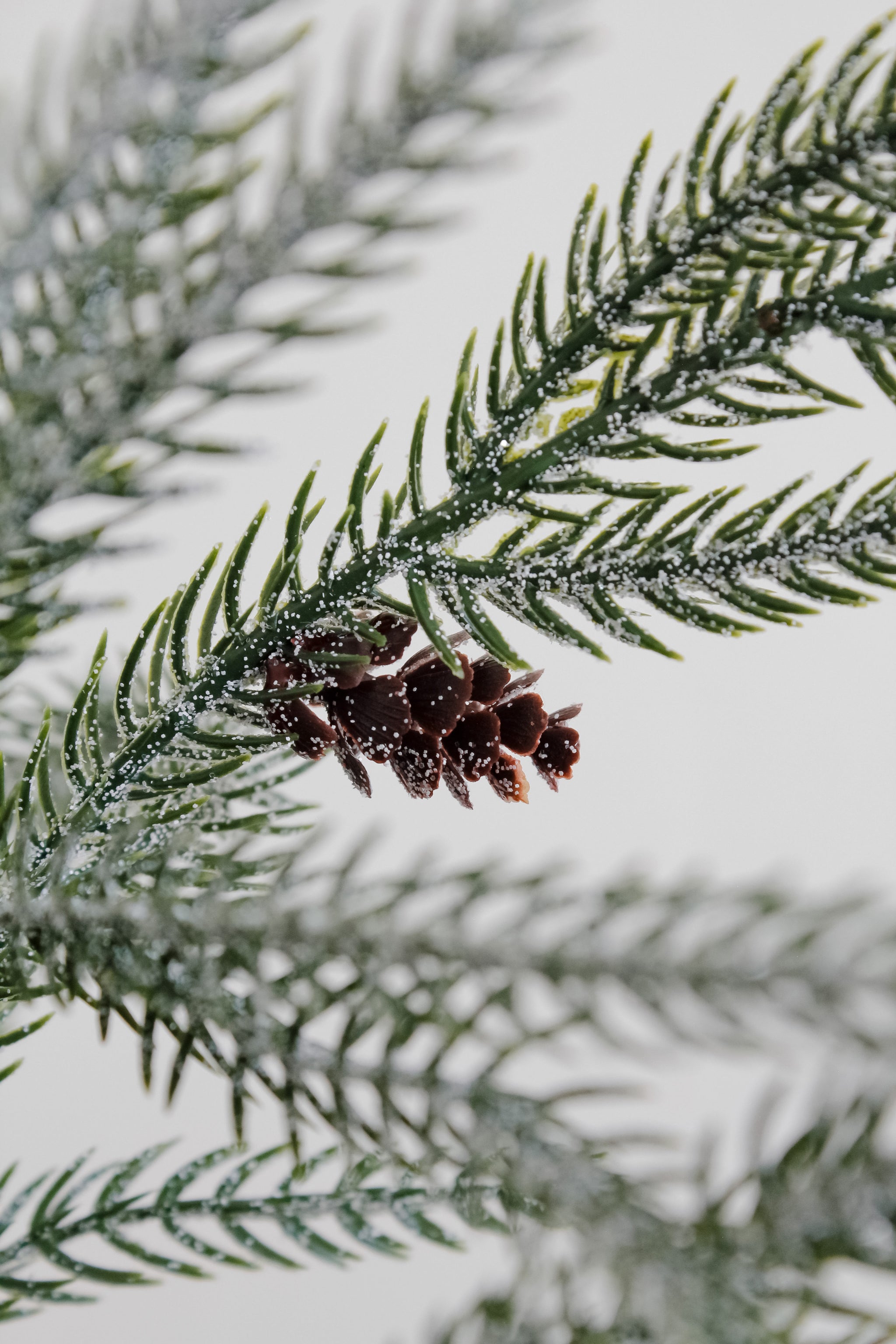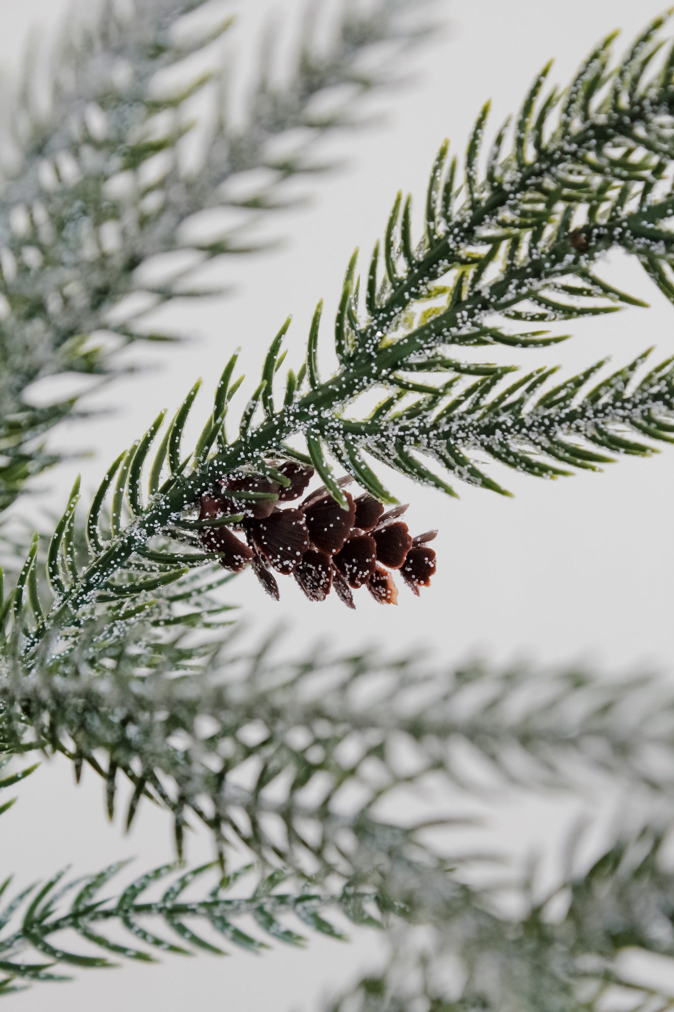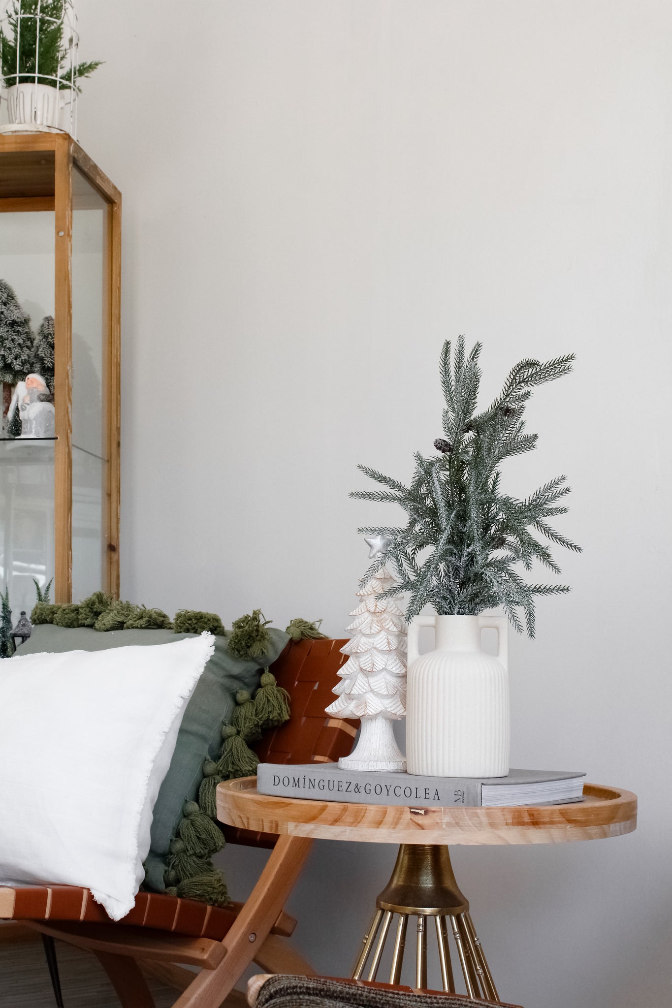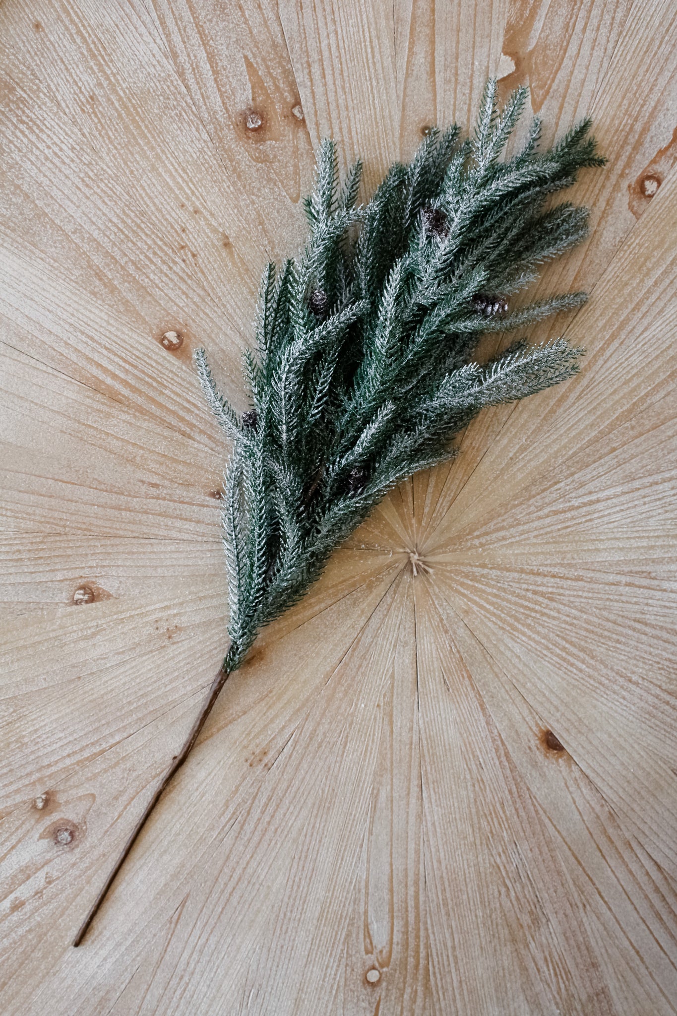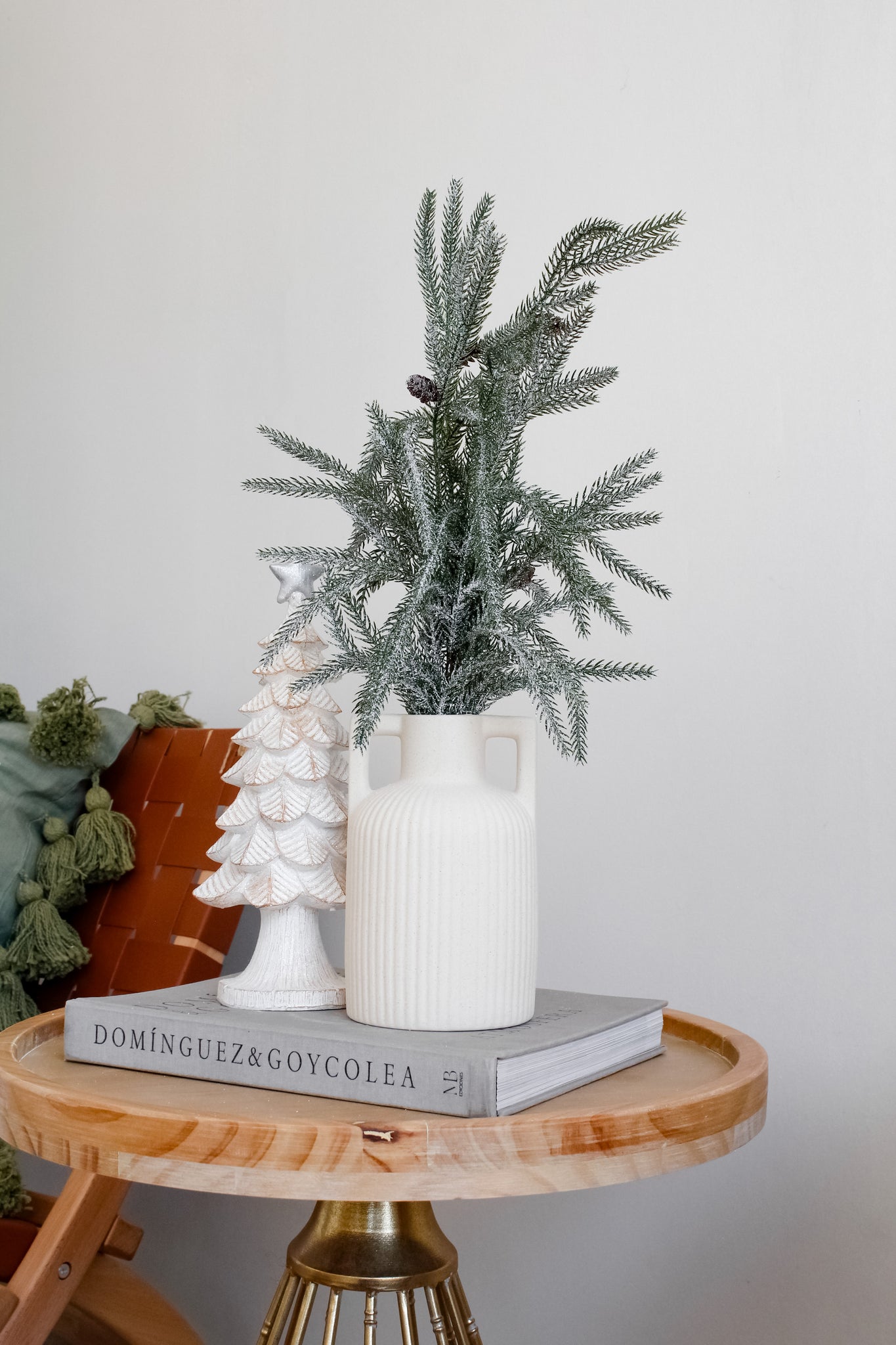 Imitación de rama de pino con brillos y piñas. Un modelo que transmite ese espíritu navideño de manera más sencilla y entregando luz, pero sin recargar el espacio. Perfecto para montarlo en un florero sobre una bandeja o caja libro, acompañado de una figura o vela para armar un conjunto natural y equilibrado.
