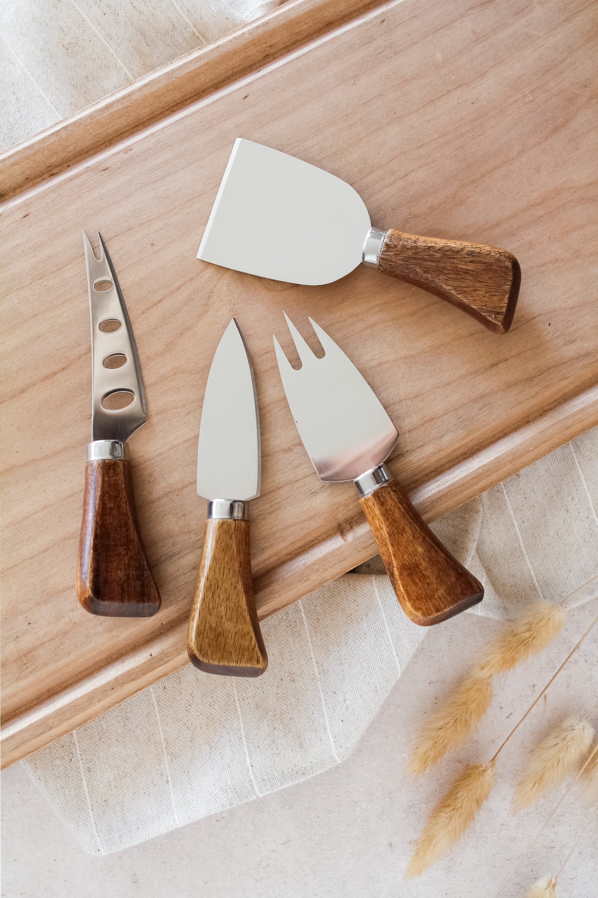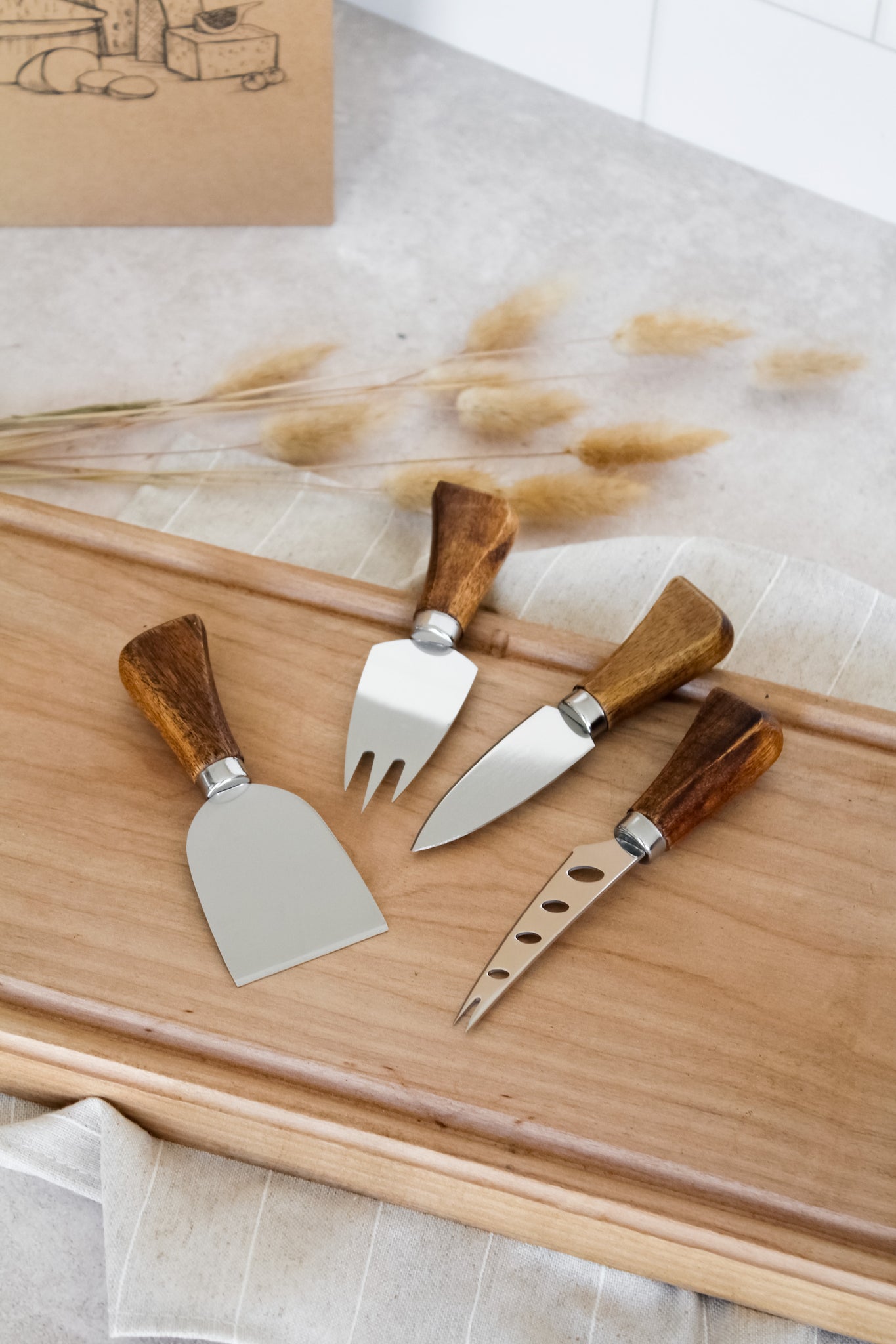 Set de cuatro cubiertos de aperitivo de metal y mango de madera. Un bonito detalle para complementar una exquisita tabla de quesos y dips, y complementar el look de manera sutil y elegante para recibir a tus invitados con las mejores preparaciones.