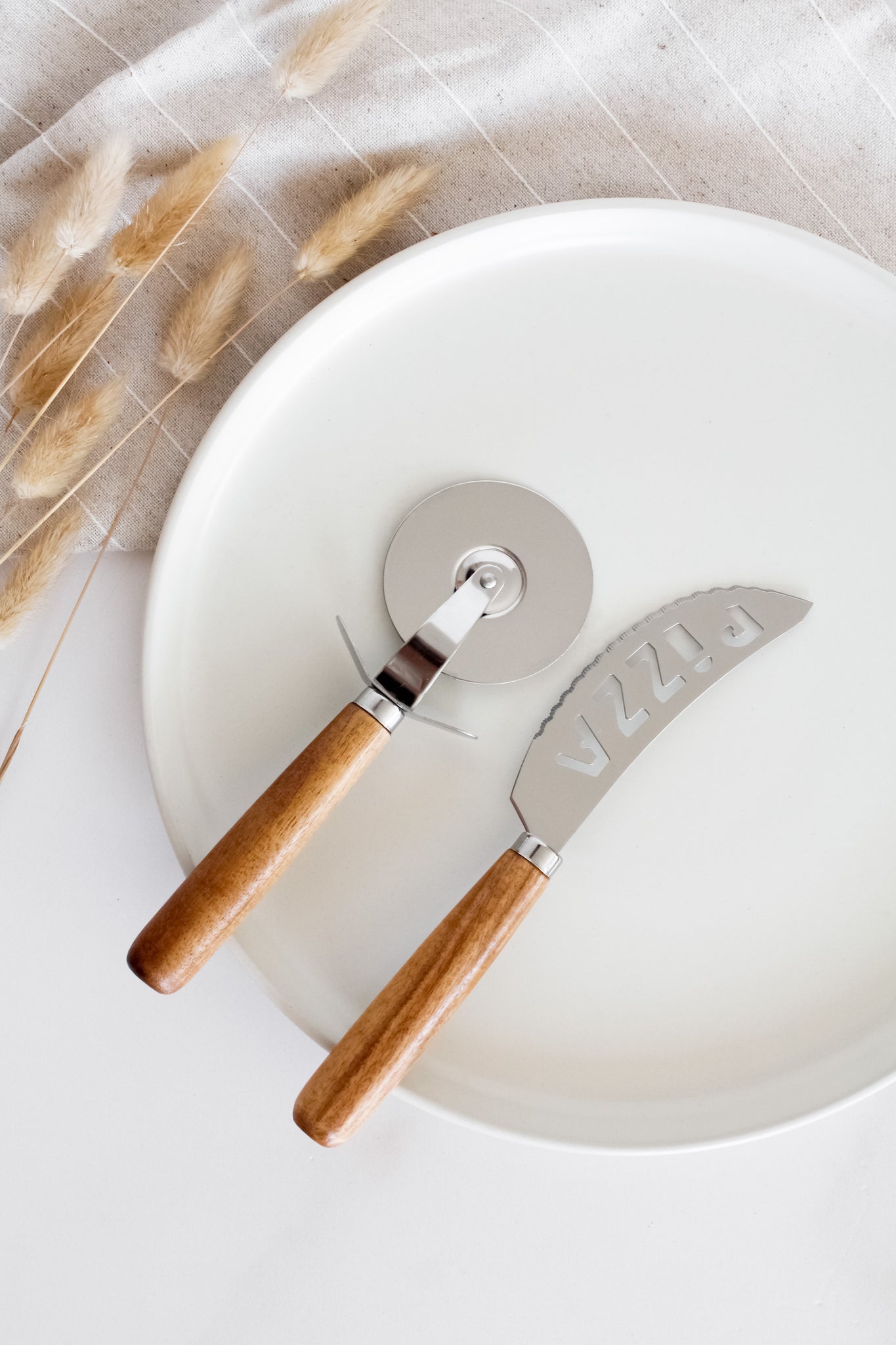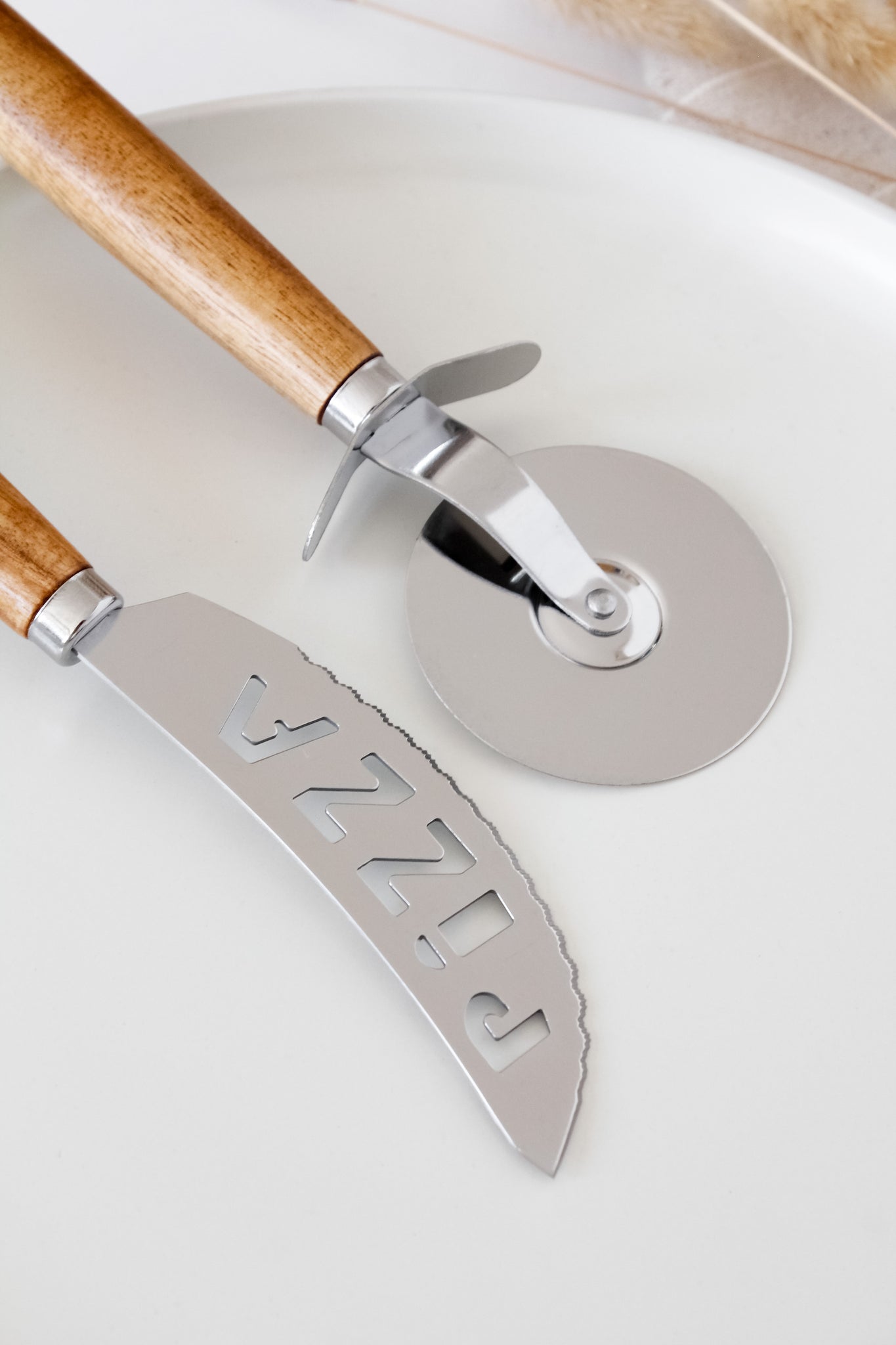 Set de cubiertos para pizza: cortador de rueda y cuchillo calado de metal y mango de madera. Un precioso detalle para complementar a la hora de preparar unas exquisitas pizzas y complementar el look de manera sutil y elegante para recibir a tus invitados con las mejores preparaciones.