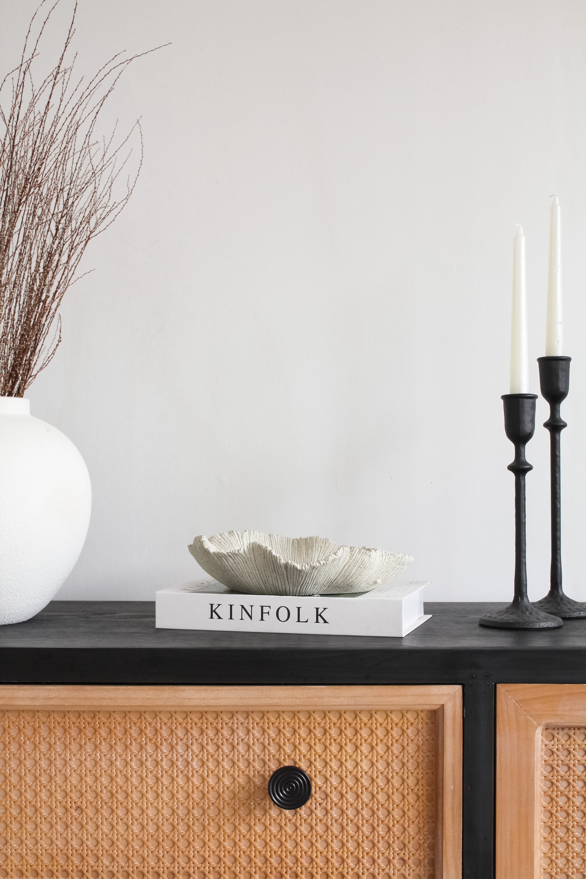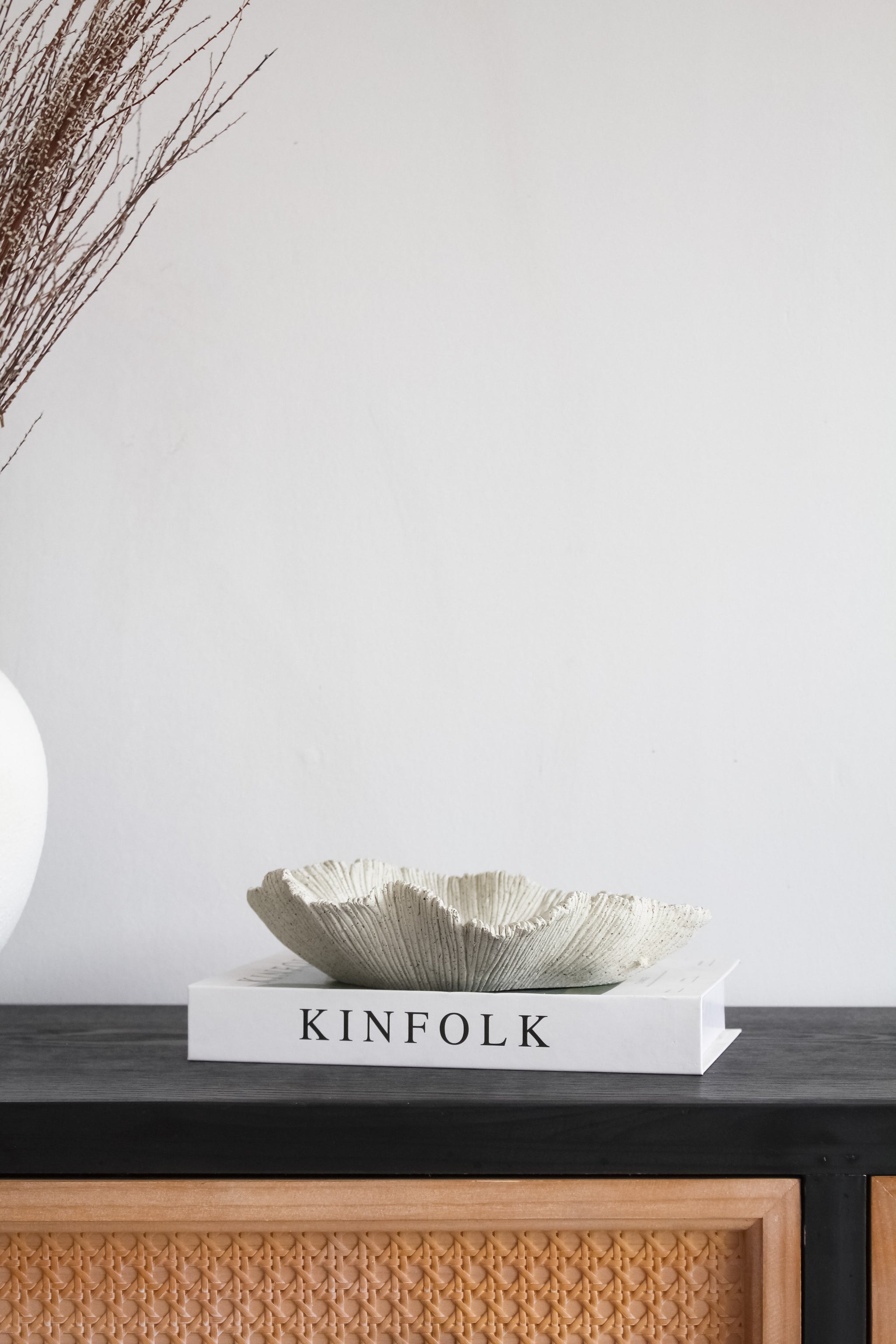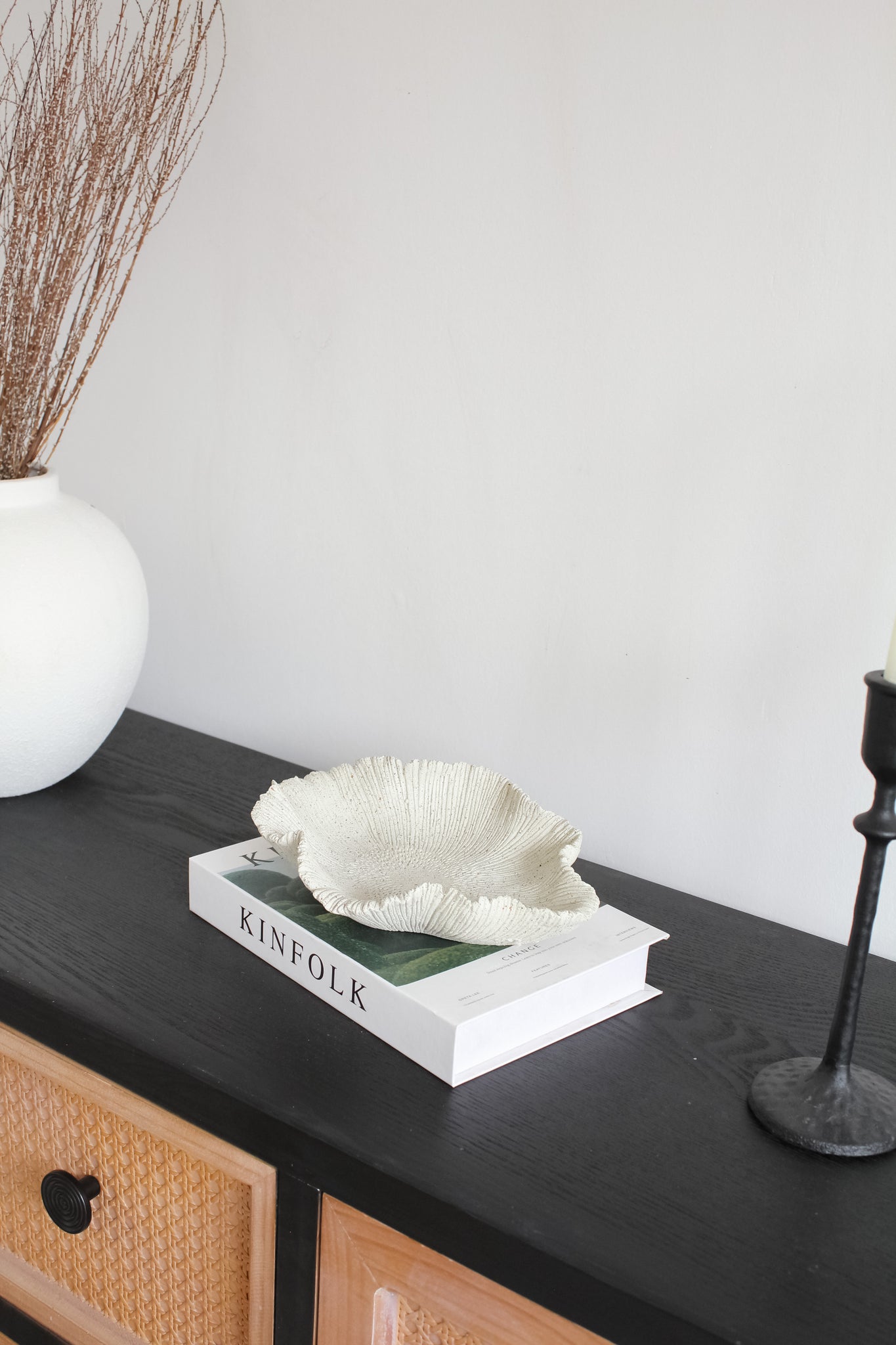 Su diseño destaca por su forma irregular con diseño plisado, se ve increíble en arrimos para dejar llaves, en mesas laterales con una borla en si a o con una velita para aportar un toque de calidez al espacio.