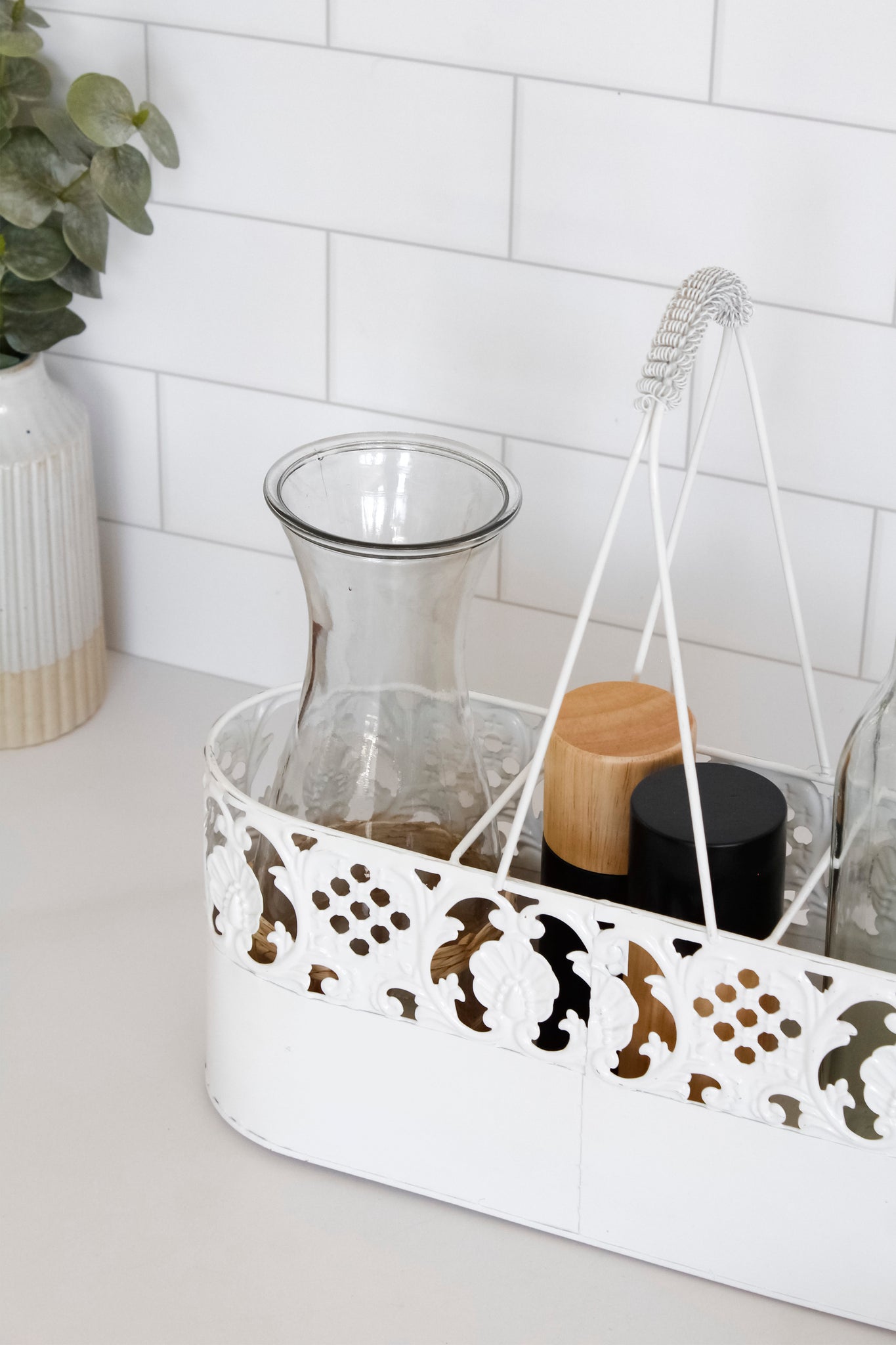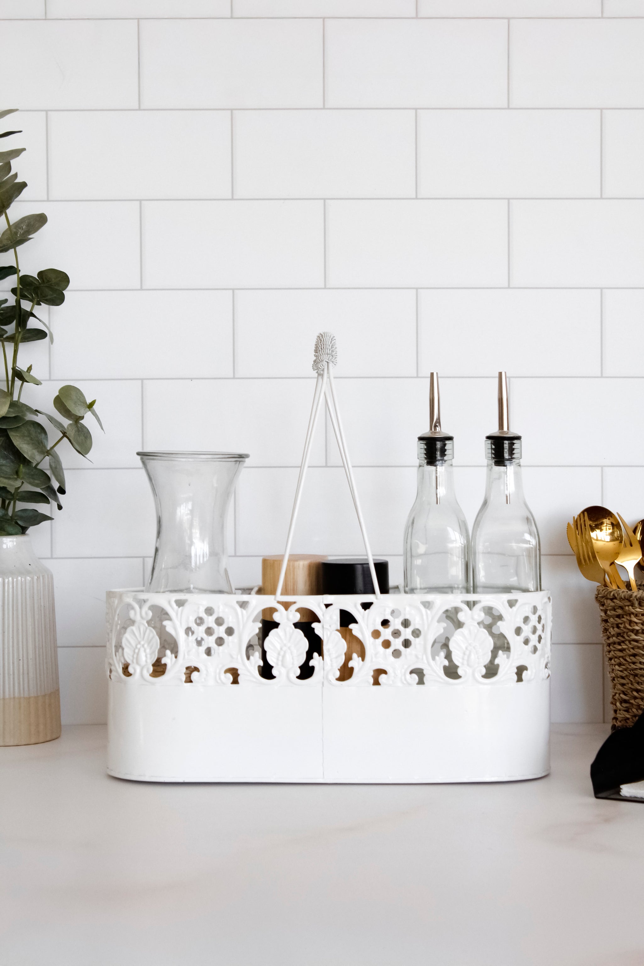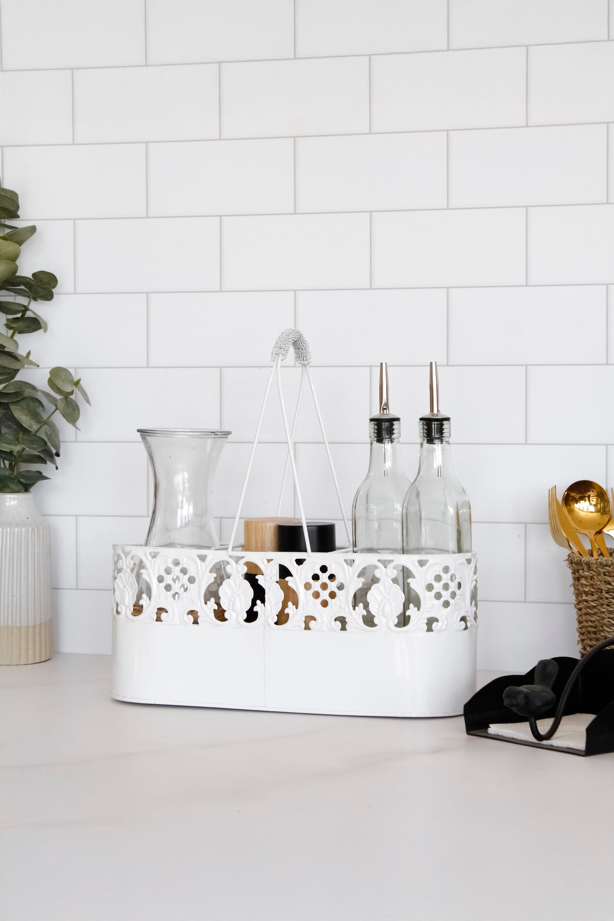 Un modelo sencillo, increíble para organizar tus aliños en la cocina o usarlo como alcuza para llevarlo directamente a la mesa. Es perfecto para darle un toque vintage a tu espacio.