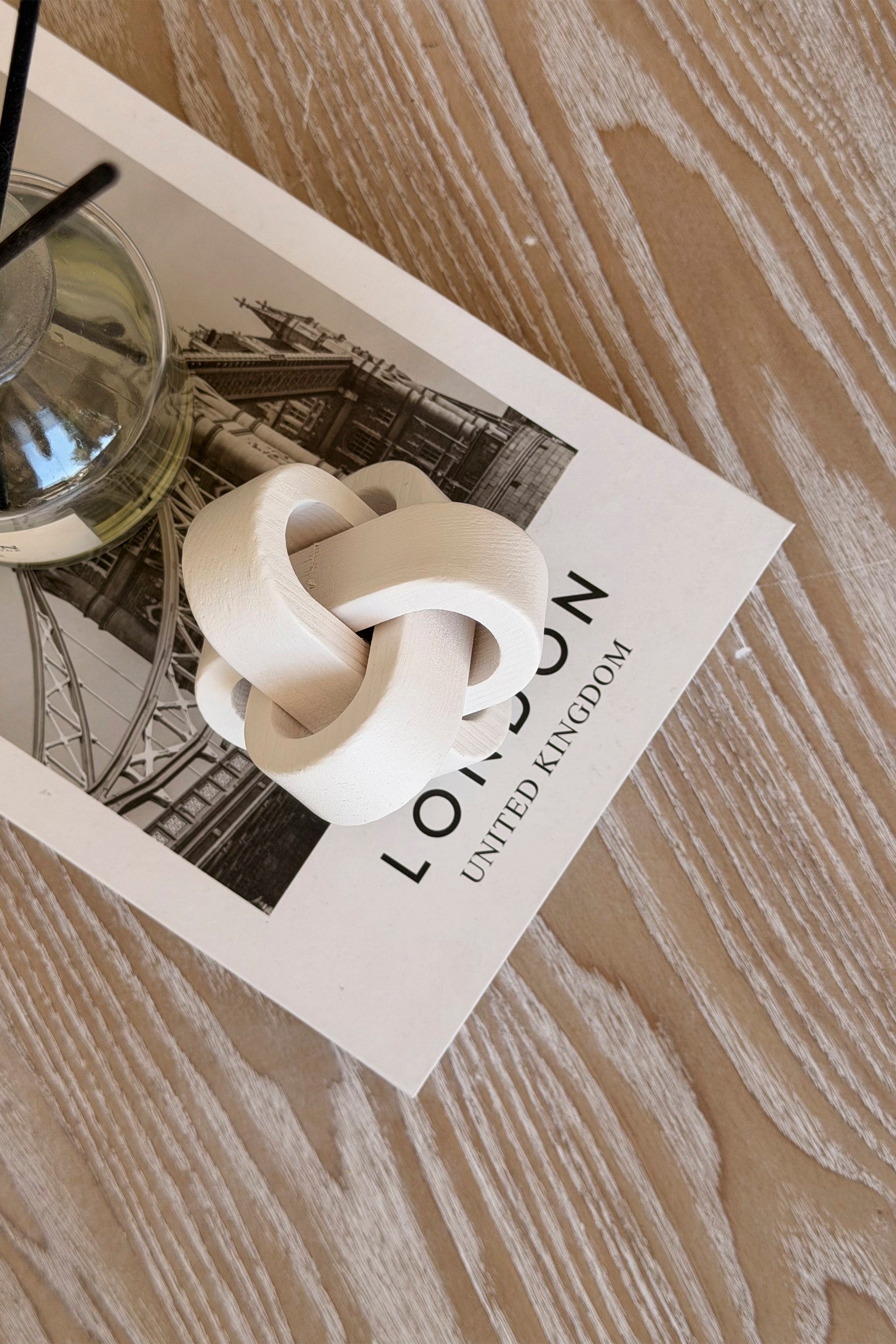 Nudo decorativo de madera color blanco. Un modelo pequeño, sutil y que entrega esa cuota de diseño de manera discreta, complementaria y sin saturar tu decoración. Es perfecto para montarlo acompañado de un difusor de varitas sobre un libro, o agregarlo a una bandeja acompañada de velas en distintas alturas.