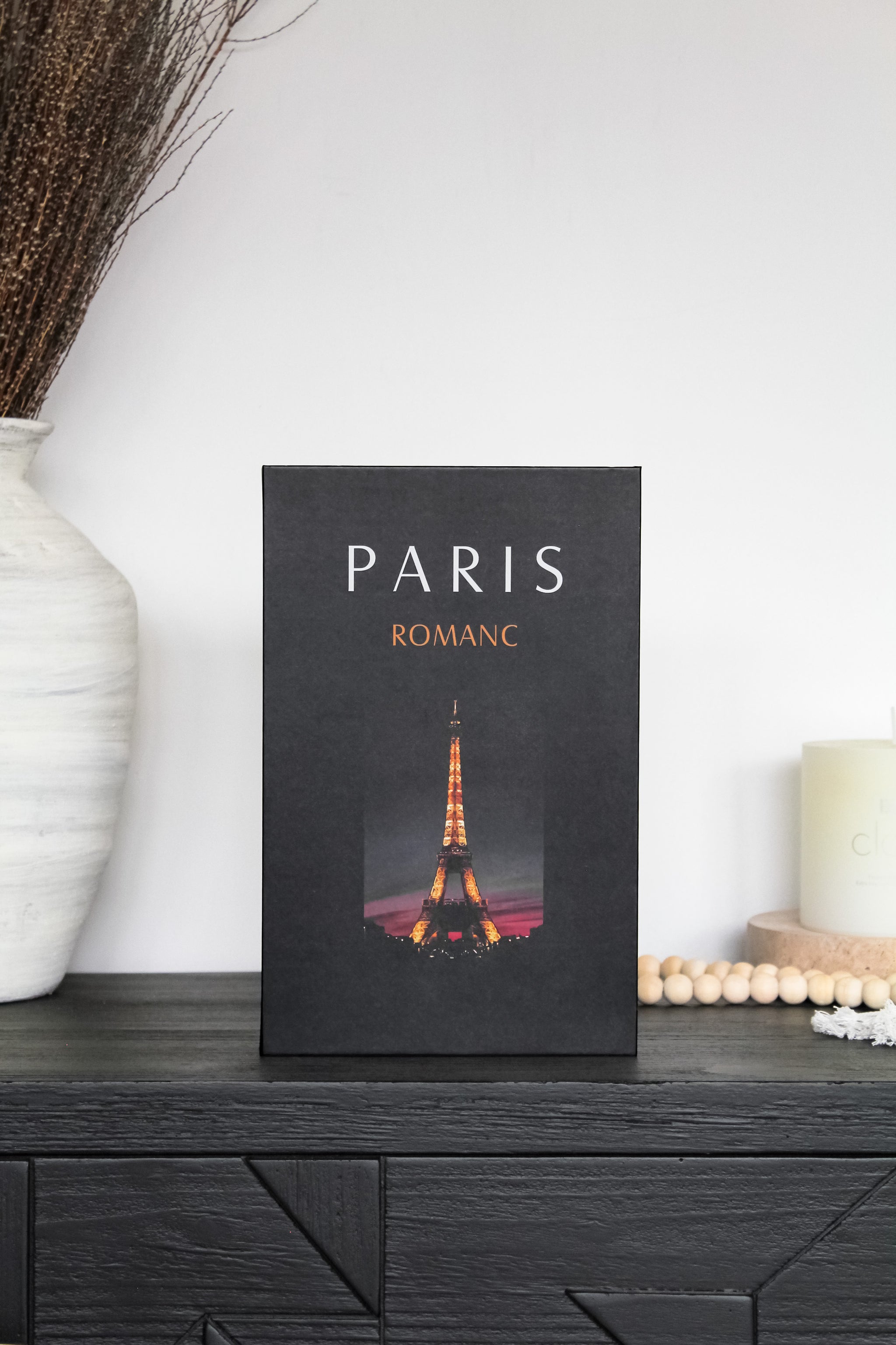 De un elegante color negro, un paisaje de la ciudad de París de noche y su preciosa Torre Eiffel iluminada, este modelo es perfecto para añadir esa cuota de diseño a tu espacio.