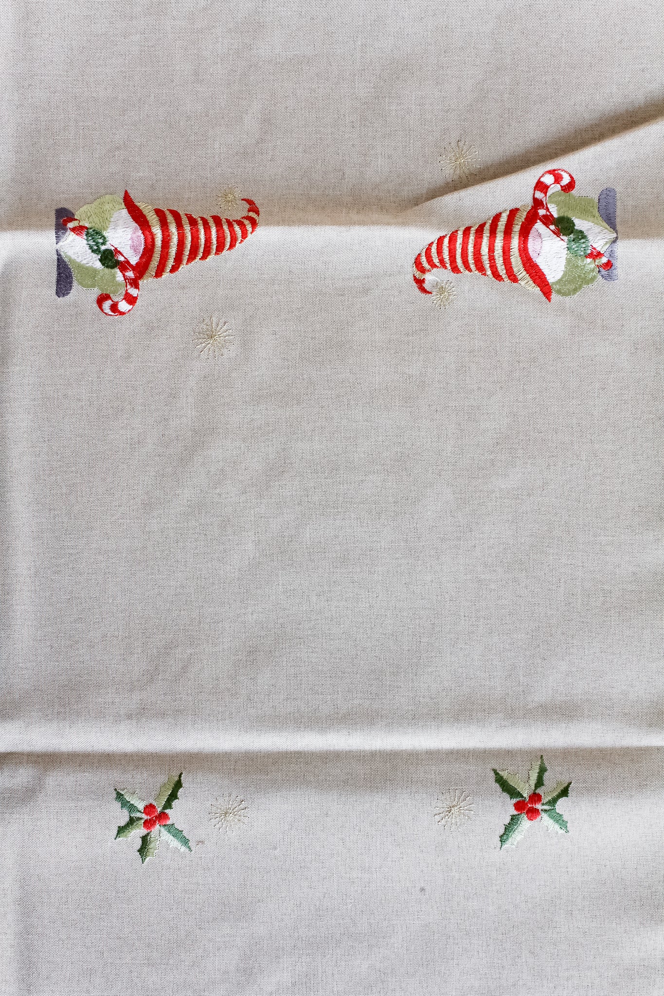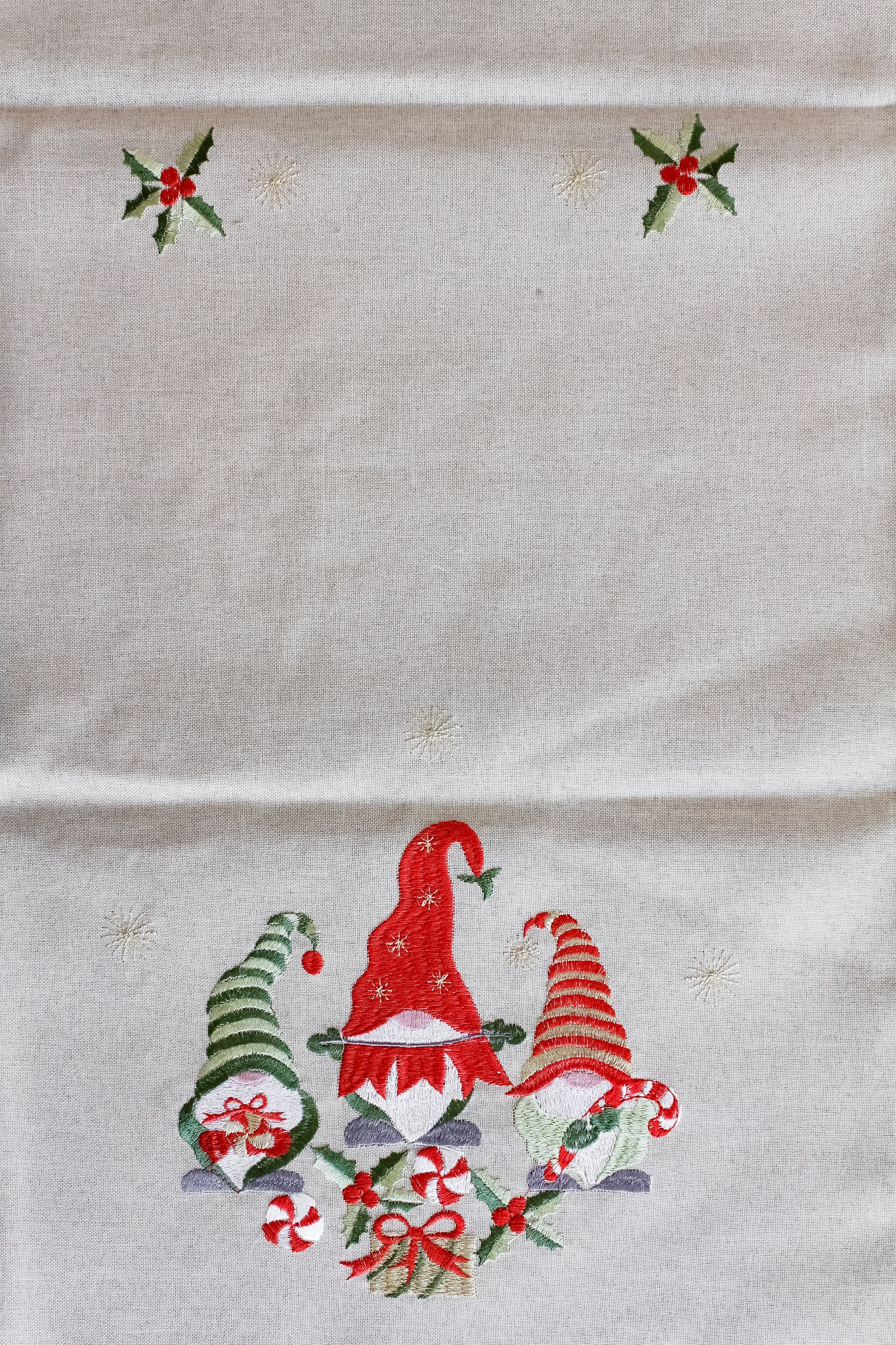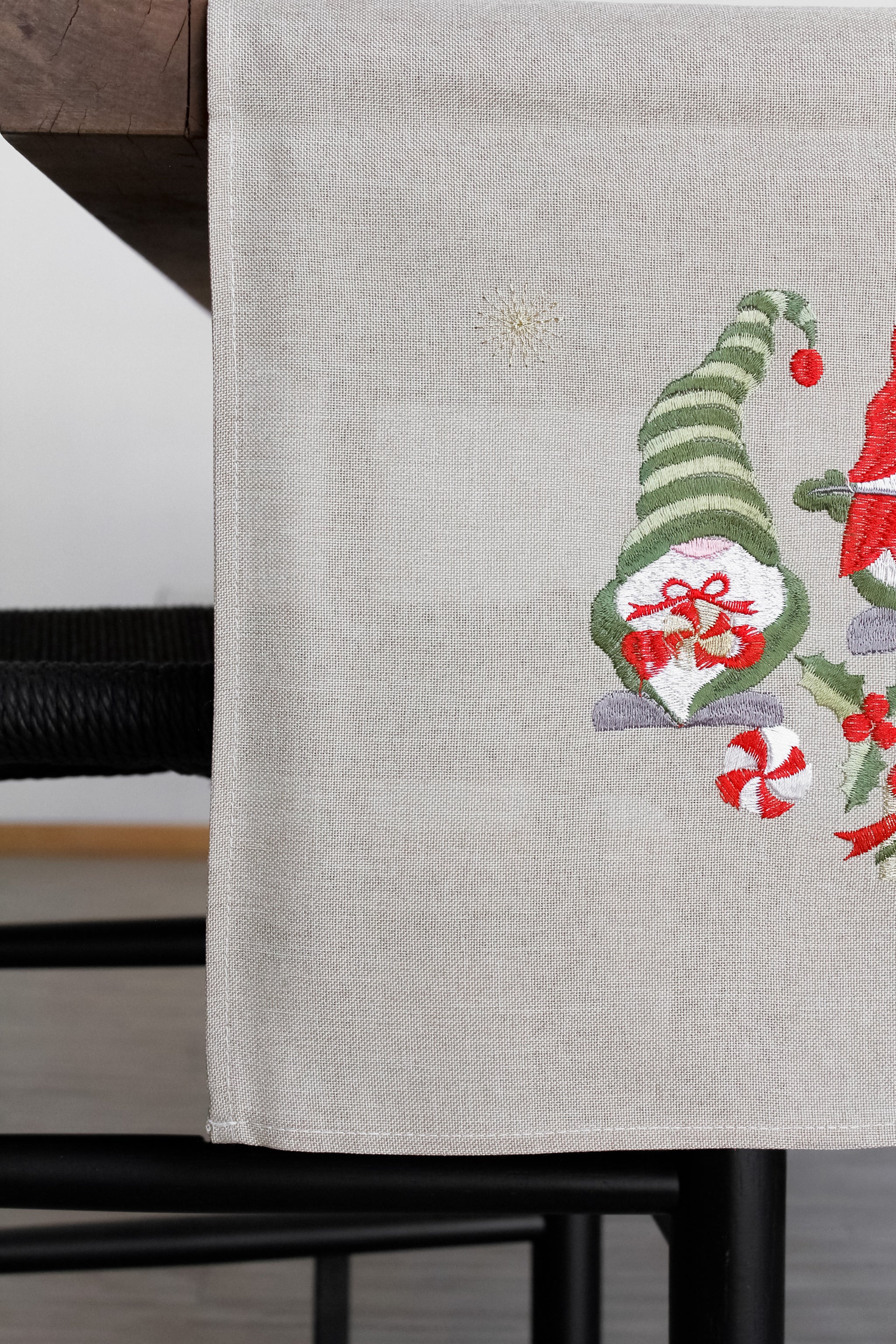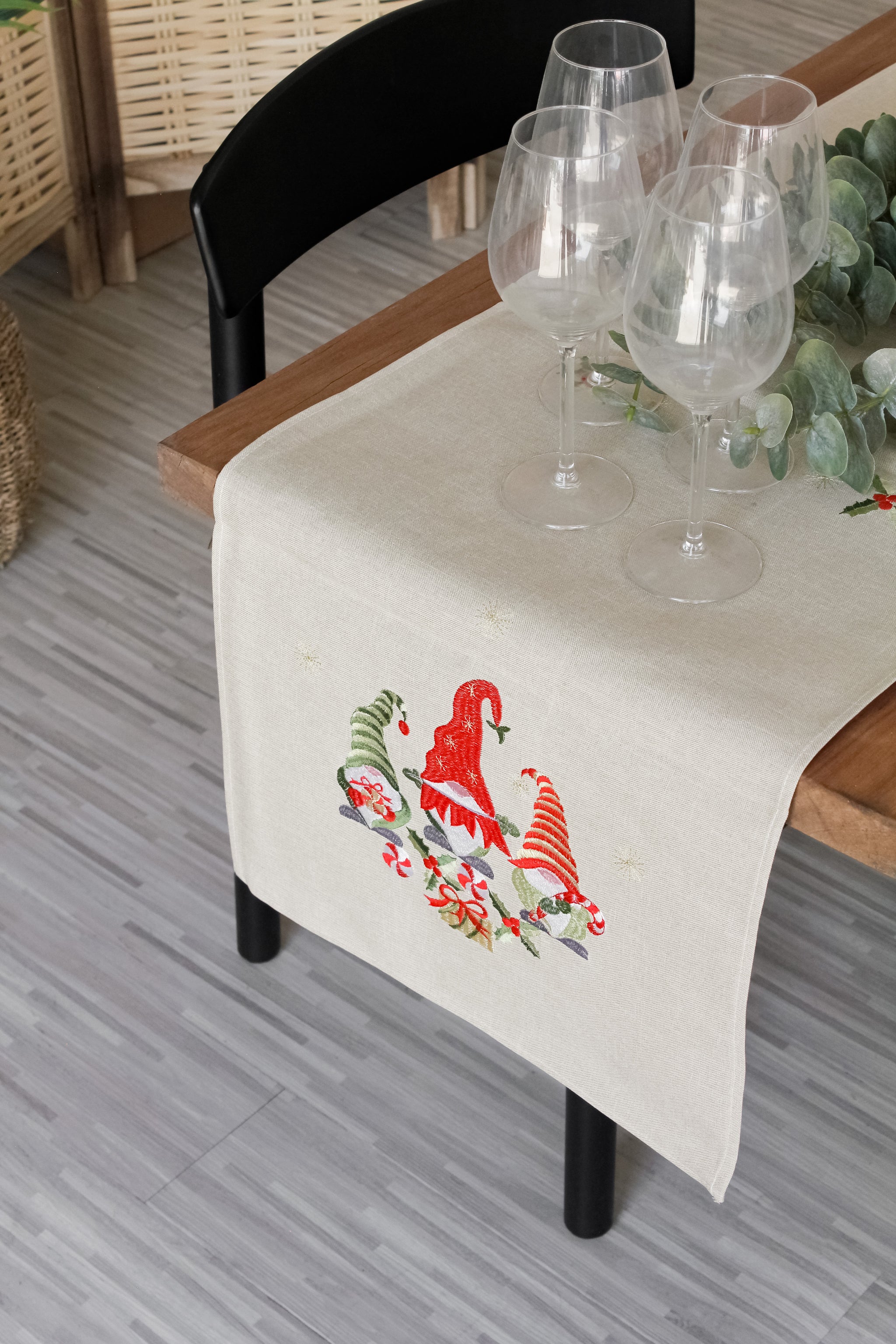 Camino de mesa color arena y diseño navideño, ideal para preparar tu mesa en estas fiestas. Un modelo de colores sobrios, con gnomos y otros elementos navideños bordados que visten tu mesa para esta navidad.