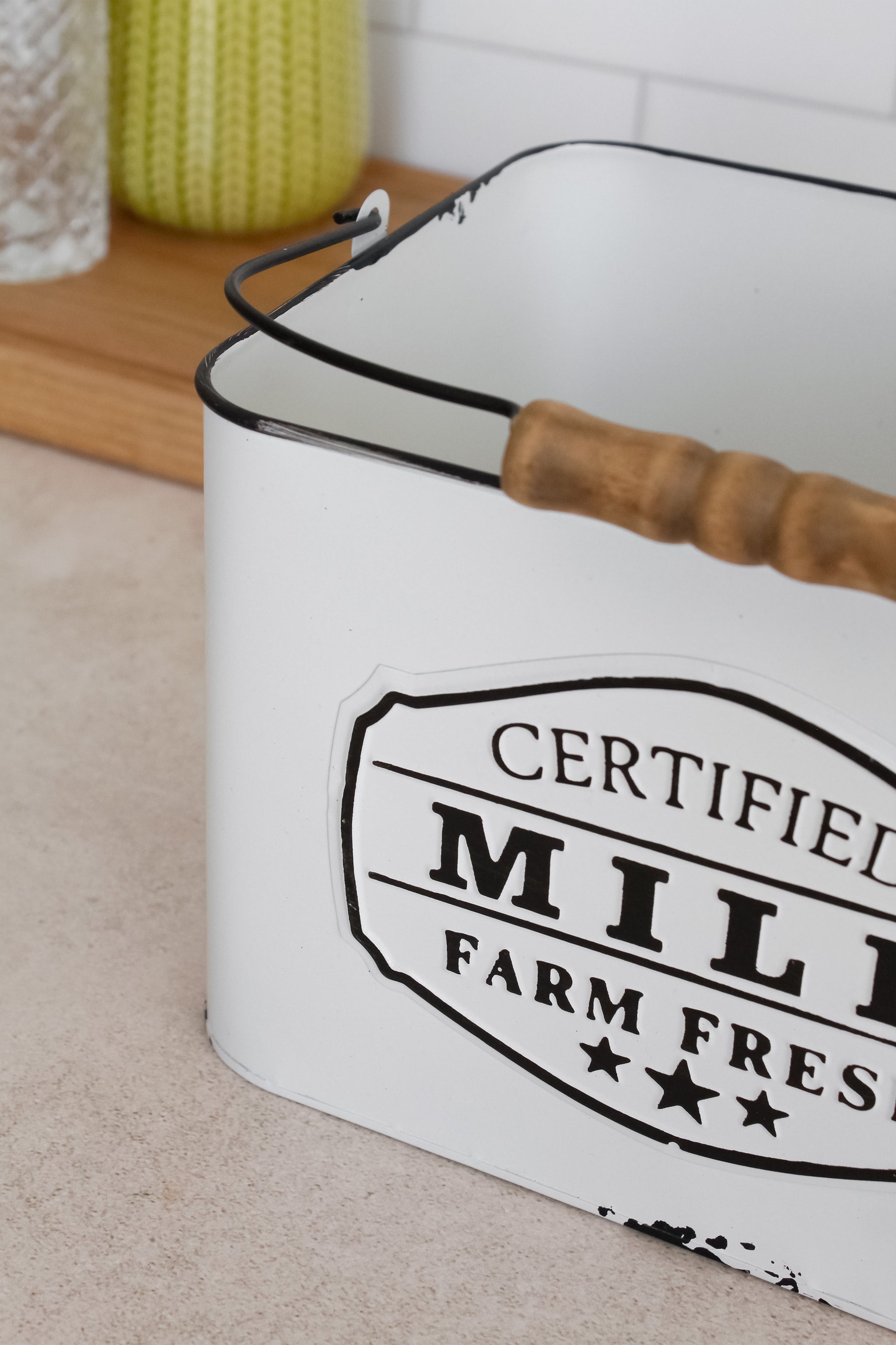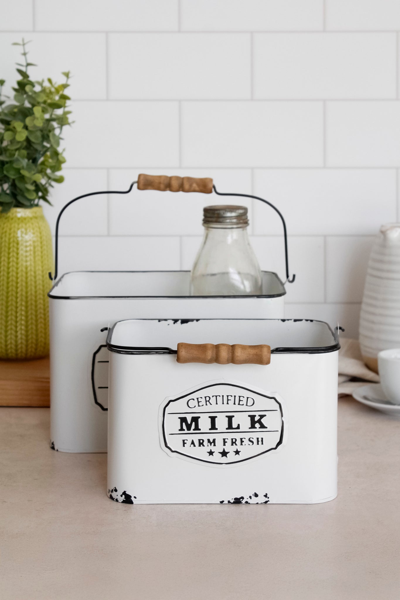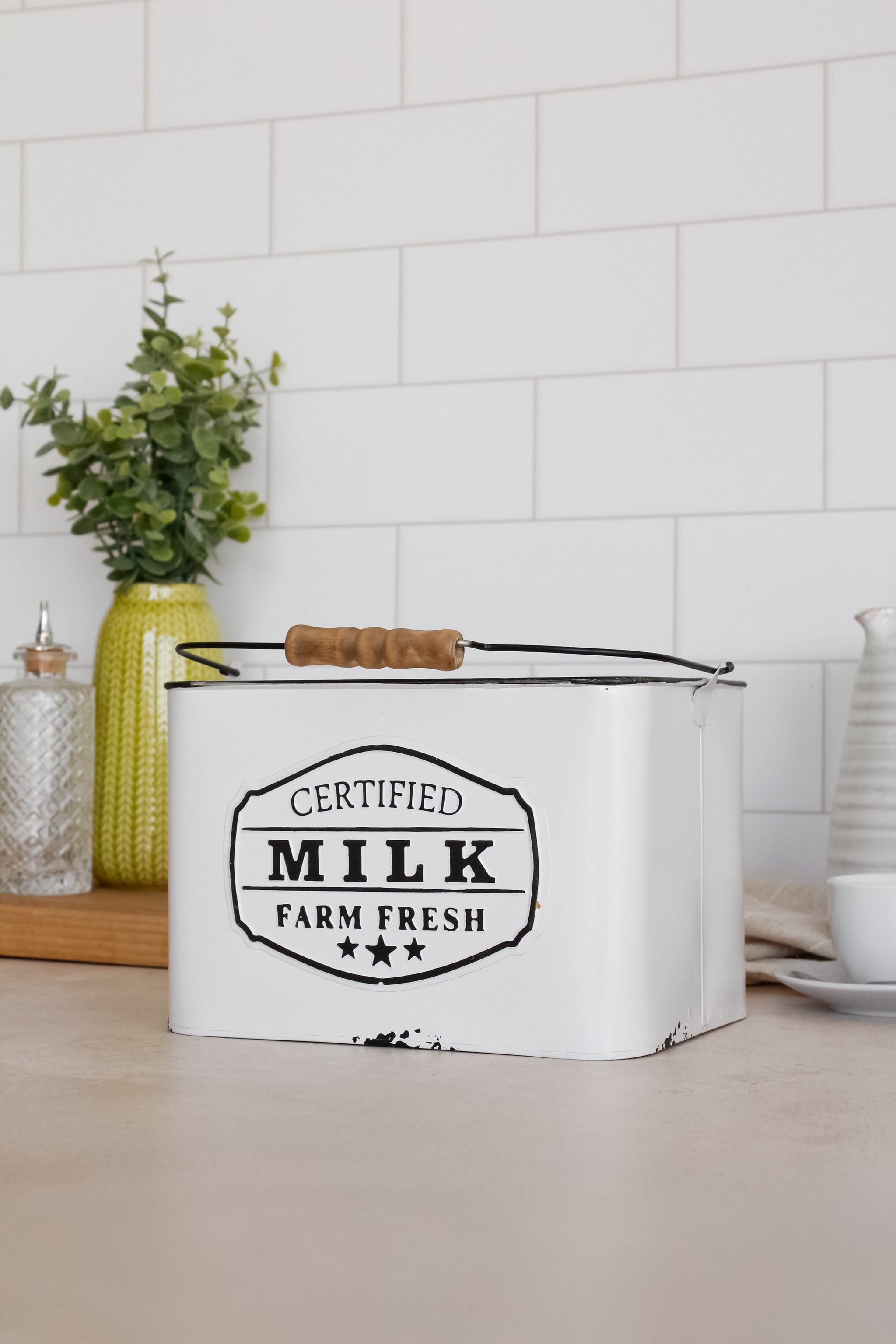 Organiza y decora tu cocina de la mejor manera con este maravilloso canasto de latón enlozado. Disponible en dos tamaños, cuenta con una linda gráfica de "Certified Milk Farm Fresh" para ese toque vintage y elegante.