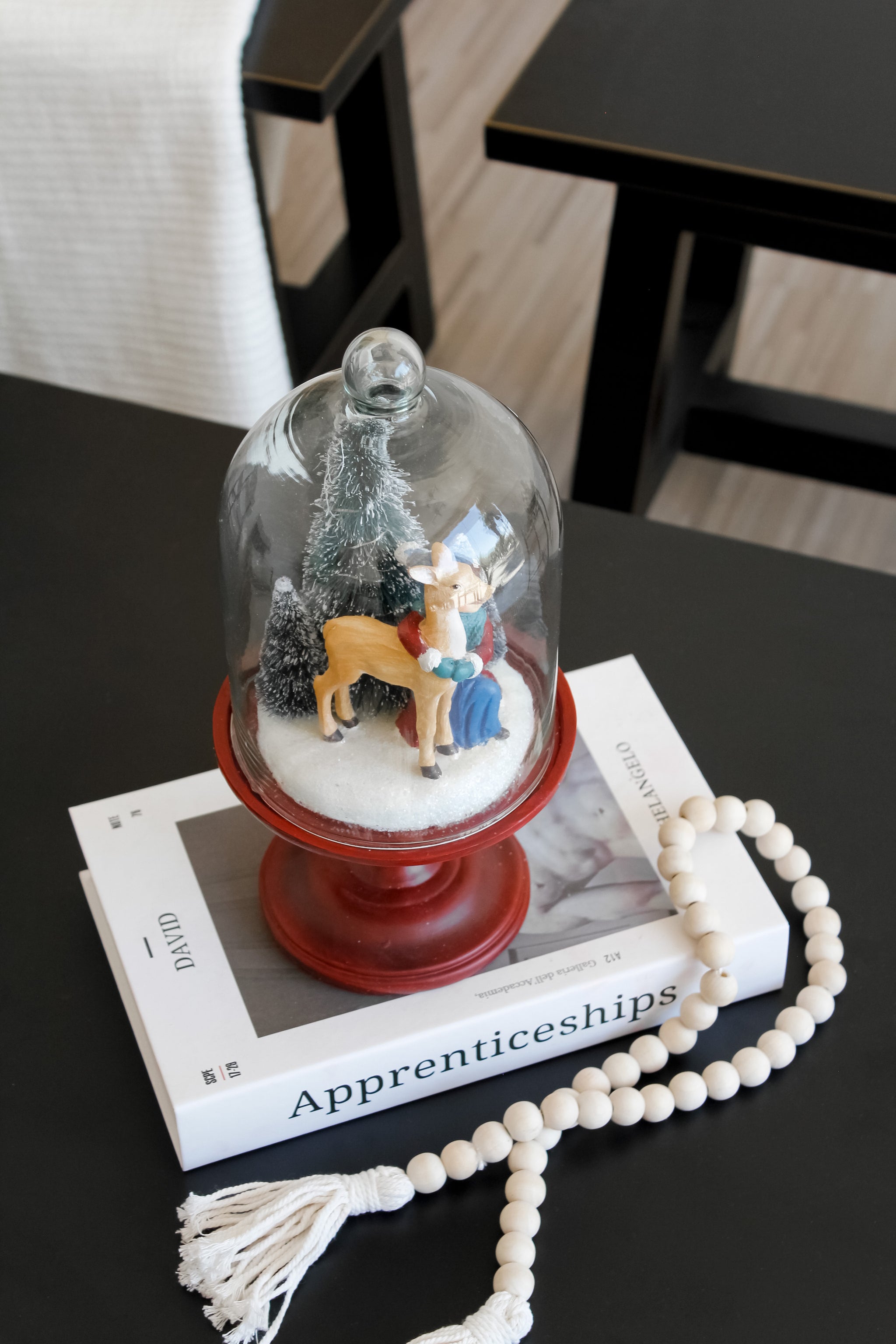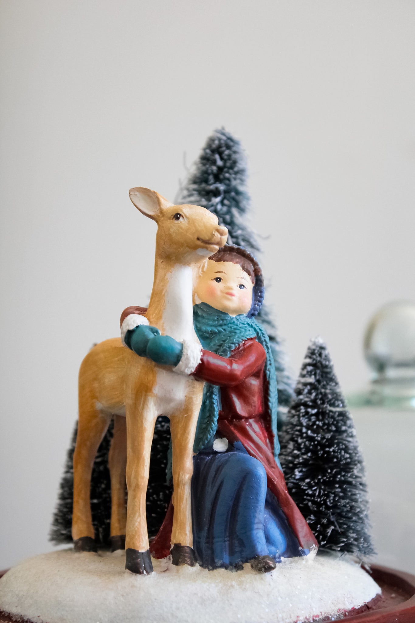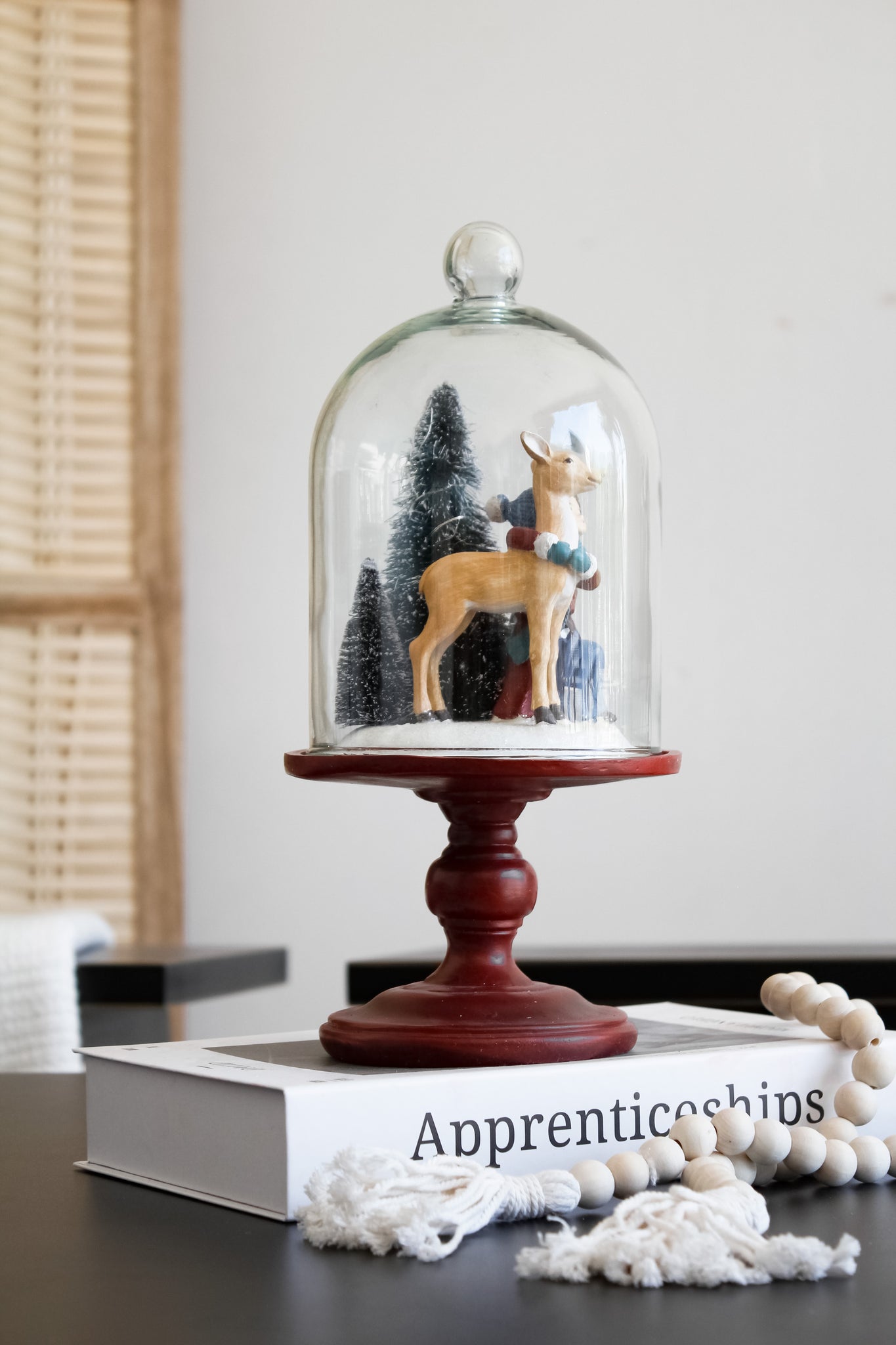 Una cúpula navideña con base de madera roja en altura, y en su interior, la figura de un niño abrazando un reno y de fondo un par de pinos nevados. Un modelo que transmite el espíritu navideño por completo, y que puedes combinar en tu decoración para darle un toque sutil, pero sin invadir.