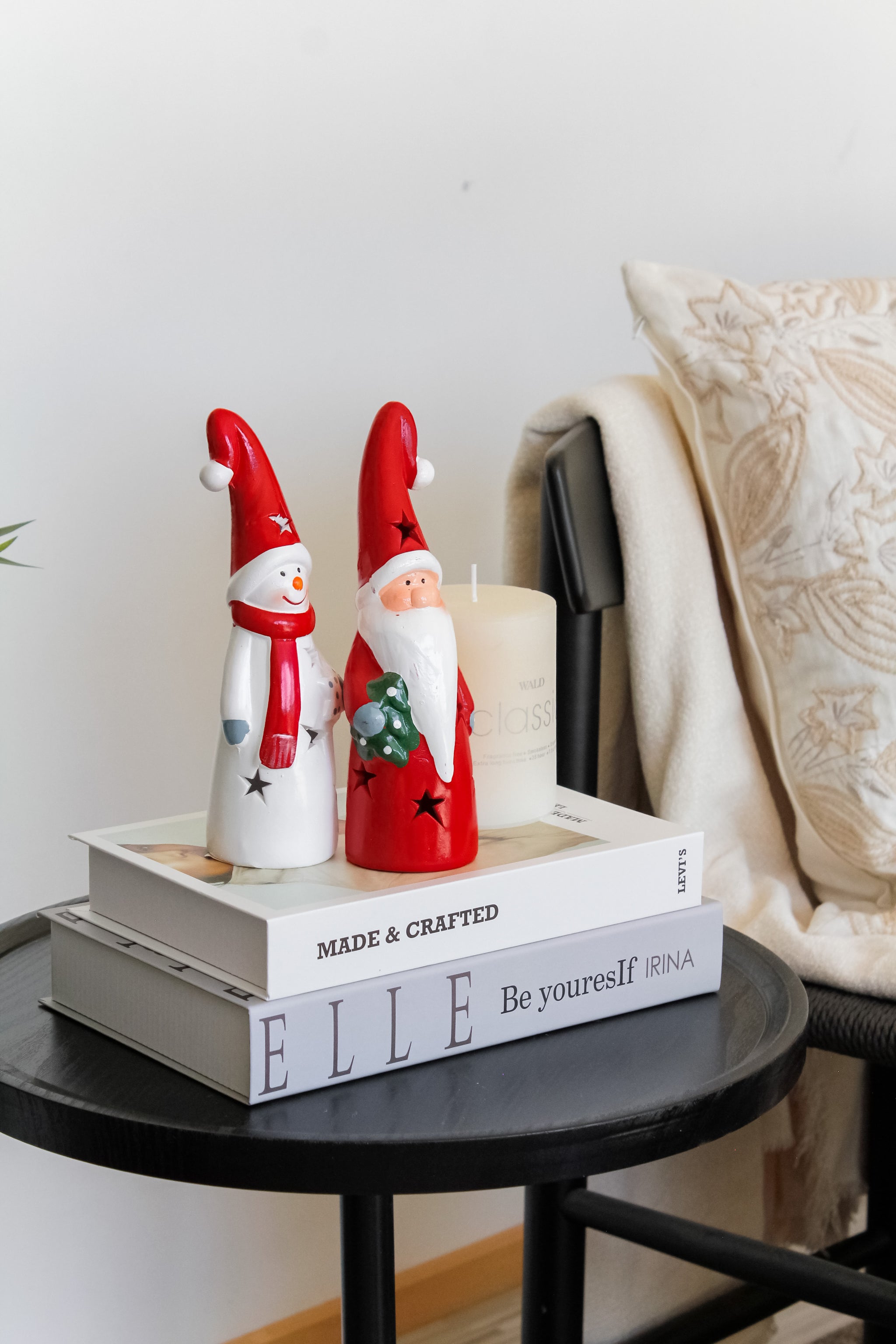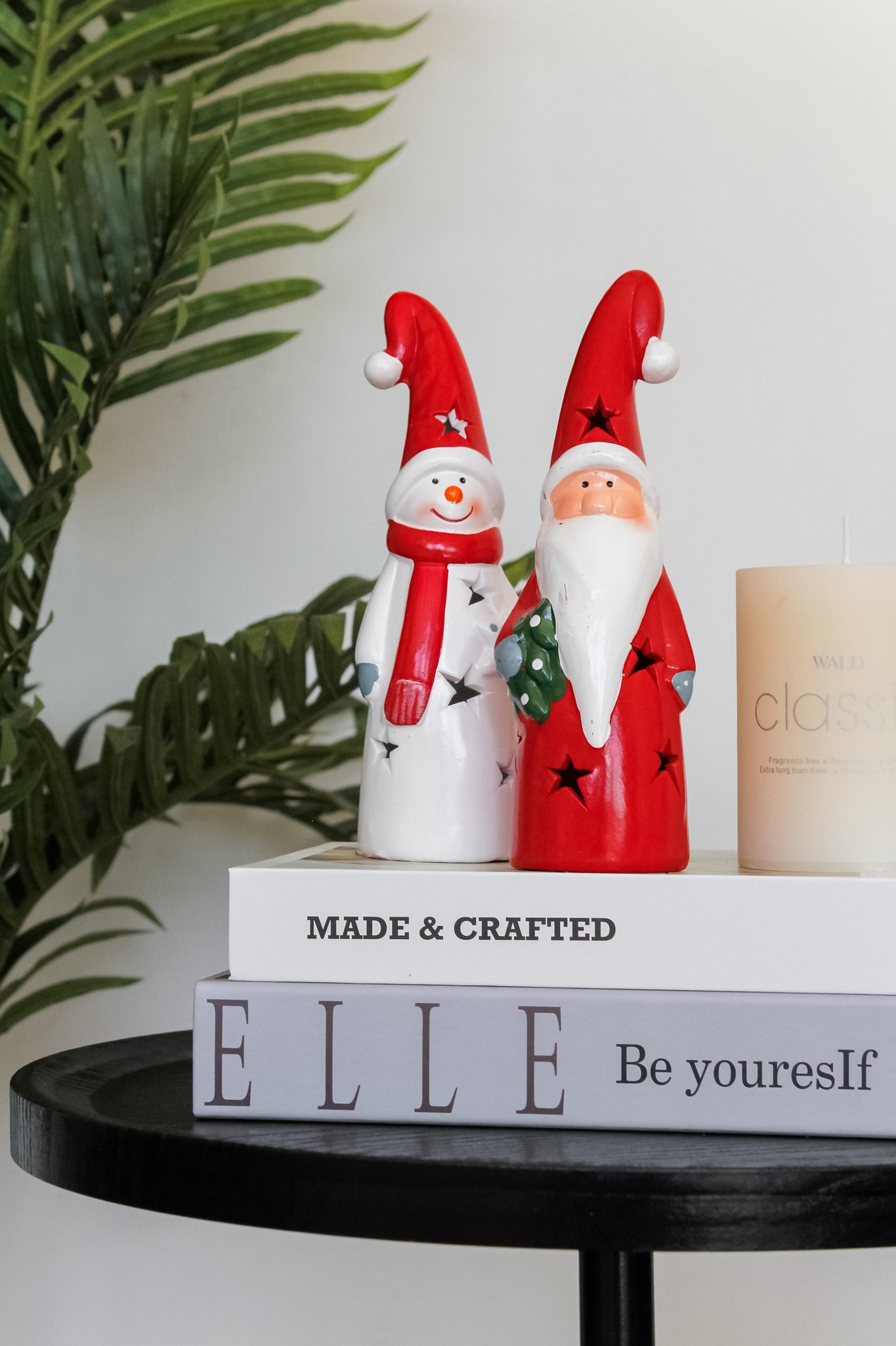 Figura navideña de viejo pascuero y muñeco de nieve con gorro, diseño de estrellas y con luz led cálida. Ambos modelos preciosos, perfectos para decorar sin recargar demasiado y cuando los prendes, reflejan ese espíritu cálido y navideño perfecto para estas fiestas.
