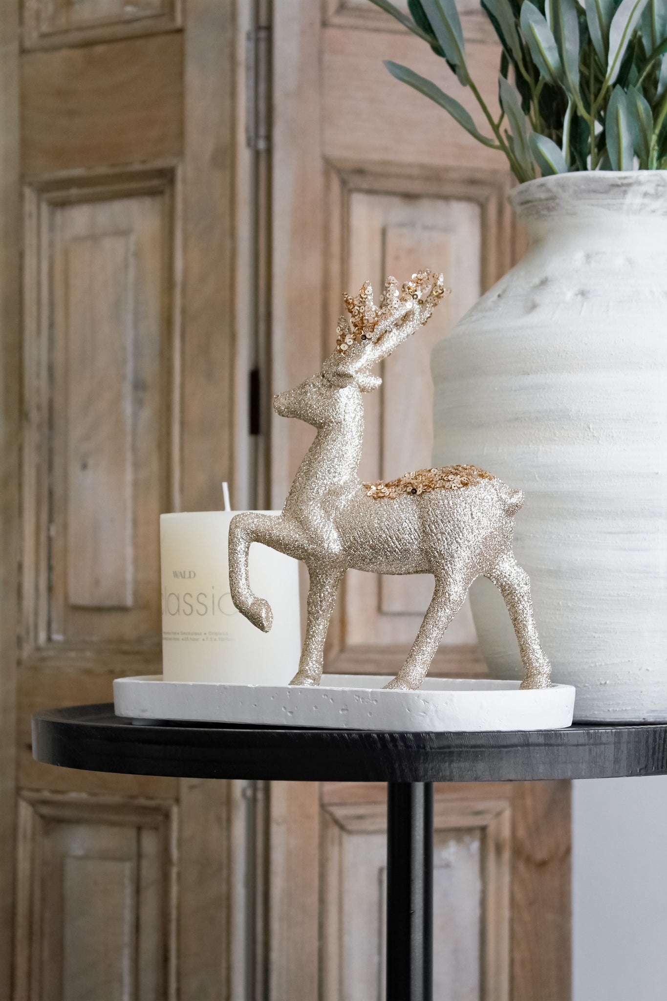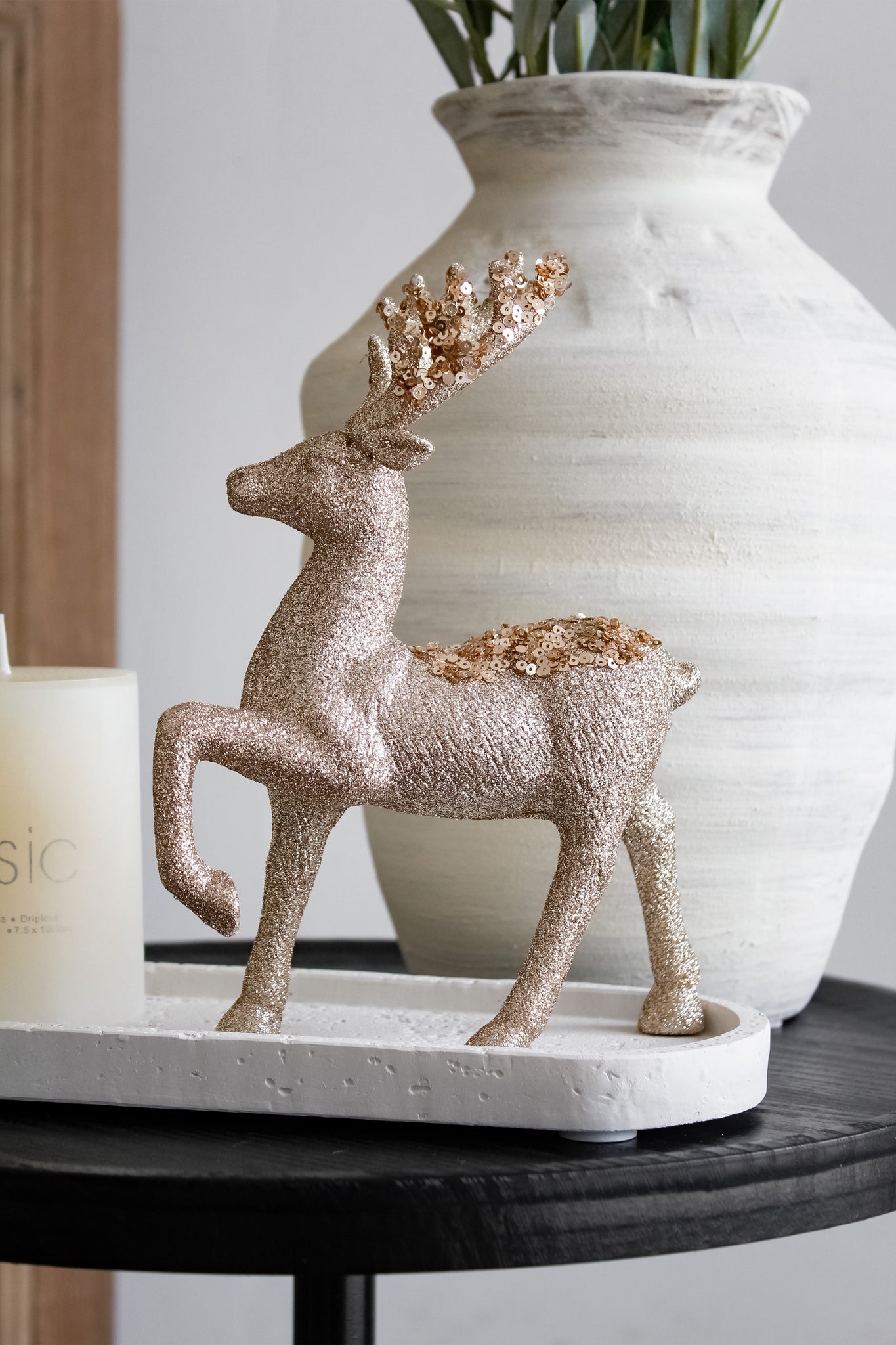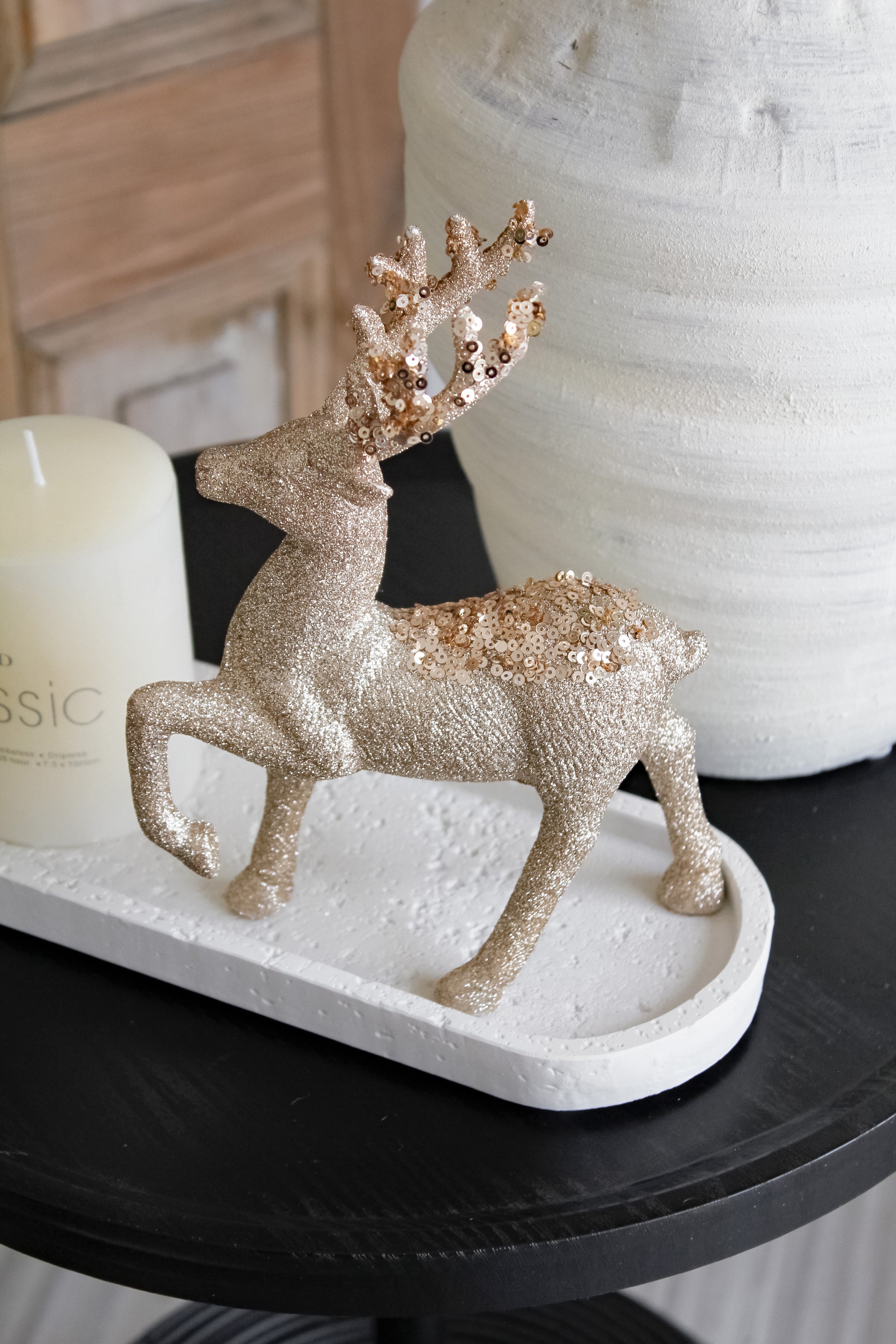 Preciosa figura decorativa de ciervo, cubierta de brillos y lentejuelas color champagne. Un modelo que brilla por si solo, muy liviano y que refleja el espíritu navideño ideal para estas fiestas.