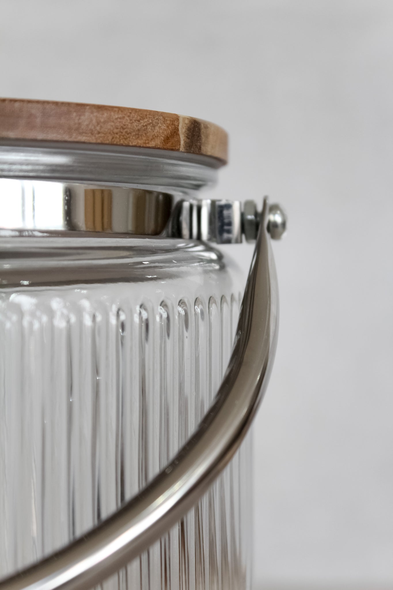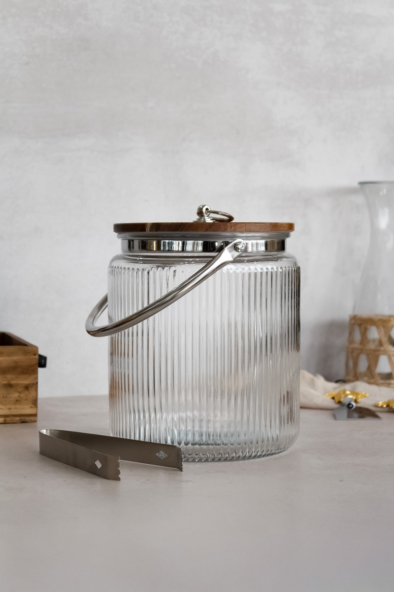 Hielera de vidrio ranurado con tapa de madera y pinza de acero inoxidable. Un modelo moderno, con gran capacidad y precioso a la vista, perfecto para lucirla en una comida o asado con amigos.