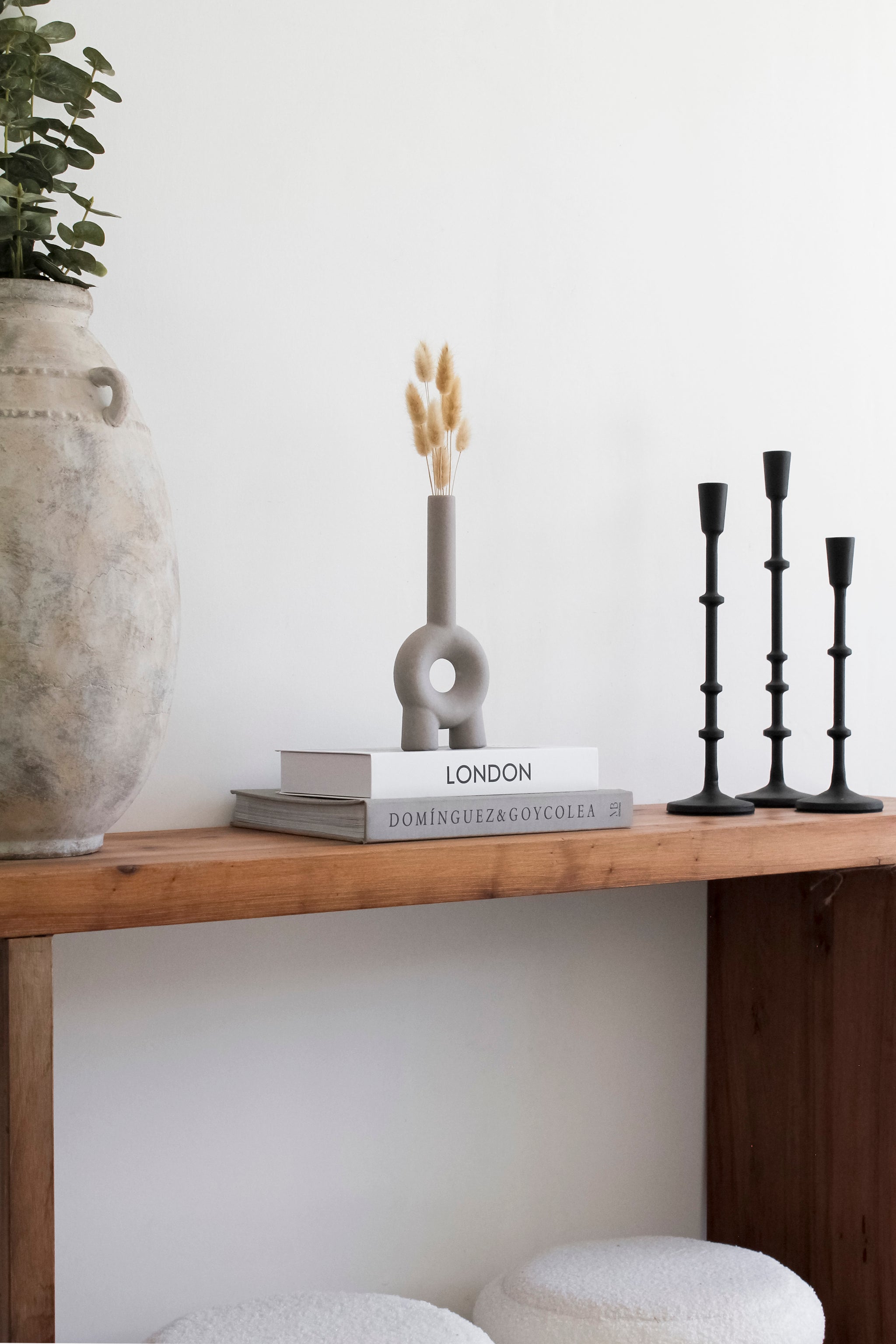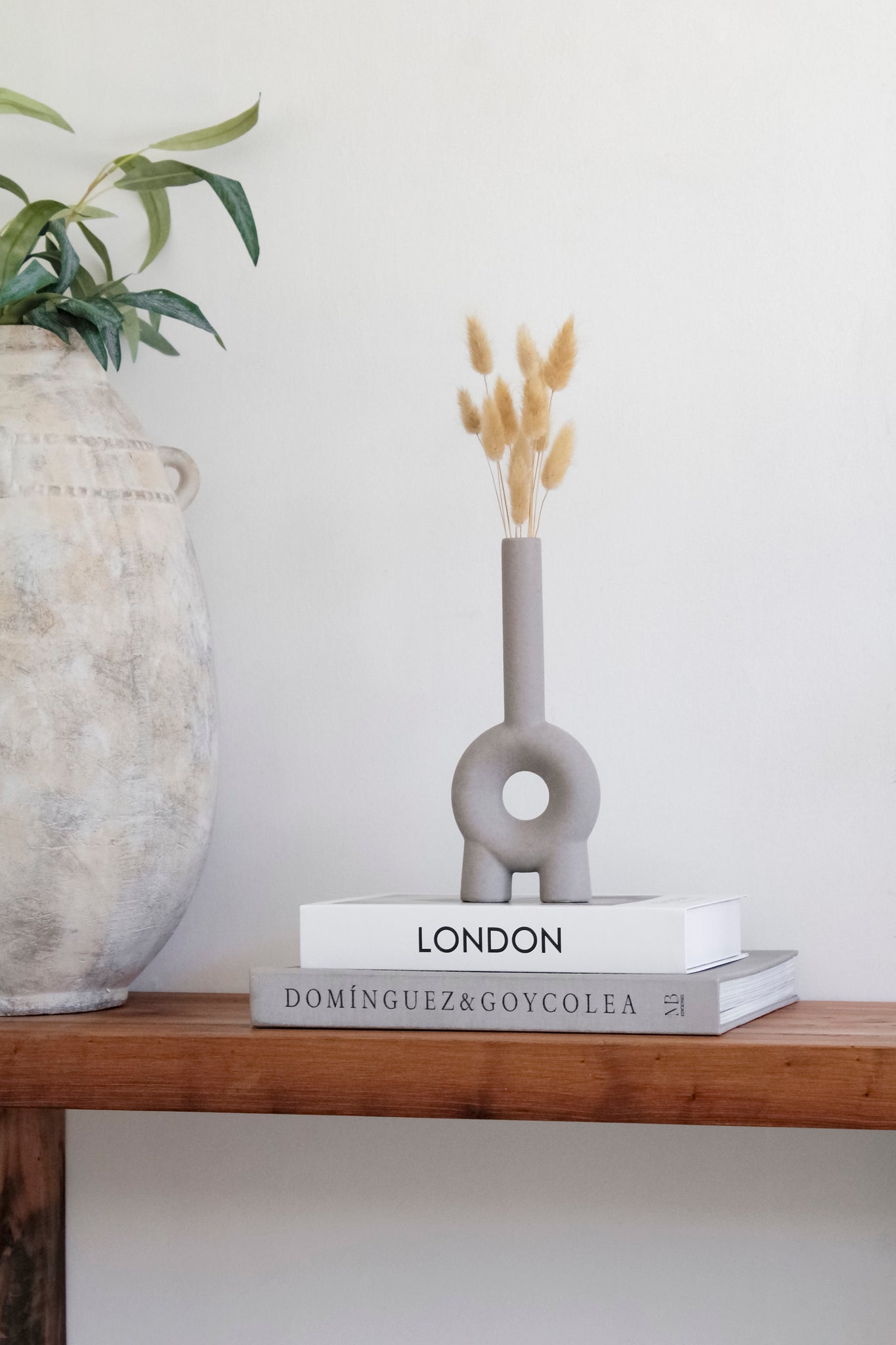Precioso florero de cerámica de cuello alto, disponible en dos colores y en una innovadora forma de aro con dos patas que lo sostienen, perfecto para ajustarse a tu decoración.