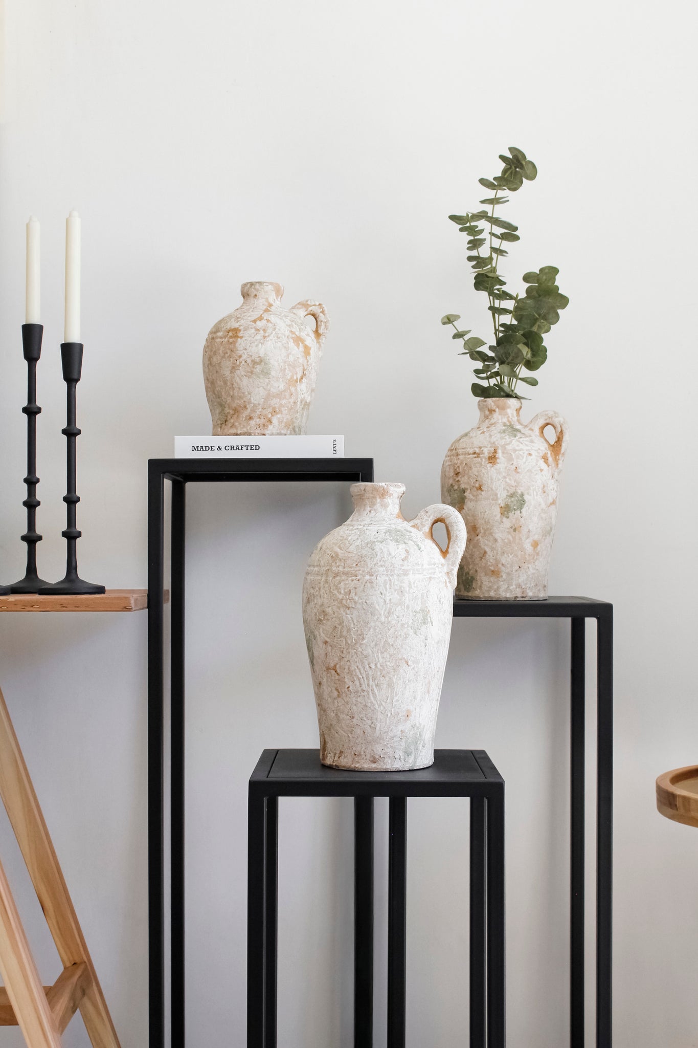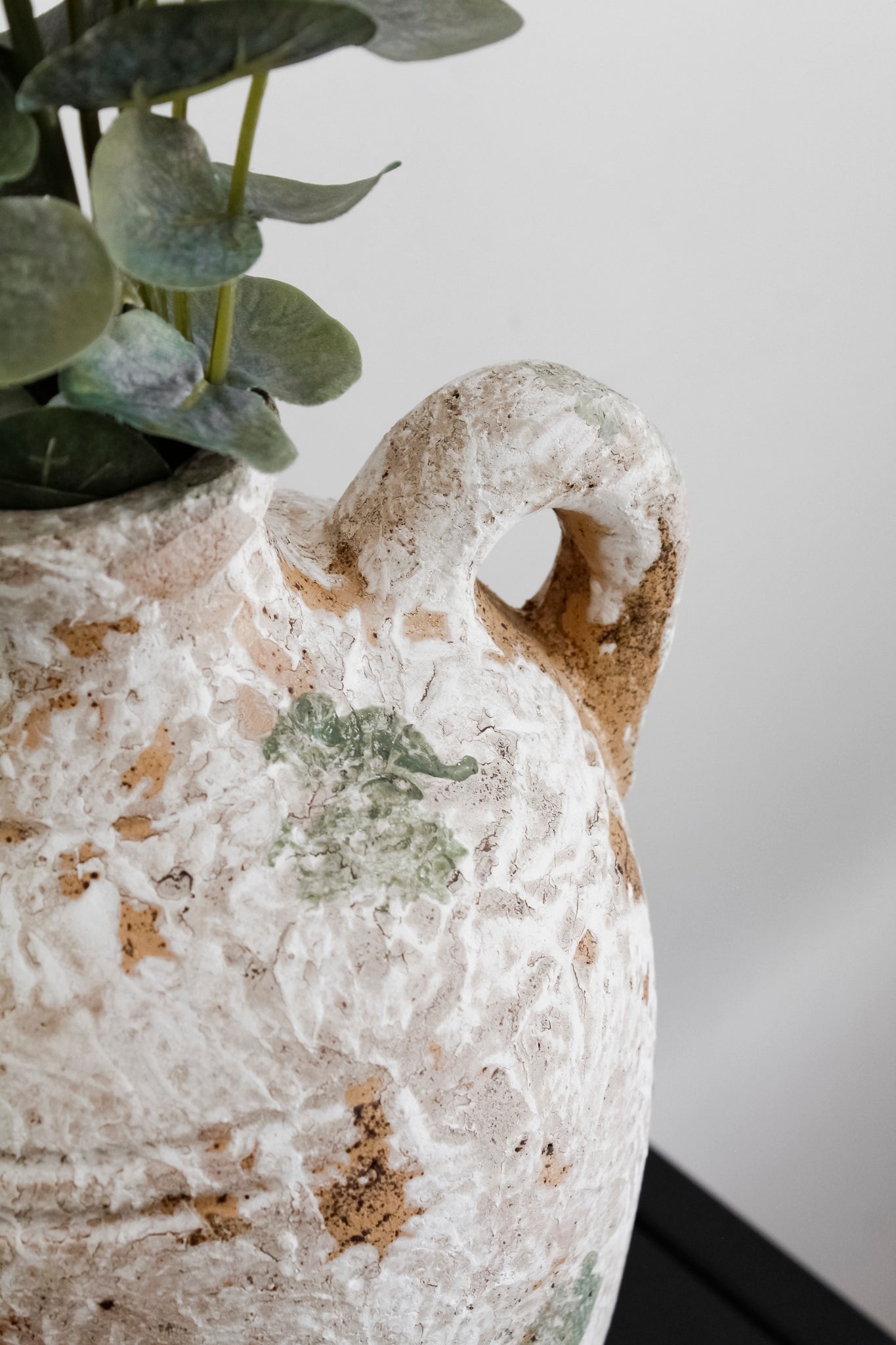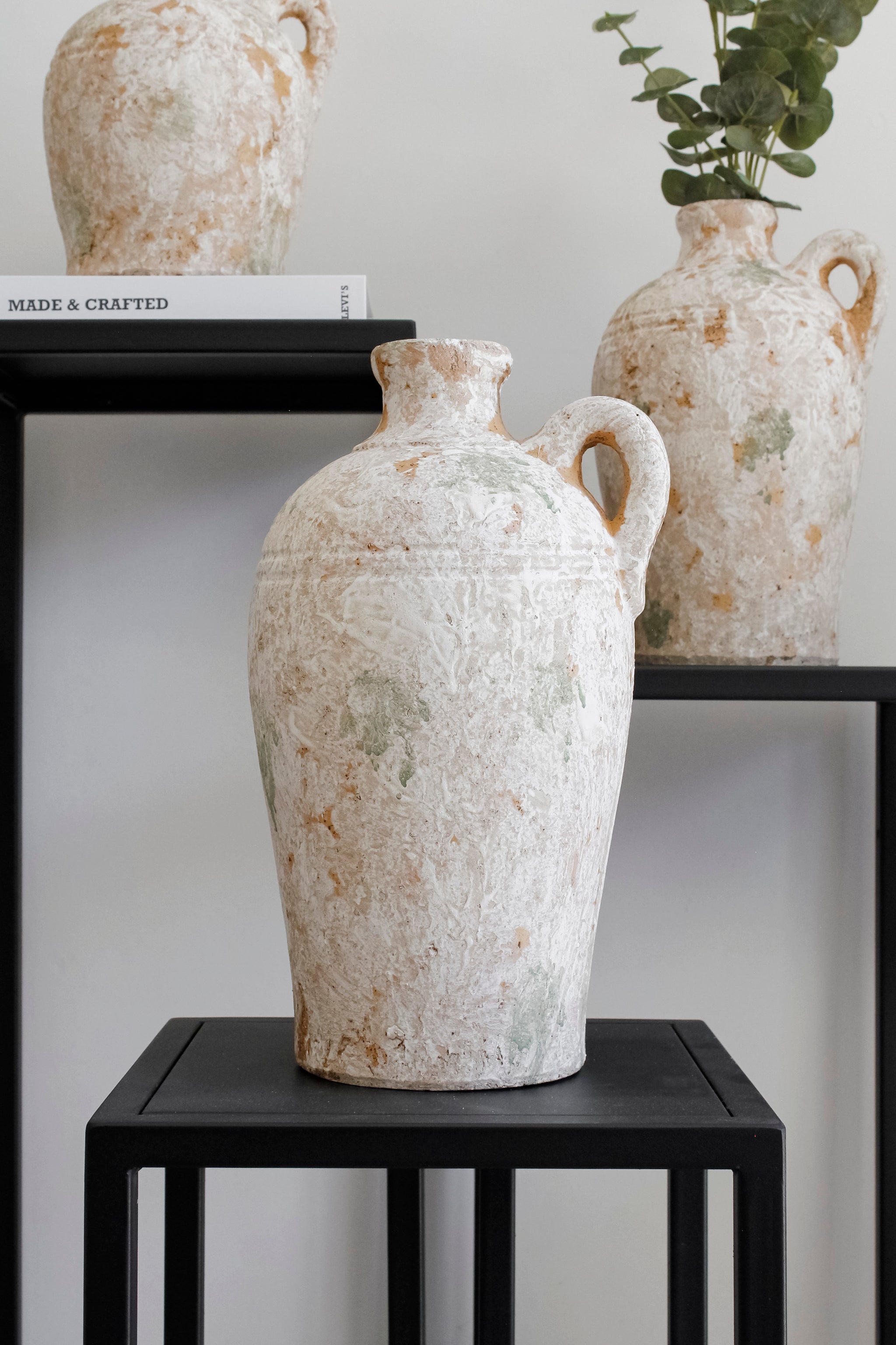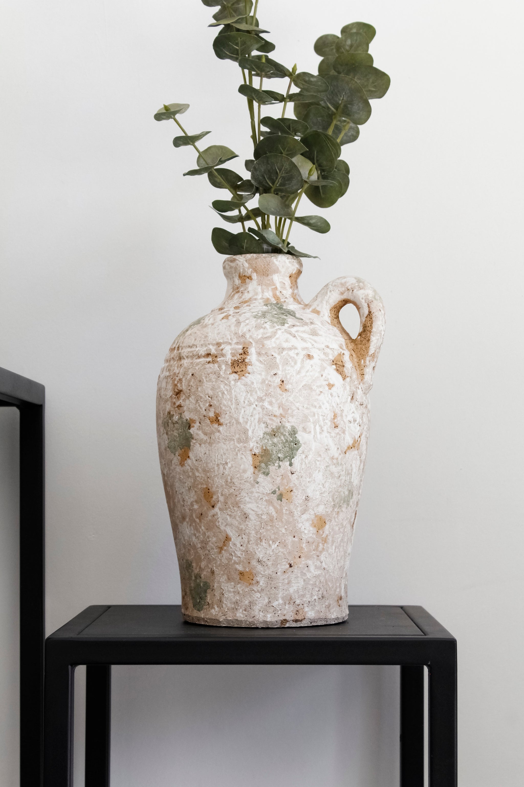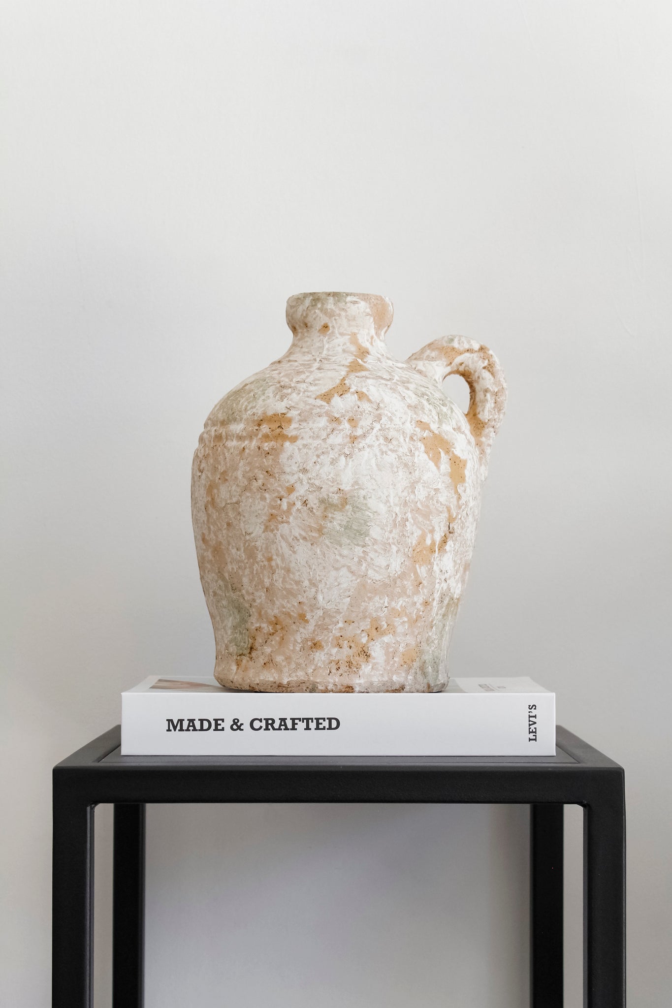Jarrón rústico de un asa con diseño craquelado en colores mixtos: crema, anaranjado y verdoso. Un modelo que combina lo artesanal y antiguo con un look moderno y elegante, y que sin duda aportará carácter a tu decoración.