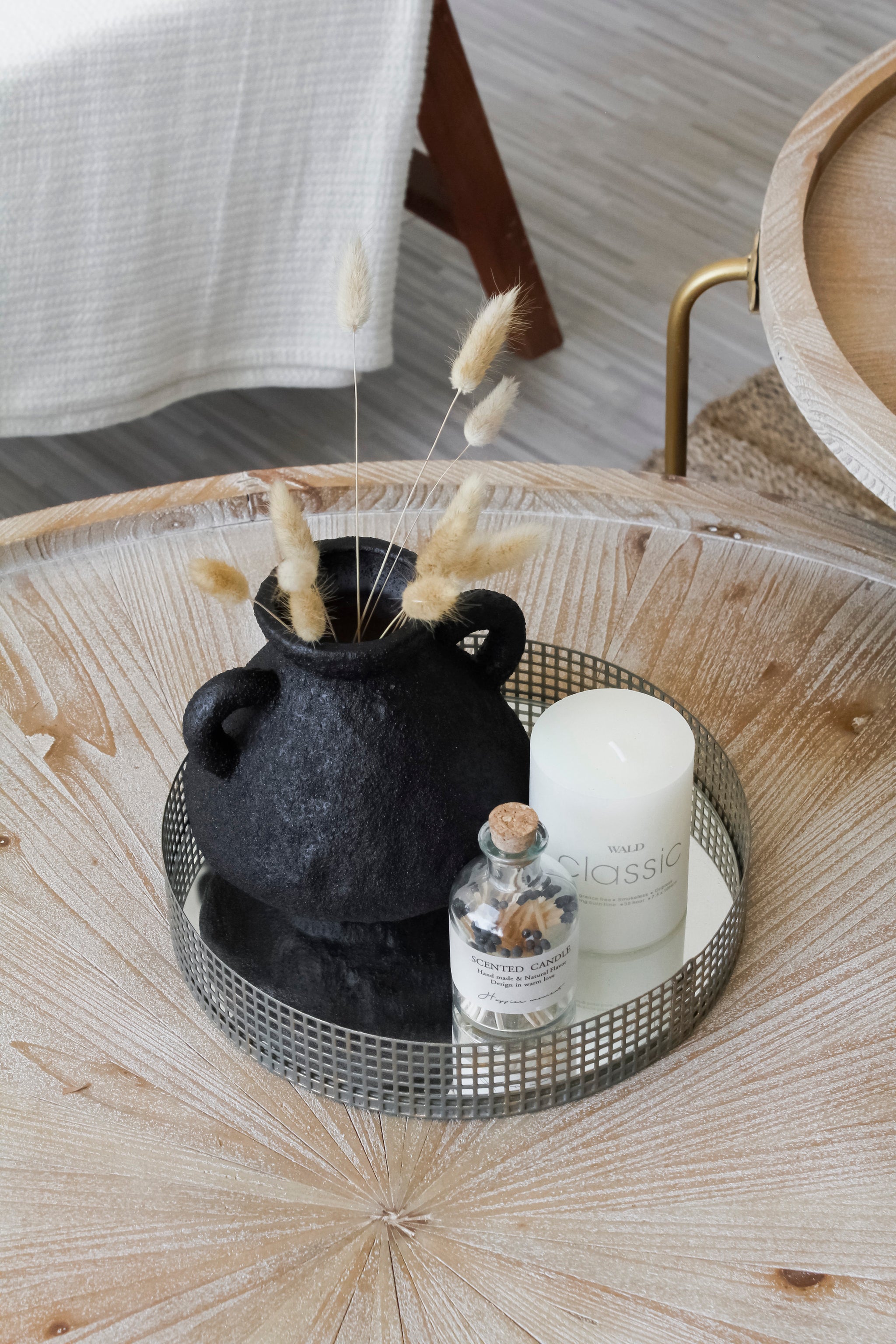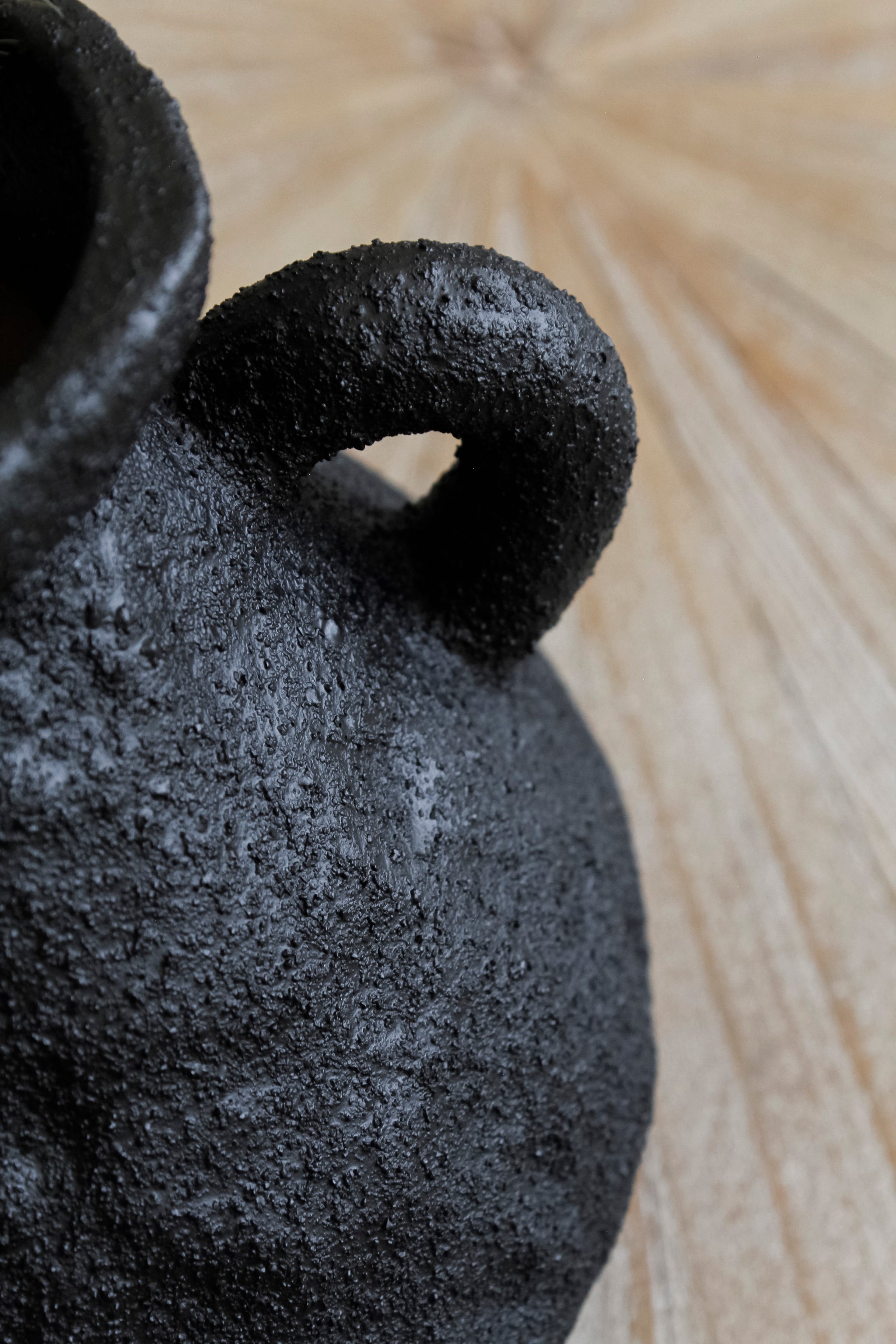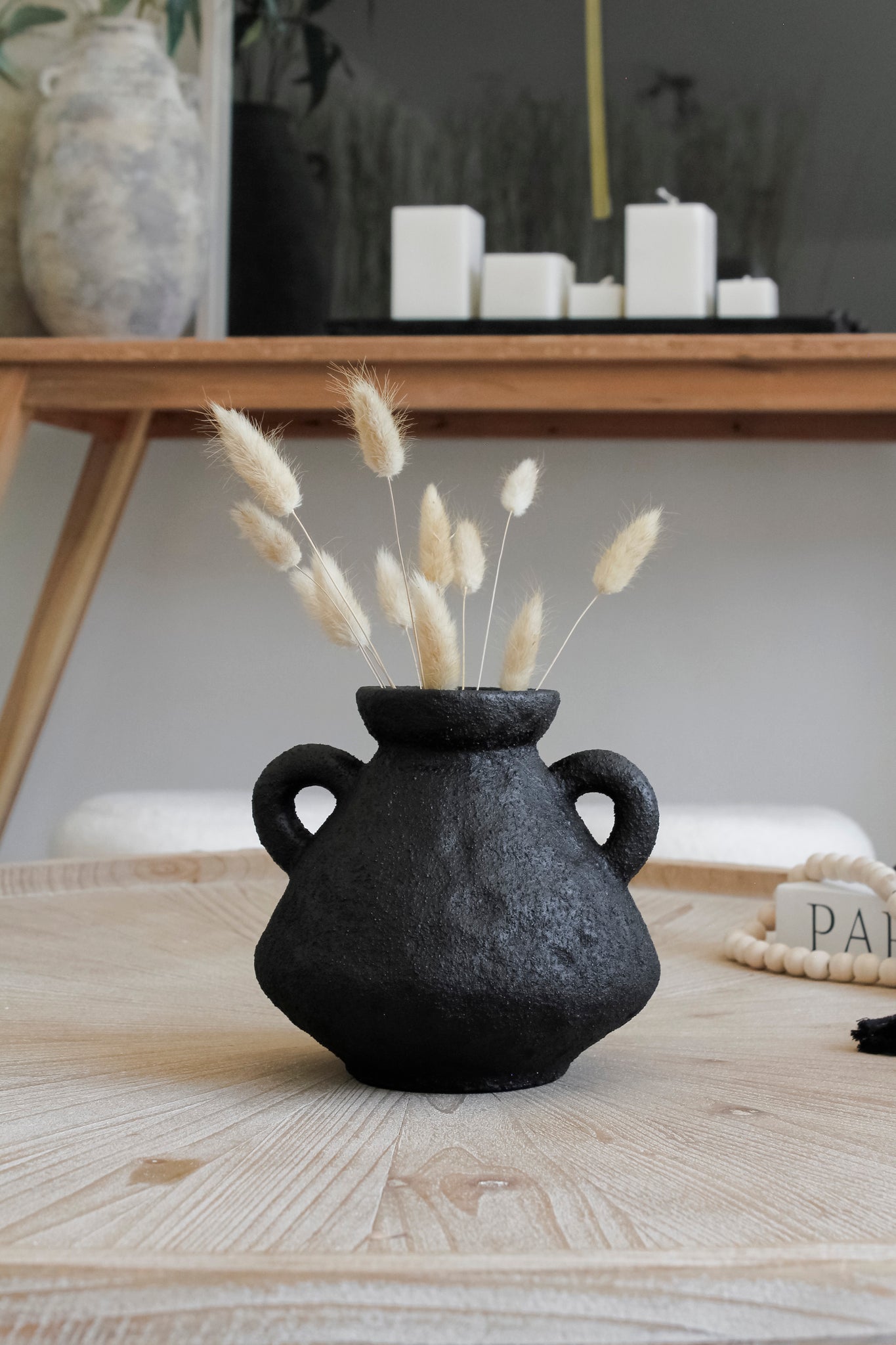 Jarrón de cerámica de dos asas con terminación porosa. Un modelo sencillo y de tamaño mediano que entrega ese toque final a tu mesa de centro, arrimo o repisa. Si quieres un look más natural, le puedes agregar un par de ramitas y quedará precioso.