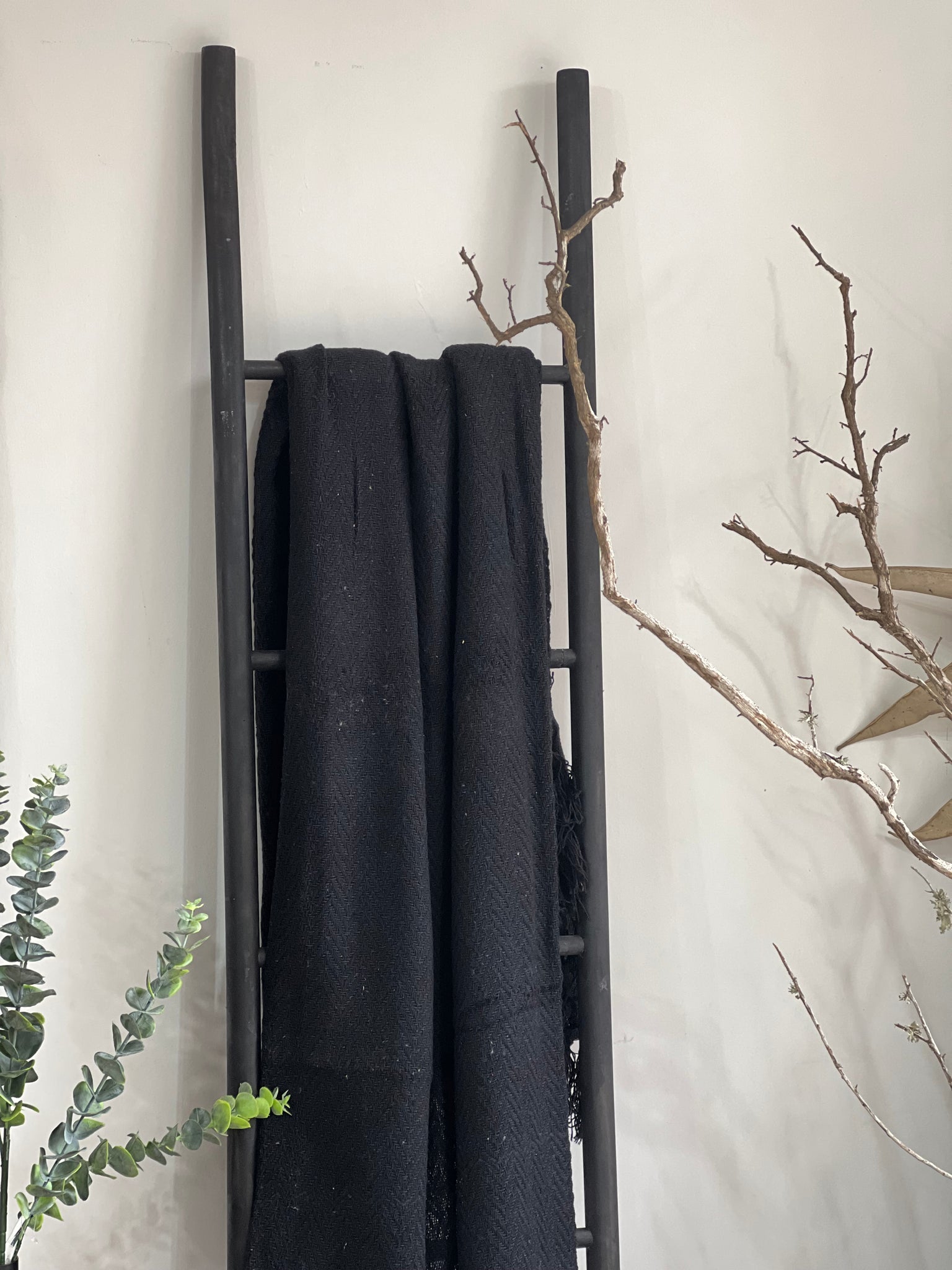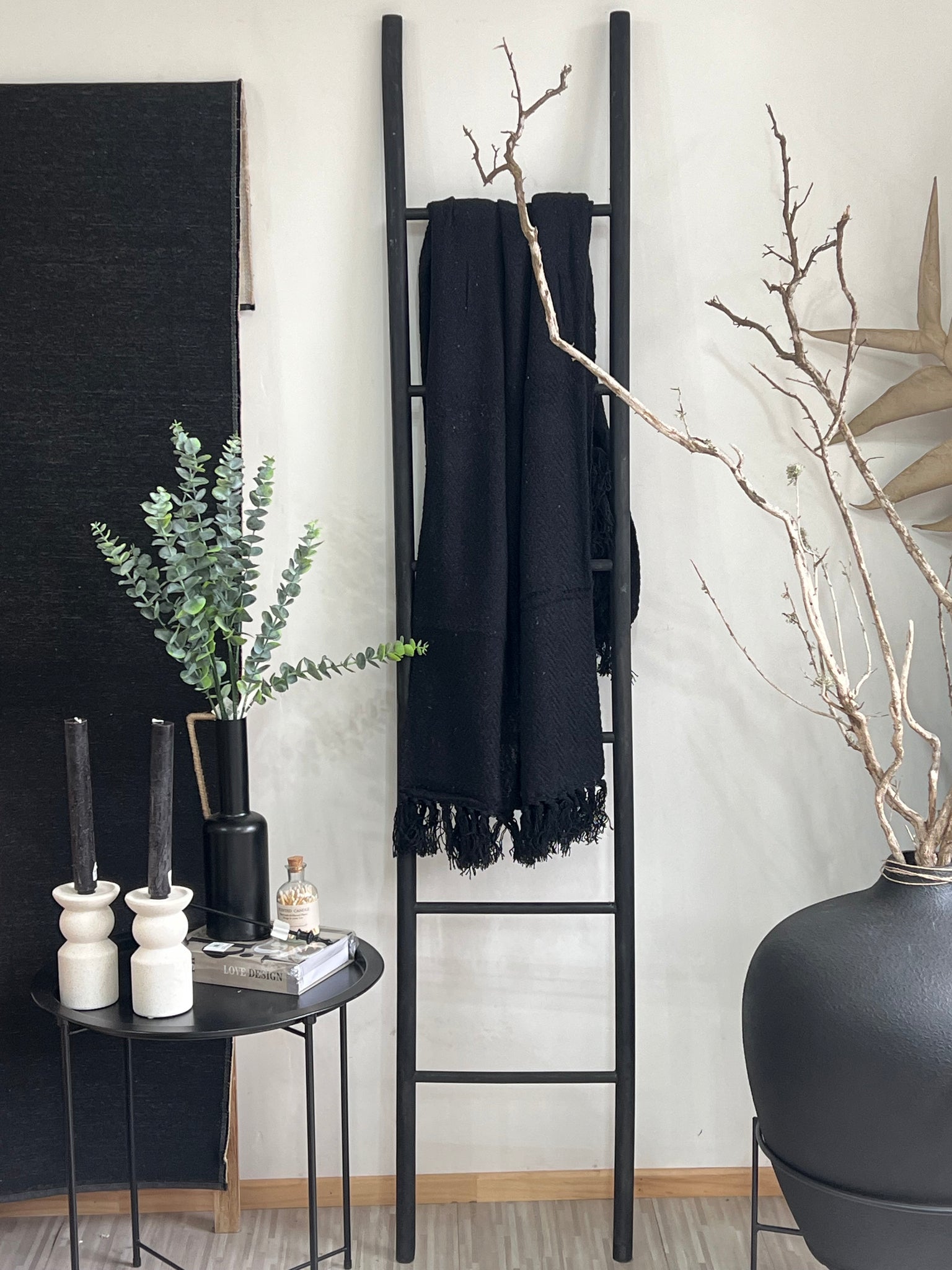 Escalera de madera en color negro opaco, un modelo increíble para decorar en muros con mantas o para organizar.