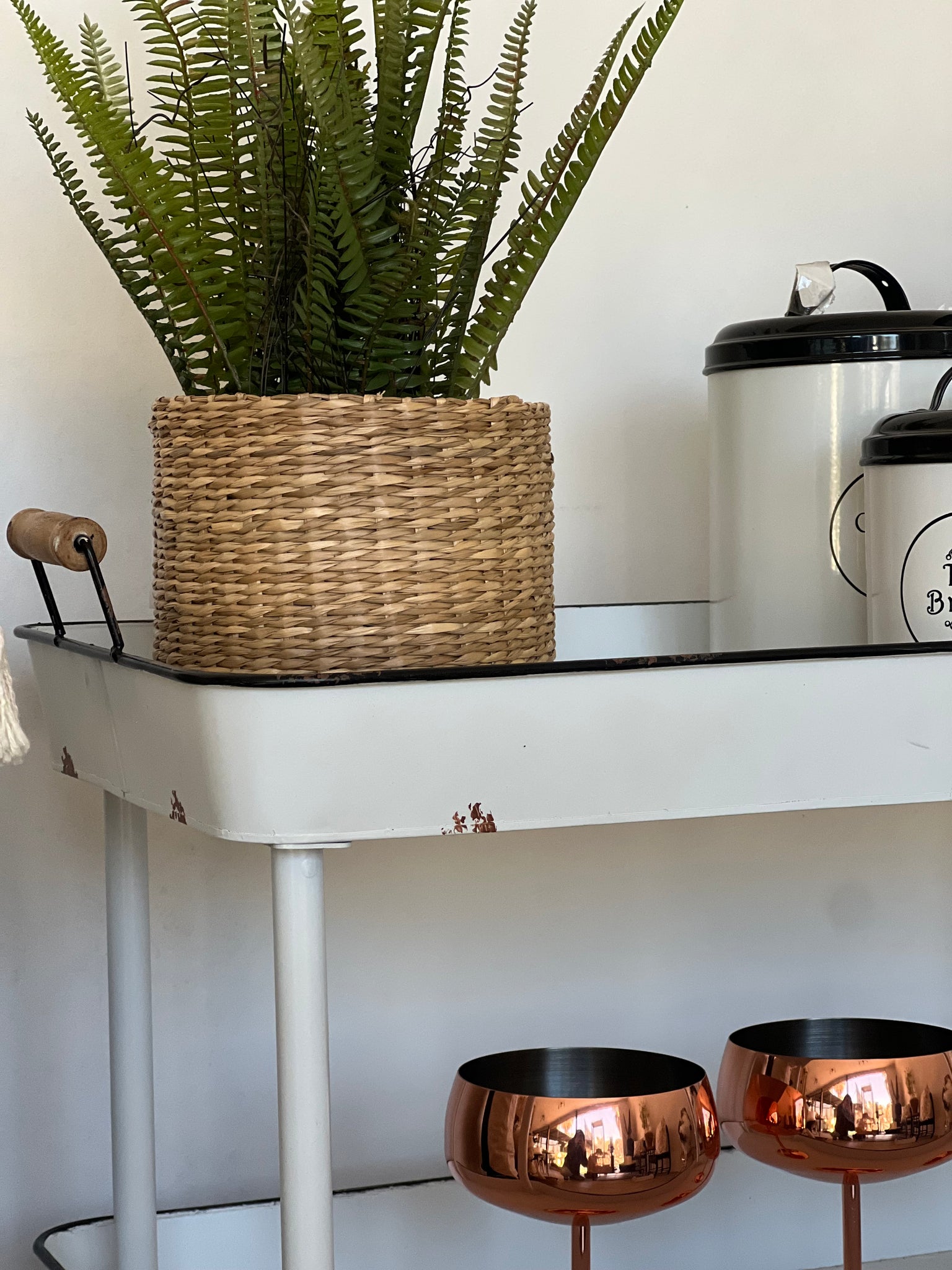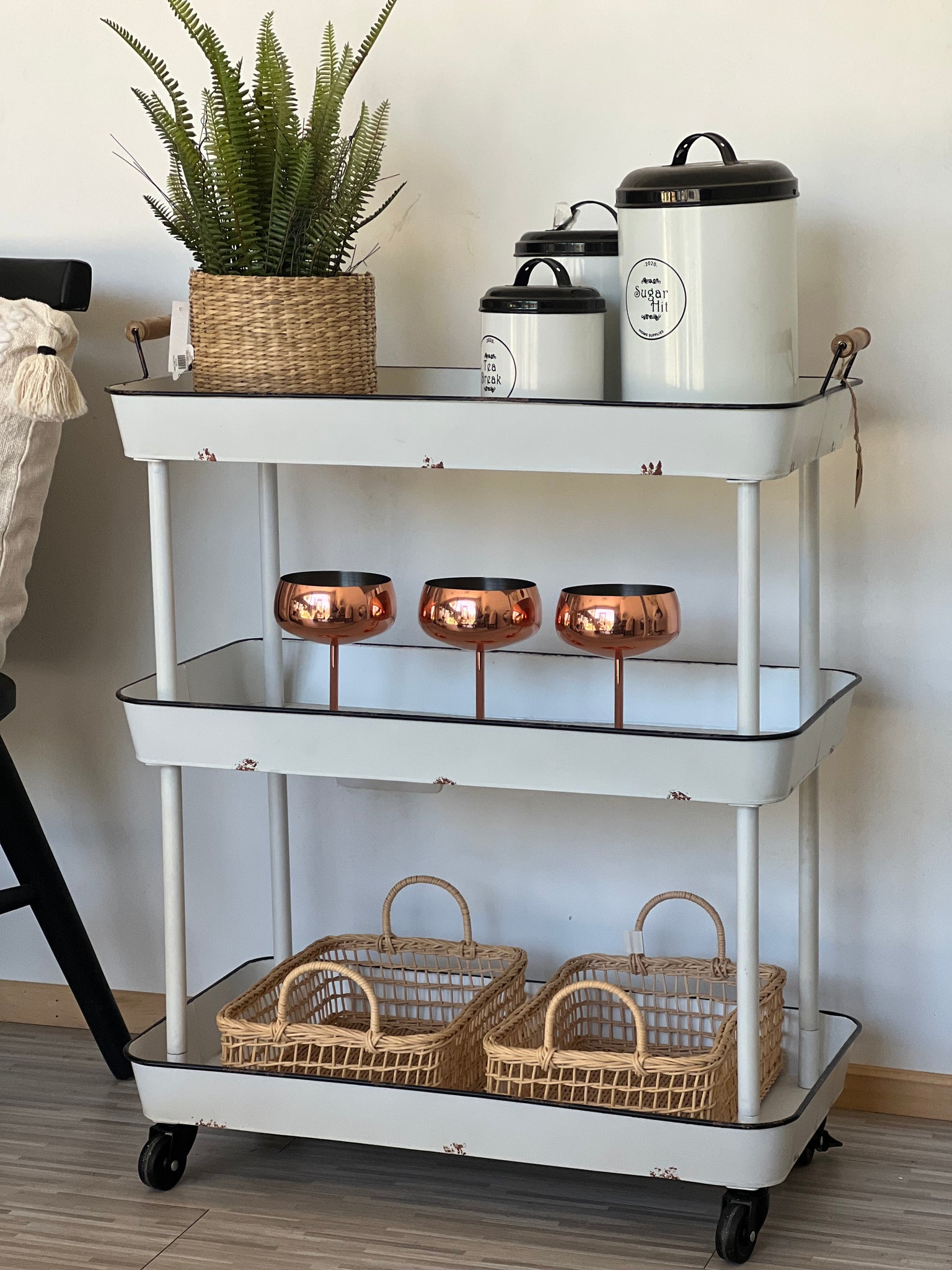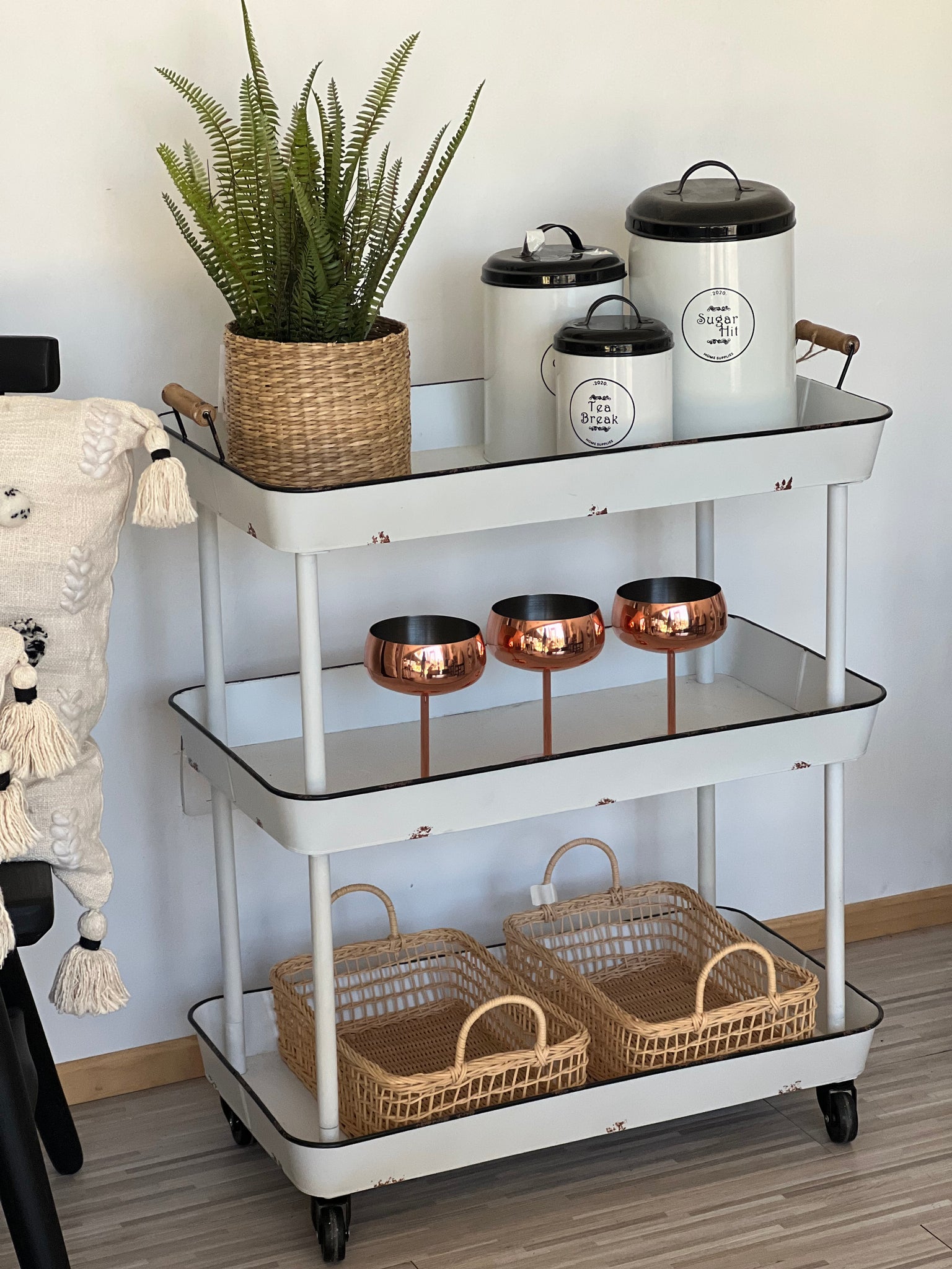 Un carro que amarás por la cantidad de funciones que le puedes dar. Hecho de latón en un brillante color blanco con bordes negros. Con 3 repisas para que lo uses como más te guste.