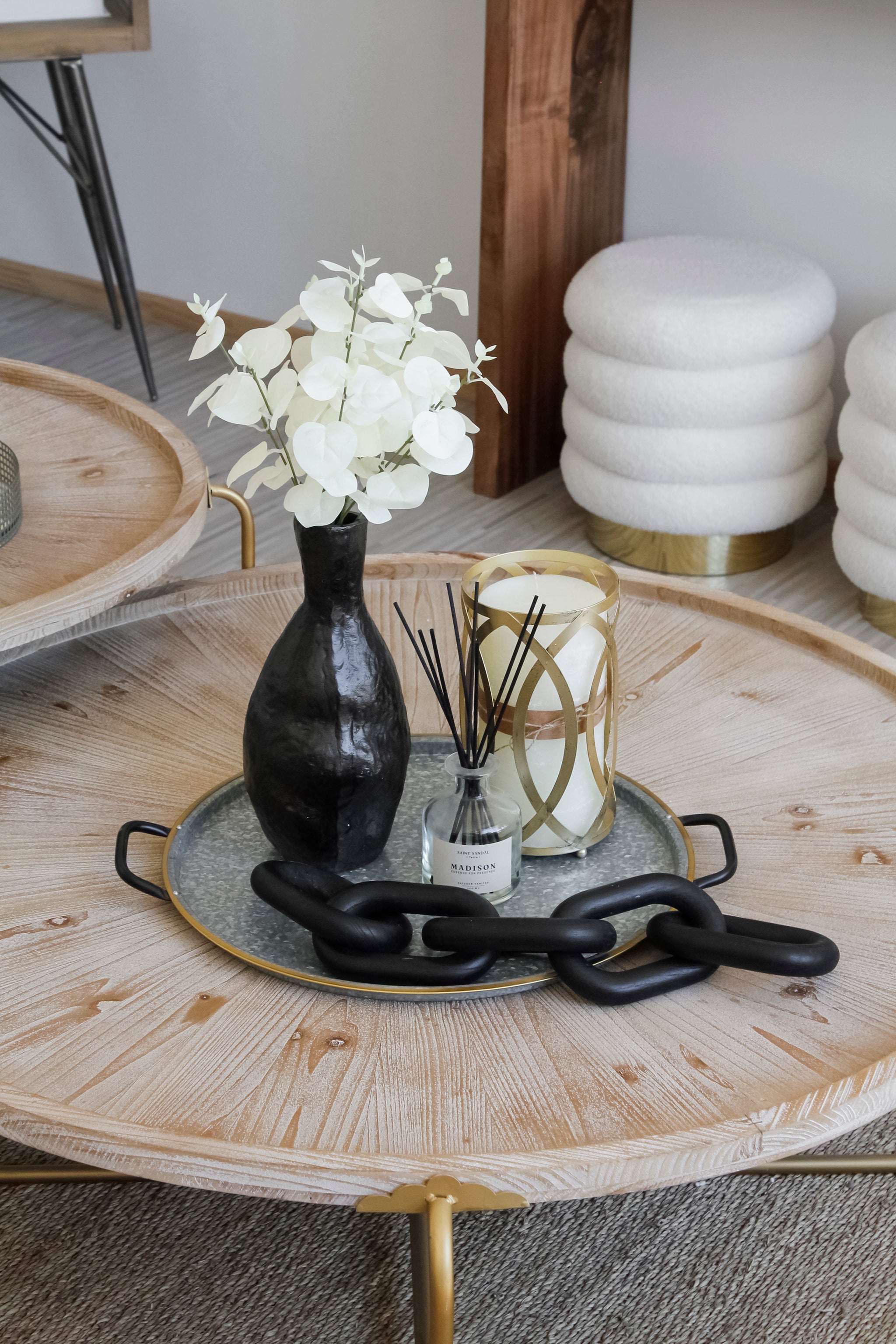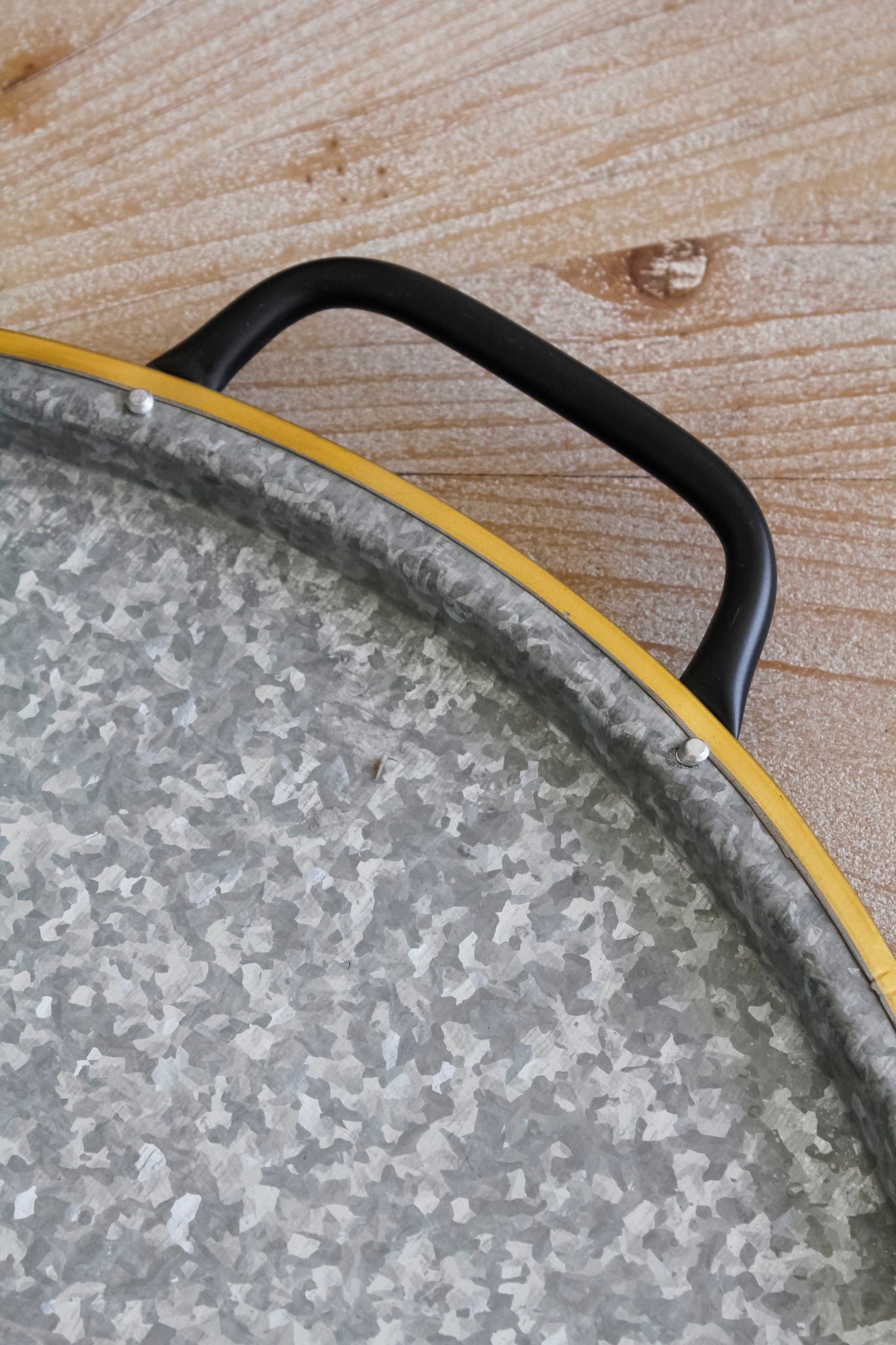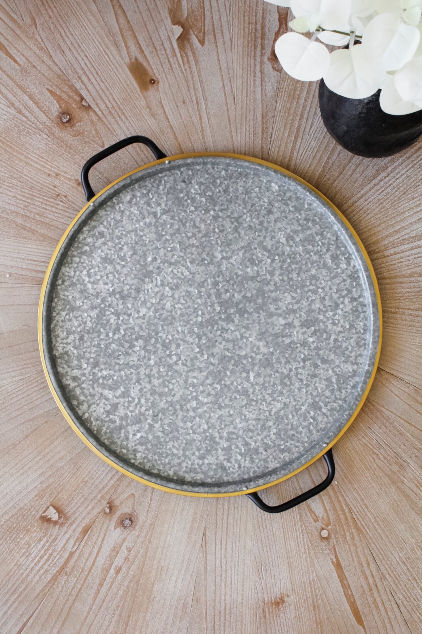 Bandeja circular de metal galvanizada con mangos negros. Esta maravillosa bandeja es perfecta para agregarle ese toque rústico e industrial a tu hogar.