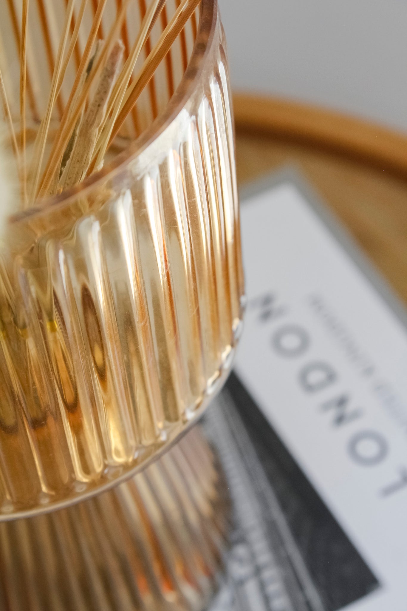 Florero copón rayas ámbar. Hecho de vidrio texturizado con rayas en todo su cuerpo. Se presenta en una estructura moderna para un look más elegante y distinto. Ideal para darle un toque especial y delicado a tus flores. Su elegante color contrastará con los colores de lo que montes.